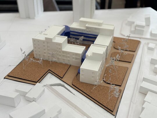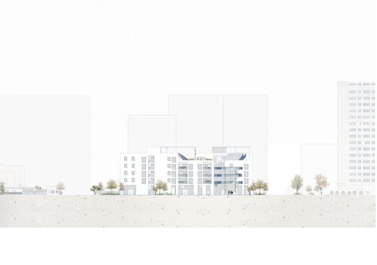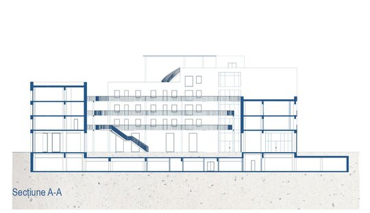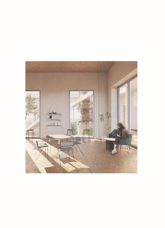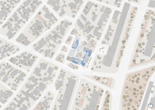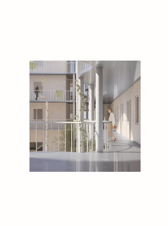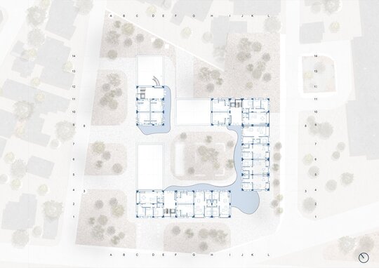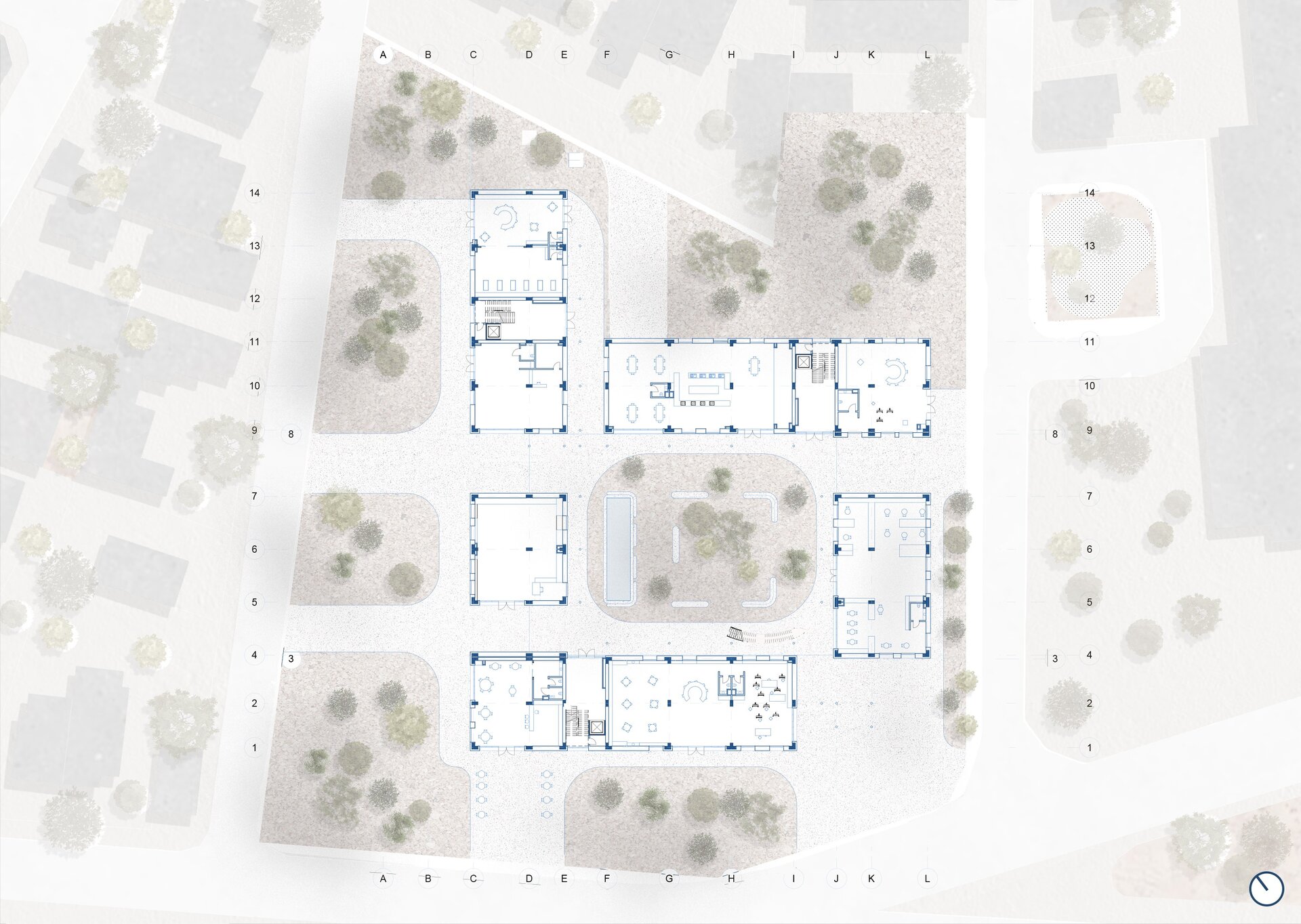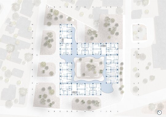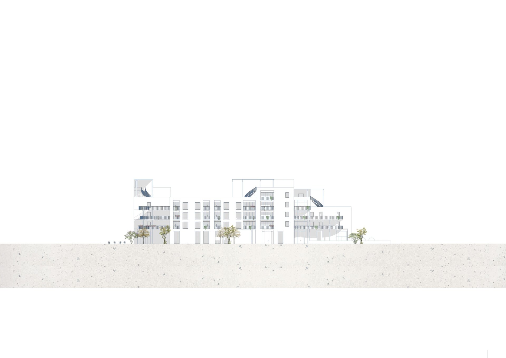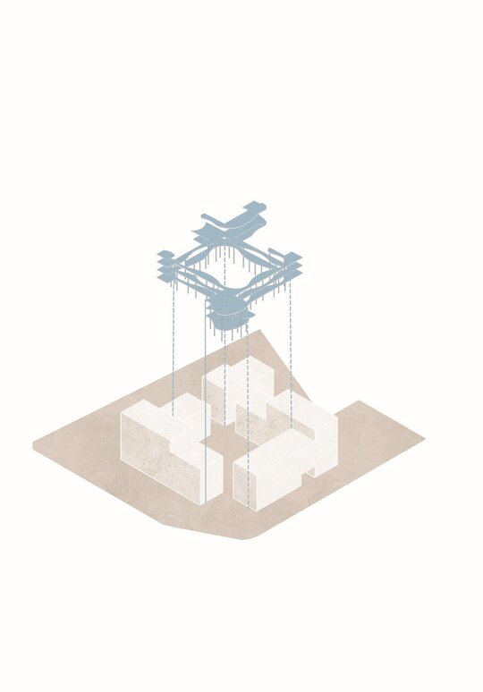 Propunerea constă în trei corpuri individuale, dispuse in jurul unei curți. Acestea sunt legate între ele prin intermediul unei cursive. Am optat pentru o formă organică a cursivei pentru a genera spații de întâlnire, de repaus, ca să creăm posibilități pentru o multitudine de scenarii de utilizare. Aceasta reprezintă în acest fel o extindere a apartamentelor spre spațiul exterior. Cursivele sunt diferite de la un etaj la altul, sunt decalate, formându-se astfel un dialog între niveluri, acestea fiind mai mult decât un simplu spațiu de trecere.