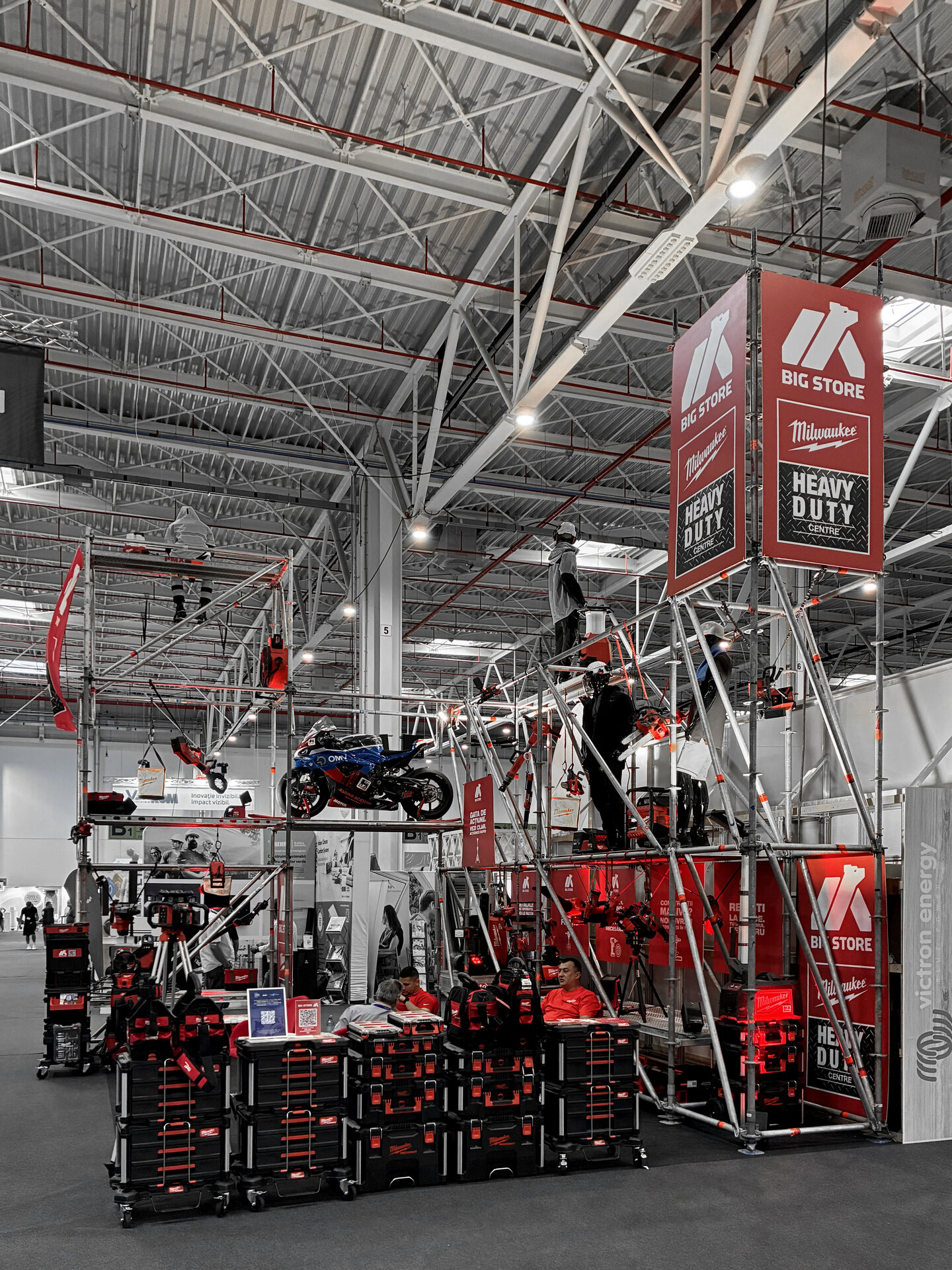 Manechine, ghiozdane și lămpi cu acumulator printre nave spațiale din unelte “havy duty” suspendate între țevi cu guler.