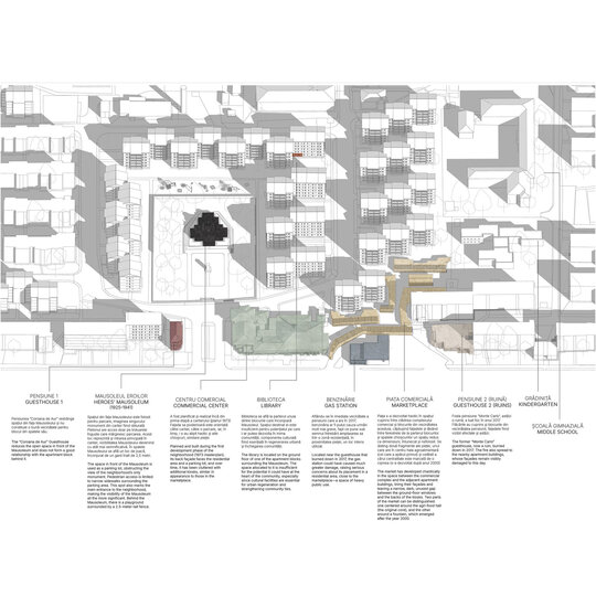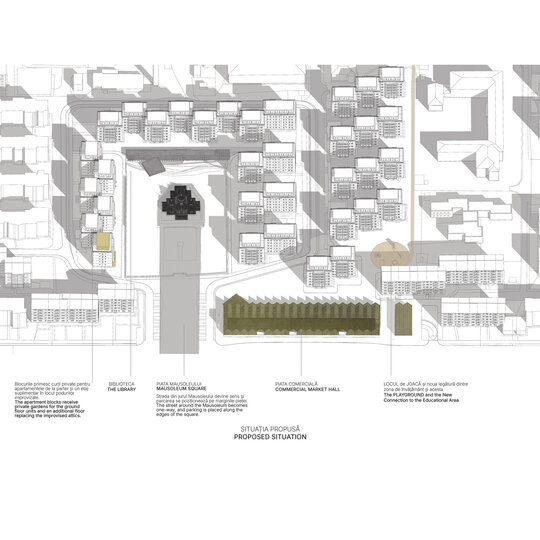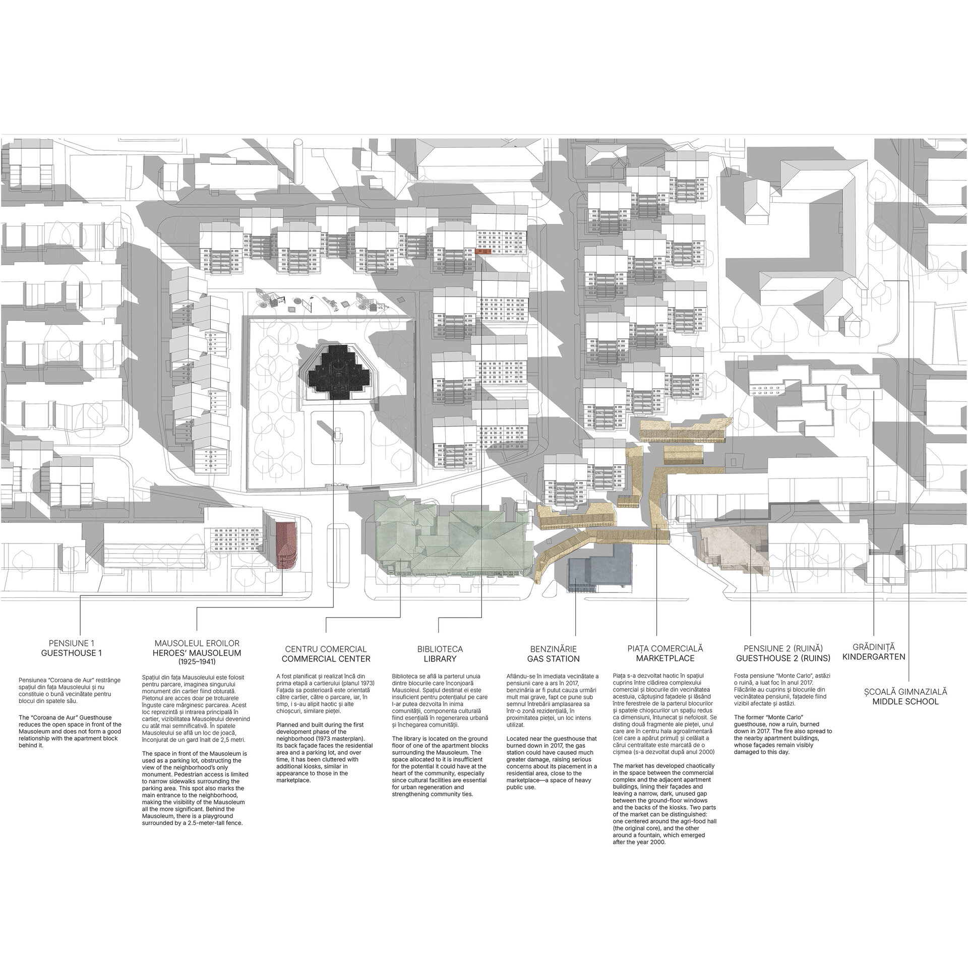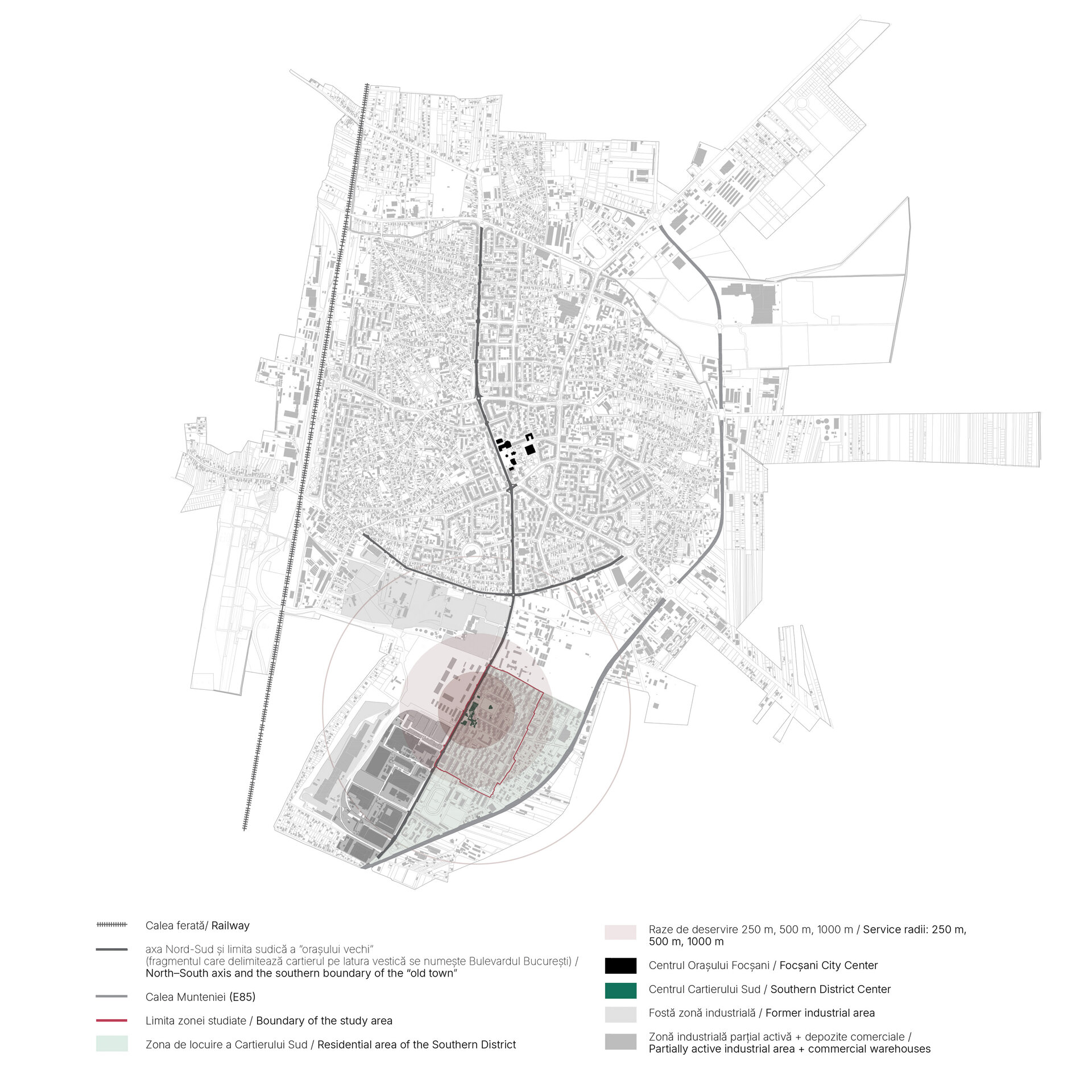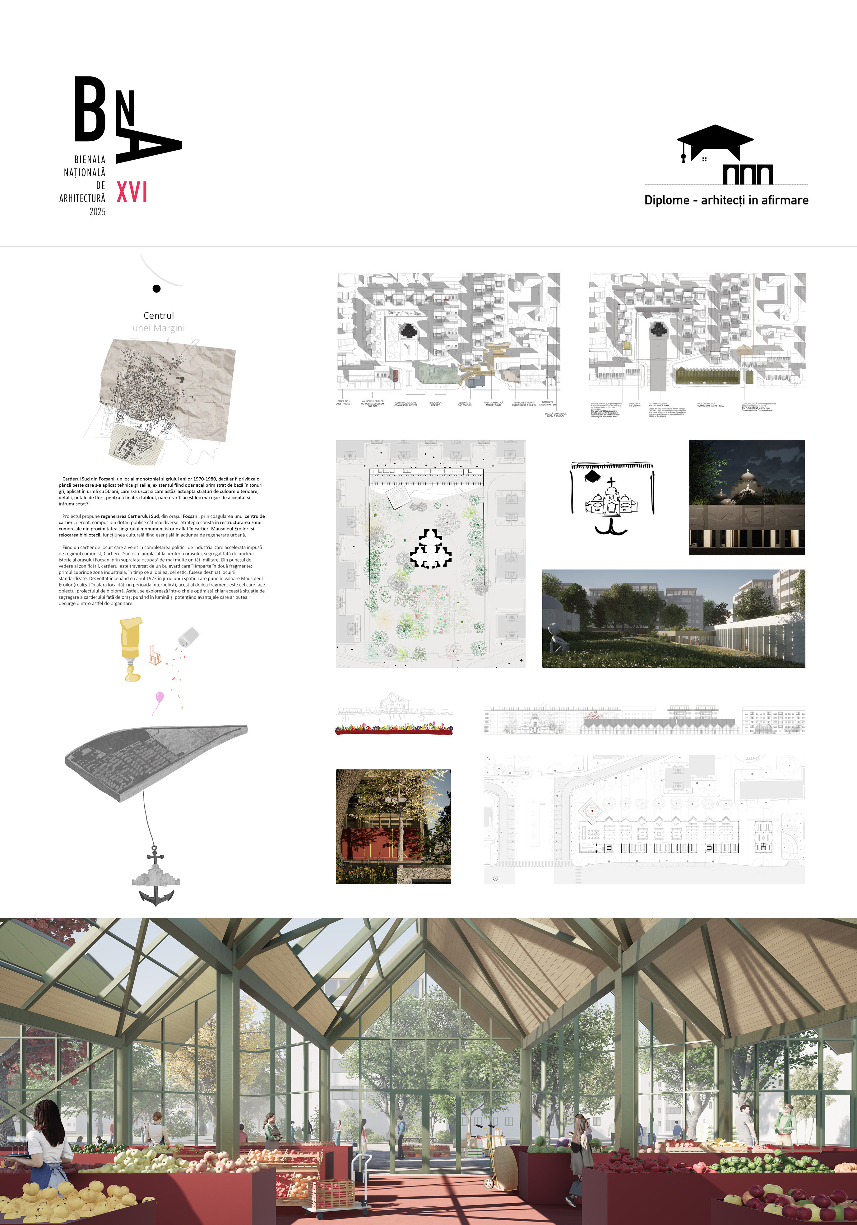 Proiectul propune regenerarea Cartierului Sud, din orașul Focșani, prin coagularea unui centru de cartier coerent, compus din dotări publice cât mai diverse. Strategia constă în restructurarea zonei comerciale din proximitatea singurului monument istoric aflat în cartier -Mausoleul Eroilor- și relocarea bibliotecii, funcțiunea culturală fiind esențială în acțiunea de regenerare urbană. Fiind un cartier de locuit care a venit în completarea politicii de industrializare accelerată impusă de regimul comunist, Cartierul Sud este amplasat la periferia orașului, segregat față de nucleul istoric al orașului Focșani prin suprafața ocupată de mai multe unități militare. Din punctul de vedere al zonificării, cartierul este traversat de un bulevard care îl împarte în două fragmente: primul cuprinde zona industrială, în timp ce al doilea, cel estic, fusese destinat locuirii standardizate. Dezvoltat începând cu anul 1973 în jurul unui spațiu care pune în valoare Mausoleul Eroilor (realizat în afara localității în perioada interbelică), acest al doilea fragment este cel care face obiectul proiectului de diplomă. Astfel, se explorează într-o cheie optimistă chiar această situație de segregare a cartierului față de oraș, punând în lumină și potențând avantajele care ar putea decurge dintr-o astfel de organizare.