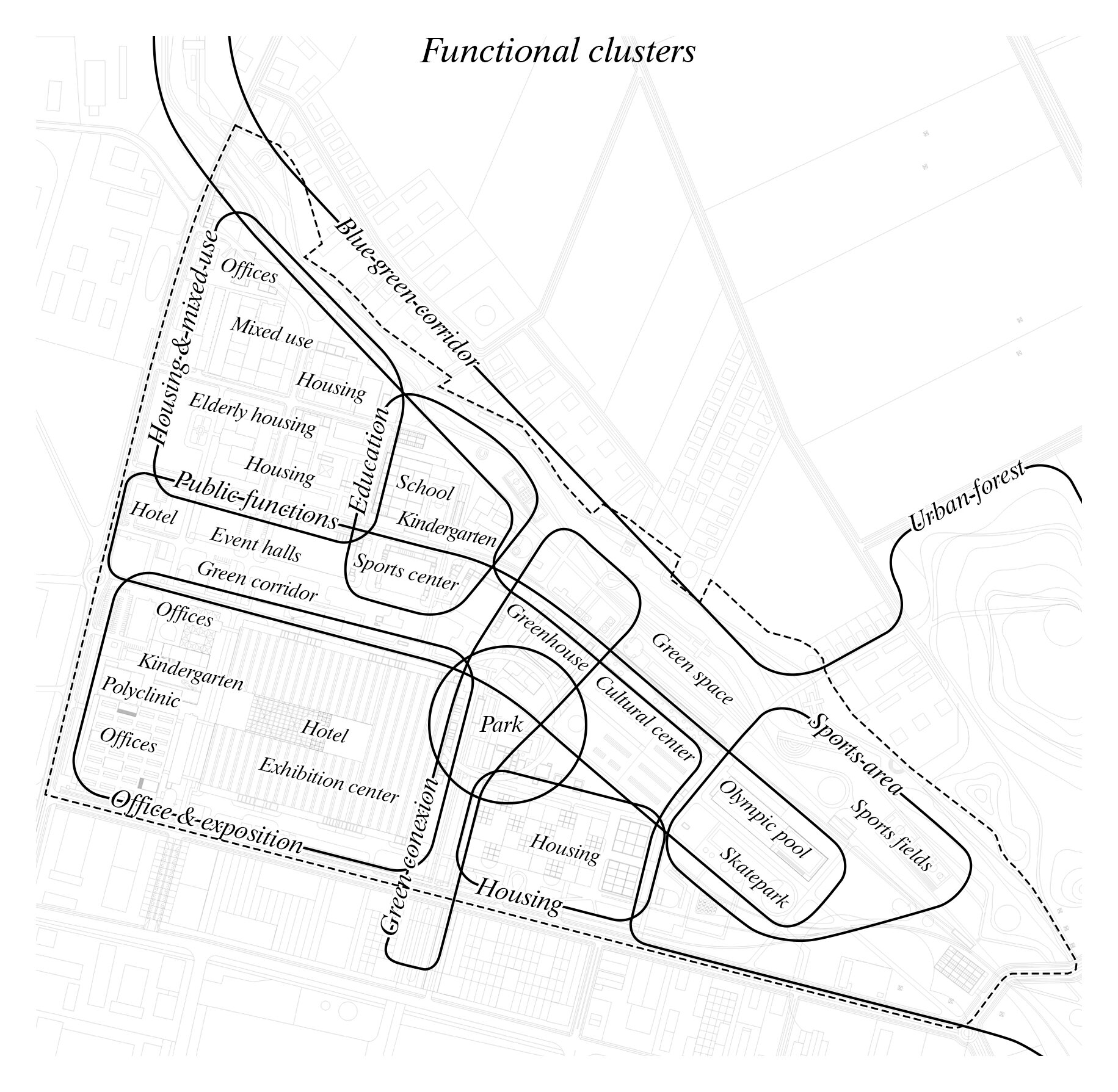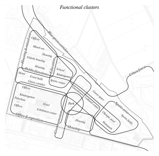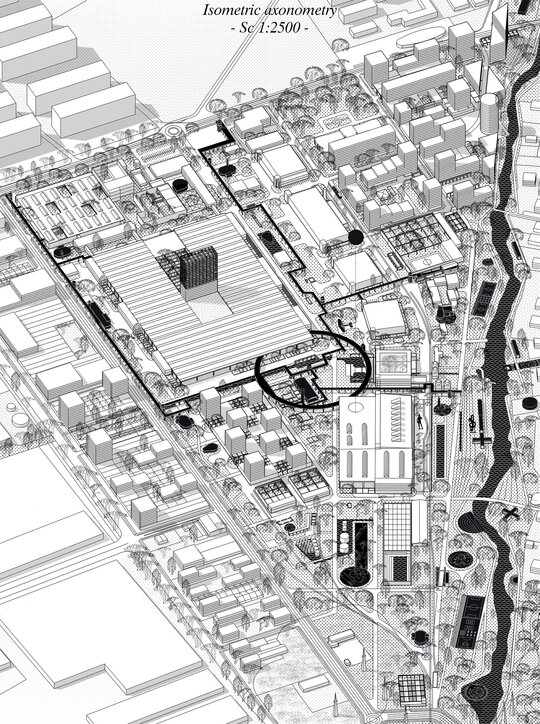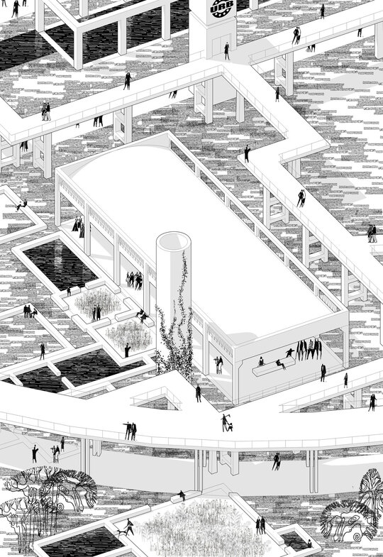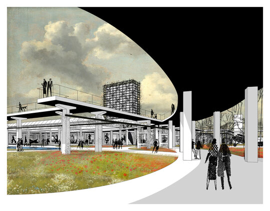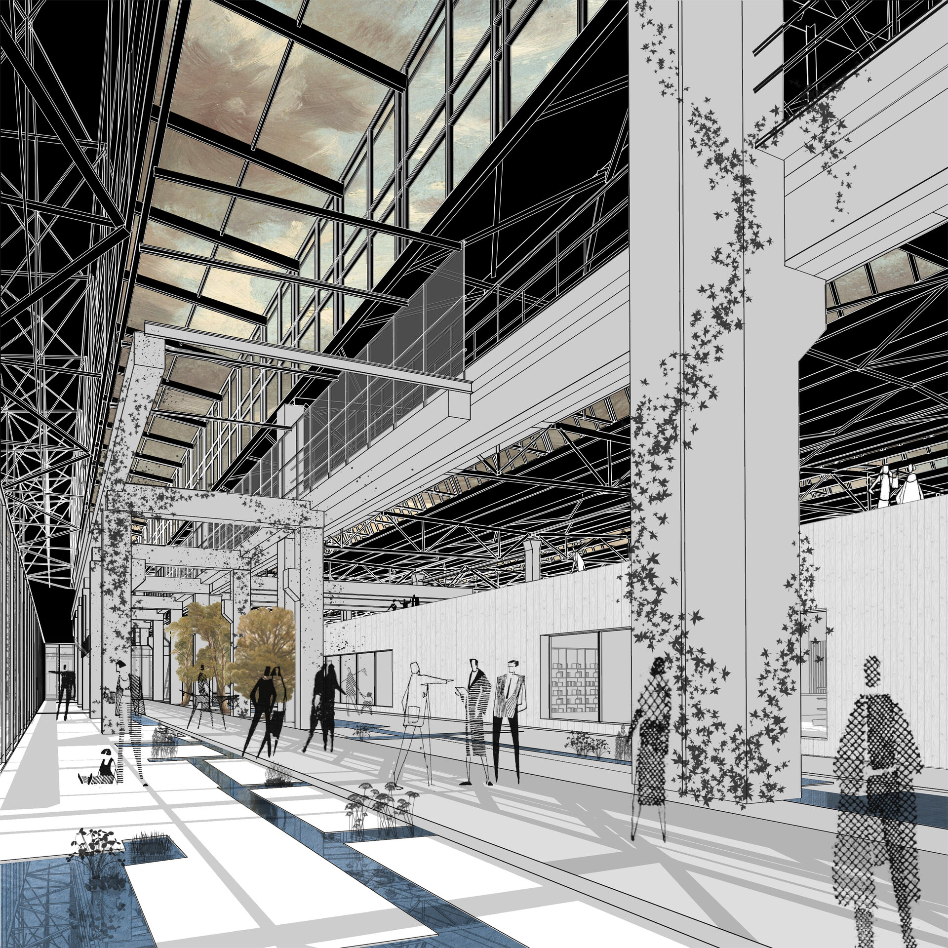 Urmele fostului design al spațiului public au fost readuse la viață într-un colaj de istorii, șinele au devenit poteci, noile pavilioane presărate în peisaj creează noduri de activitate și puncte de interes, combinând trecutul cu prezentul, generând un cadru pentru viitor. Pentru un design incluziv în natură, a fost propusă o viziune holistică de combinare a arhitecturii cu peisajul, clădirile ca parte a ecosistemului urban. Fiecare clădire poate prelua rolul unei stânci, al unui deal împădurit, al unui câmp sau chiar al unei păduri, în funcție de înălțimea, tipul sau fațada sa.