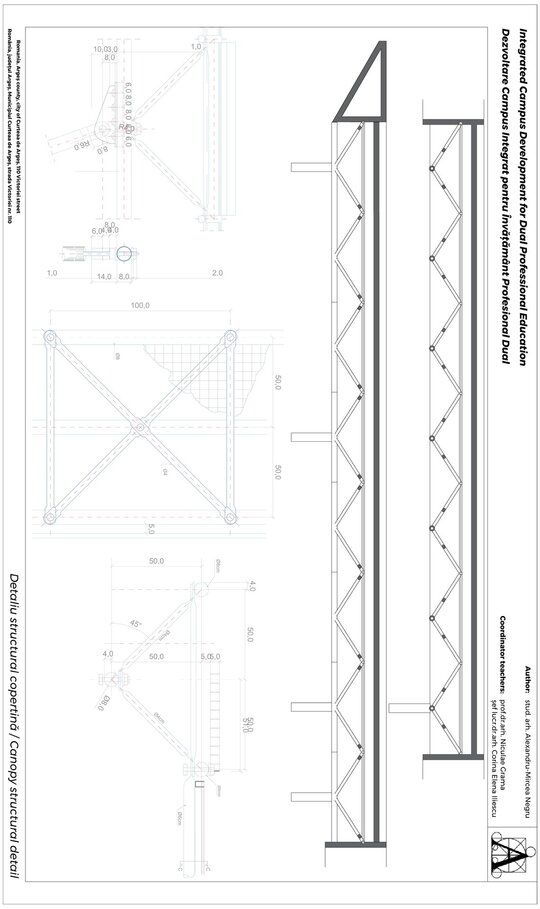 Copertina este proiectată ca o structură metalică tridimensională care acoperă și unește toate corpurile campusului. Aceasta nu doar protejează și conectează clădirile, dar simbolizează și unitatea și coerența educației oferite în acest campus. Formele geometrice ale copertinei reflectă dinamismul și evoluția continuă a învățământului profesional, sugerând o protecție și ghidare a elevilor pe parcursul lor educațional.