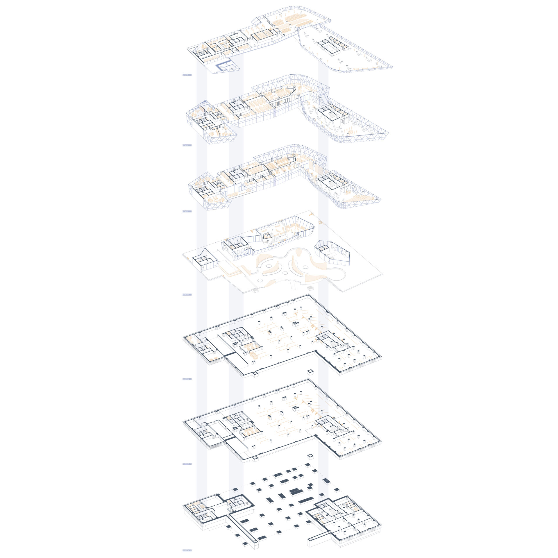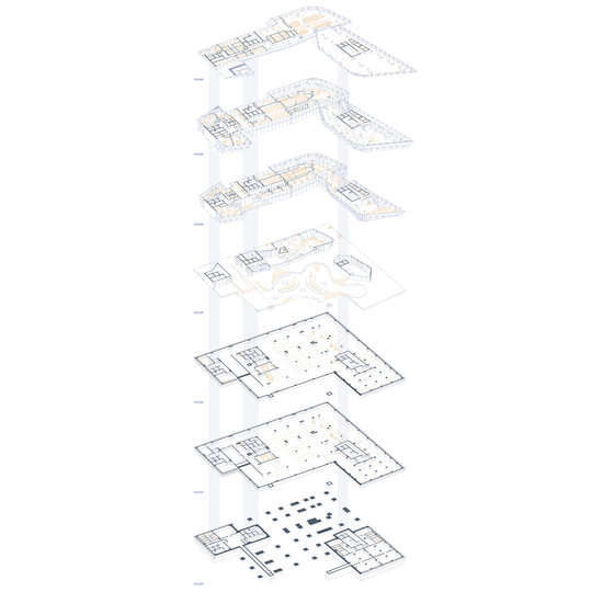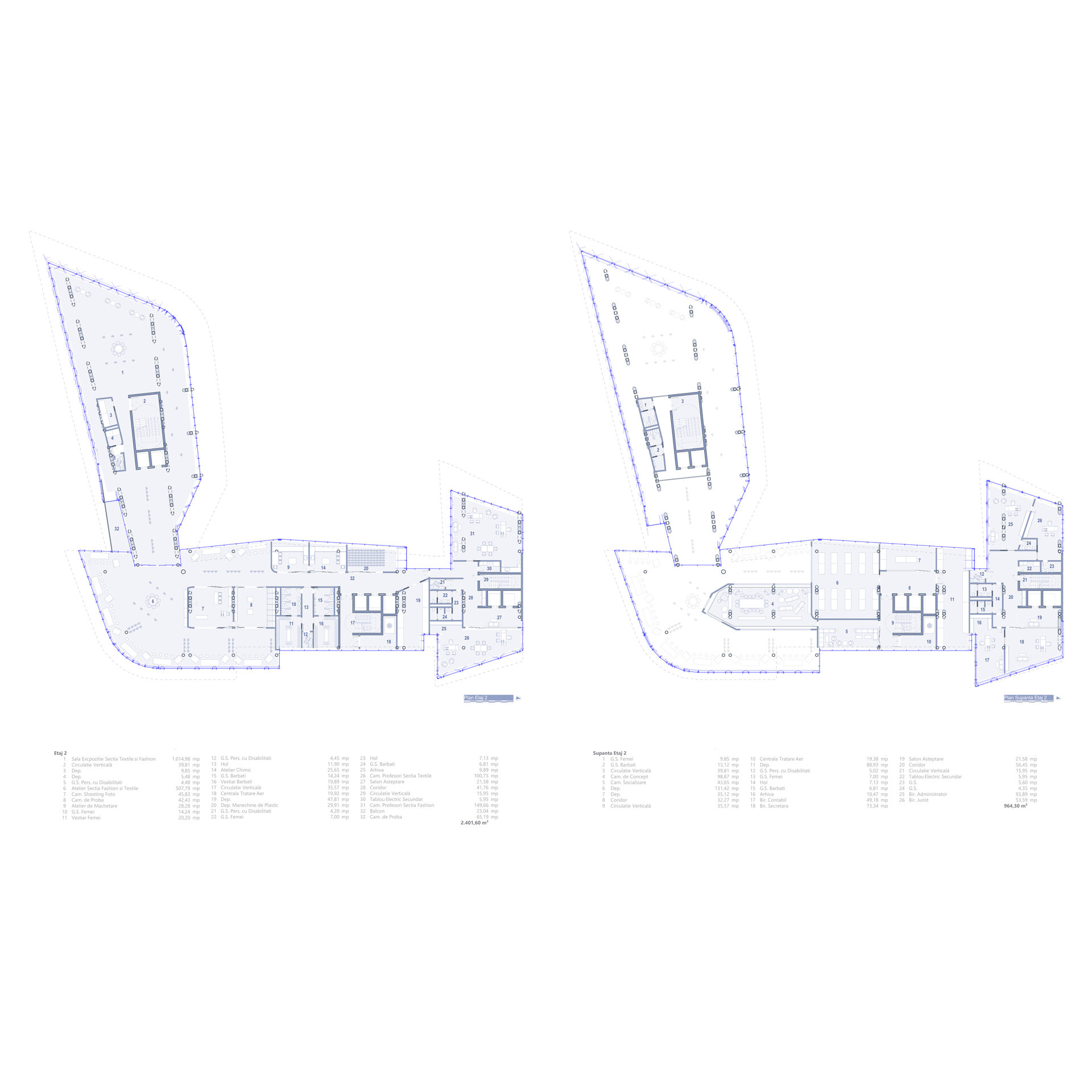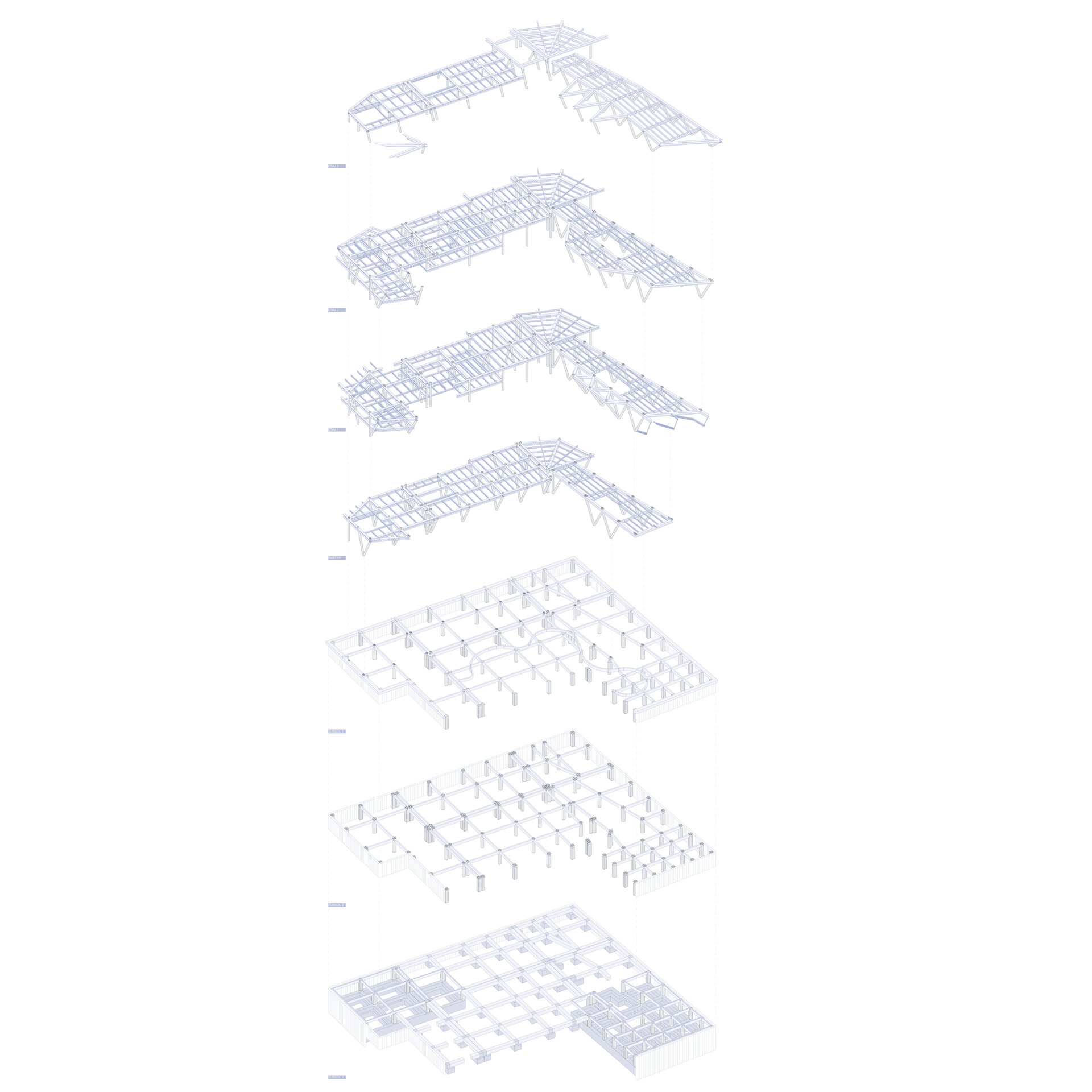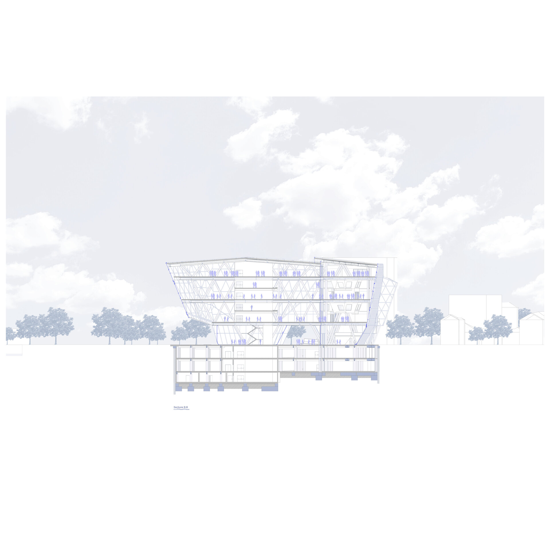 Planșeul este de tip ușor, format din tablă cutată susținută de o structură secundară din grinzi IPE 300. Datorită amprentei extinse a clădirii, proiectul prevede trei rosturi de dilatare, asigurând comportamentul corespunzător al structurii în exploatare.
