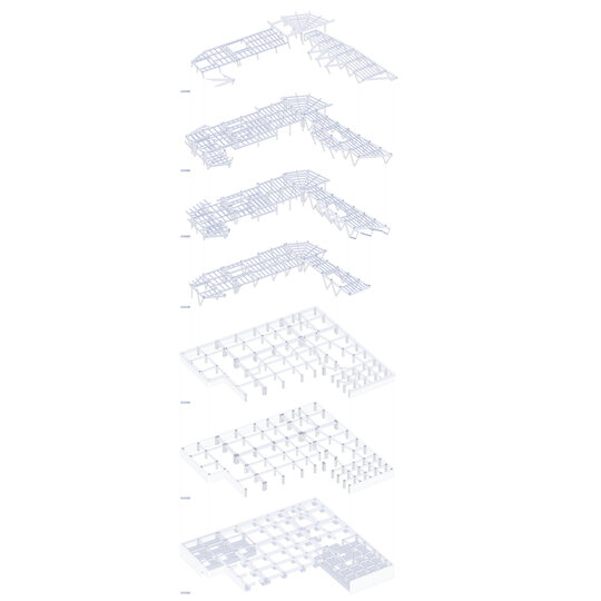 Programul funcțional impune suprafețe ample și înălțimi mari, ceea ce a condus la adoptarea unei soluții structurale ușoare, dar capabile să asigure deschideri considerabile. Structura este realizată din elemente metalice: stâlpi metalici rotunzi cu inimă goală ( diametru 50 cm, grosime 5 cm), legați transversal prin grinzi ajurate cu înălțimea de 70 cm. Alegerea grinzilor ajurate permite integrarea conductelor de ventilație prin orificiile acestora, optimizând spațiul tehnic.
