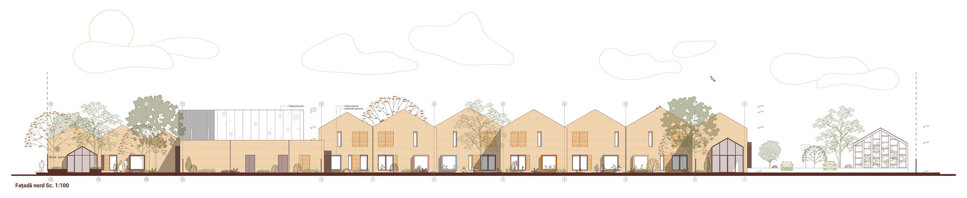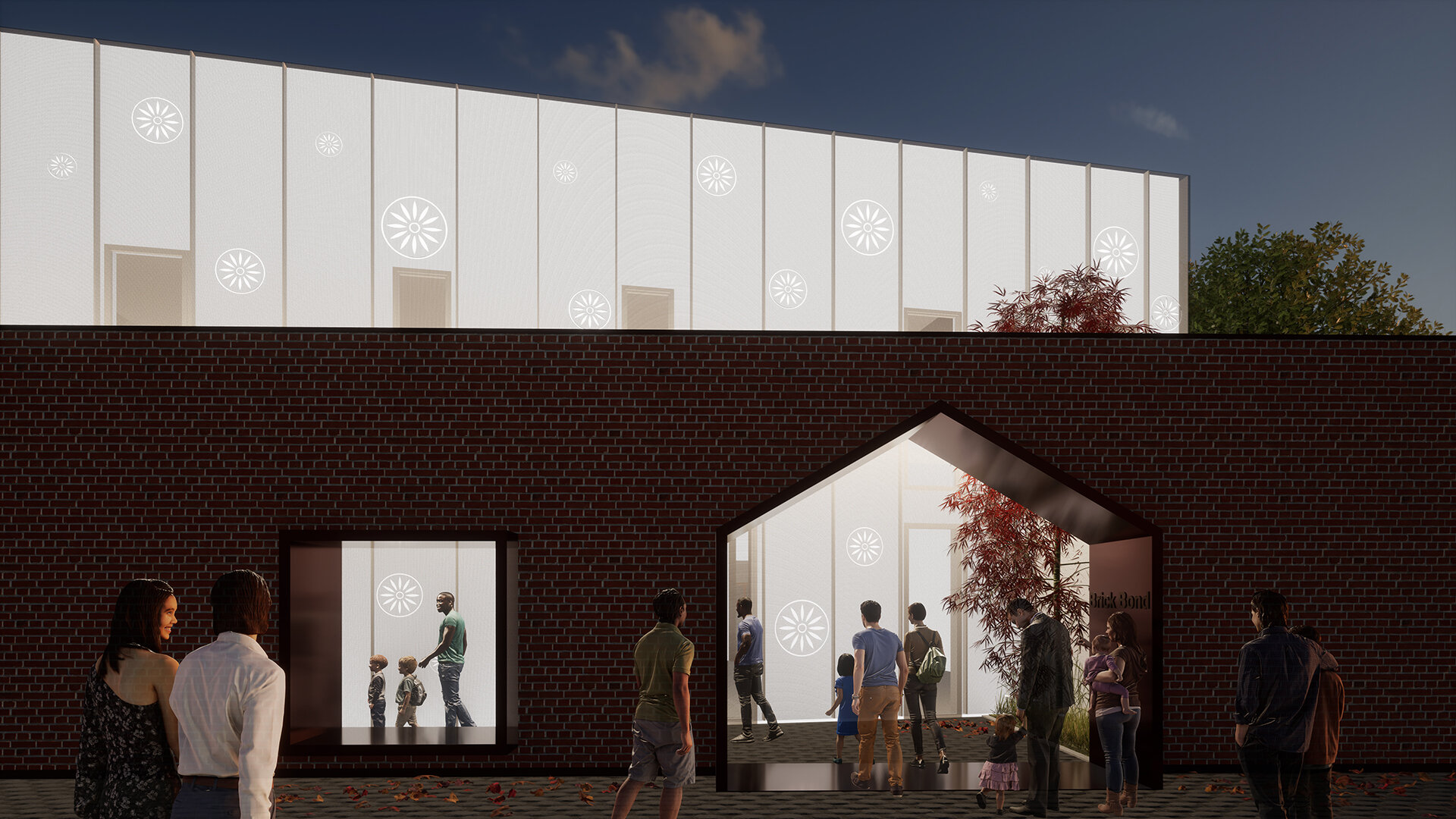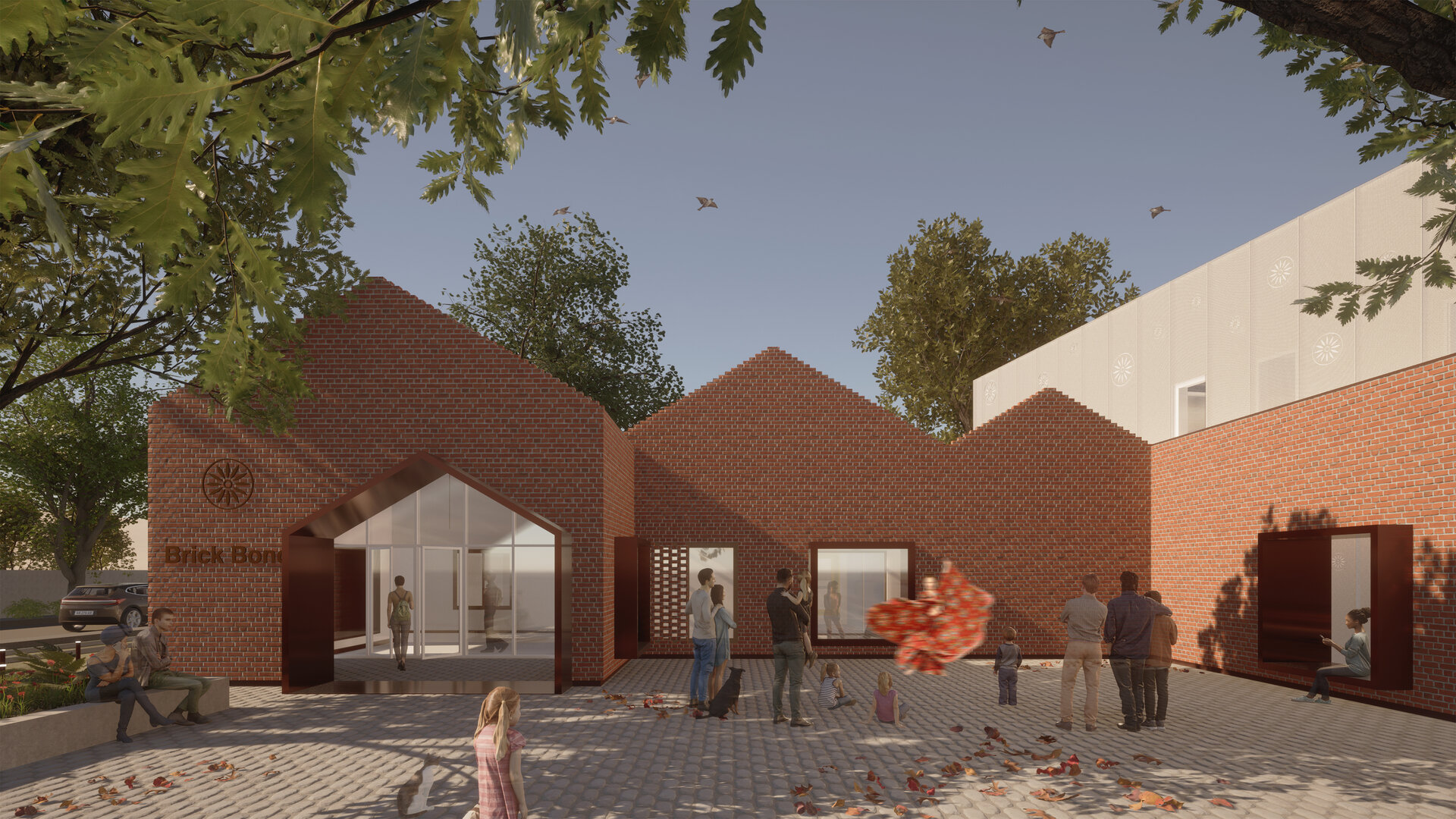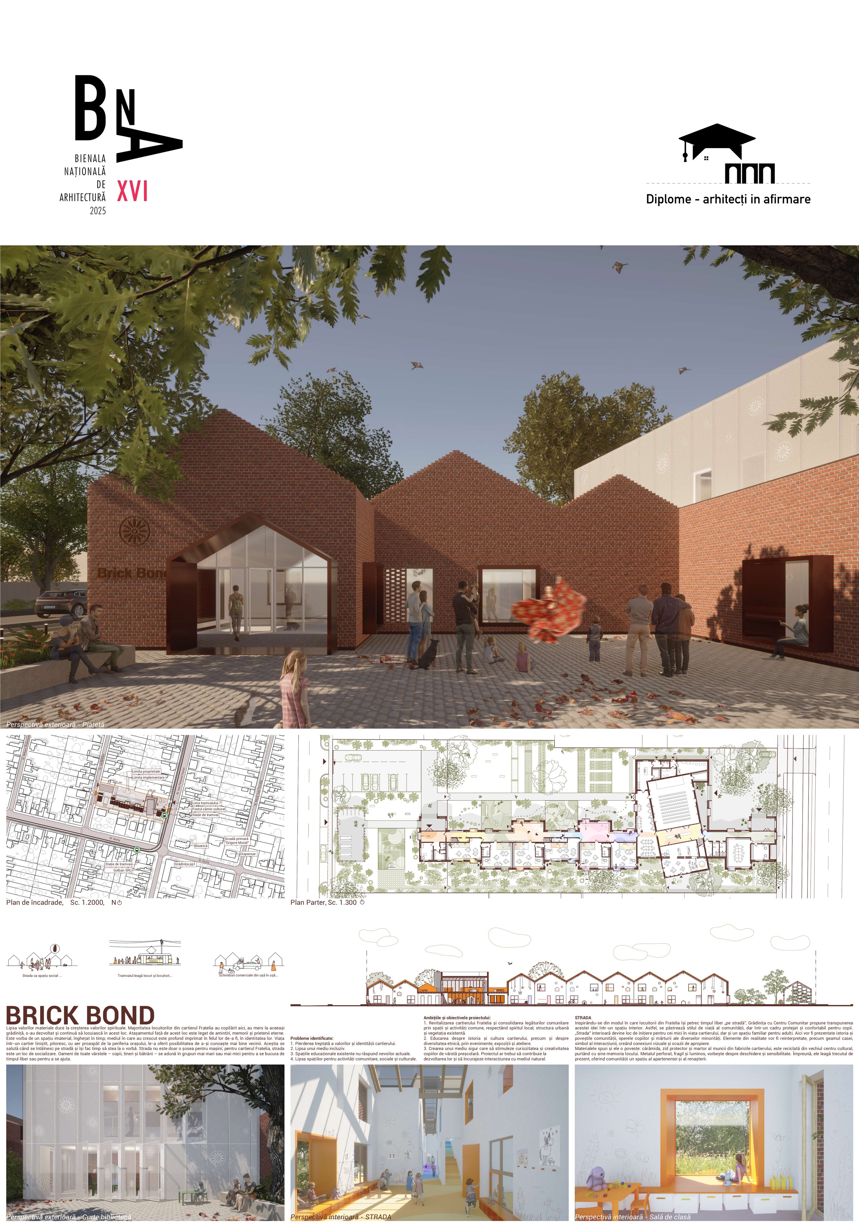 Proiectul Brick Bond răspunde pierderii identității și spiritului comunitar în cartierul Fratelia, Timișoara. Conceptul se bazează pe strada ca spațiu interior protejat, care unește oamenii. Sunt valorizate elemente locale precum geamul, băncuța și ușa casei, iar cărămida refolosită de la fostul cămin cultural devine un zid simbolic al continuității. Volumul rotit, care găzduiește biblioteca și spațiul multifuncțional, marchează istoria cartierului. Interiorul simplu, alb, oferă copiilor libertate de exprimare, în timp ce culoarea subliniază elementele-cheie, creând identitate pentru fiecare „căsuță”.