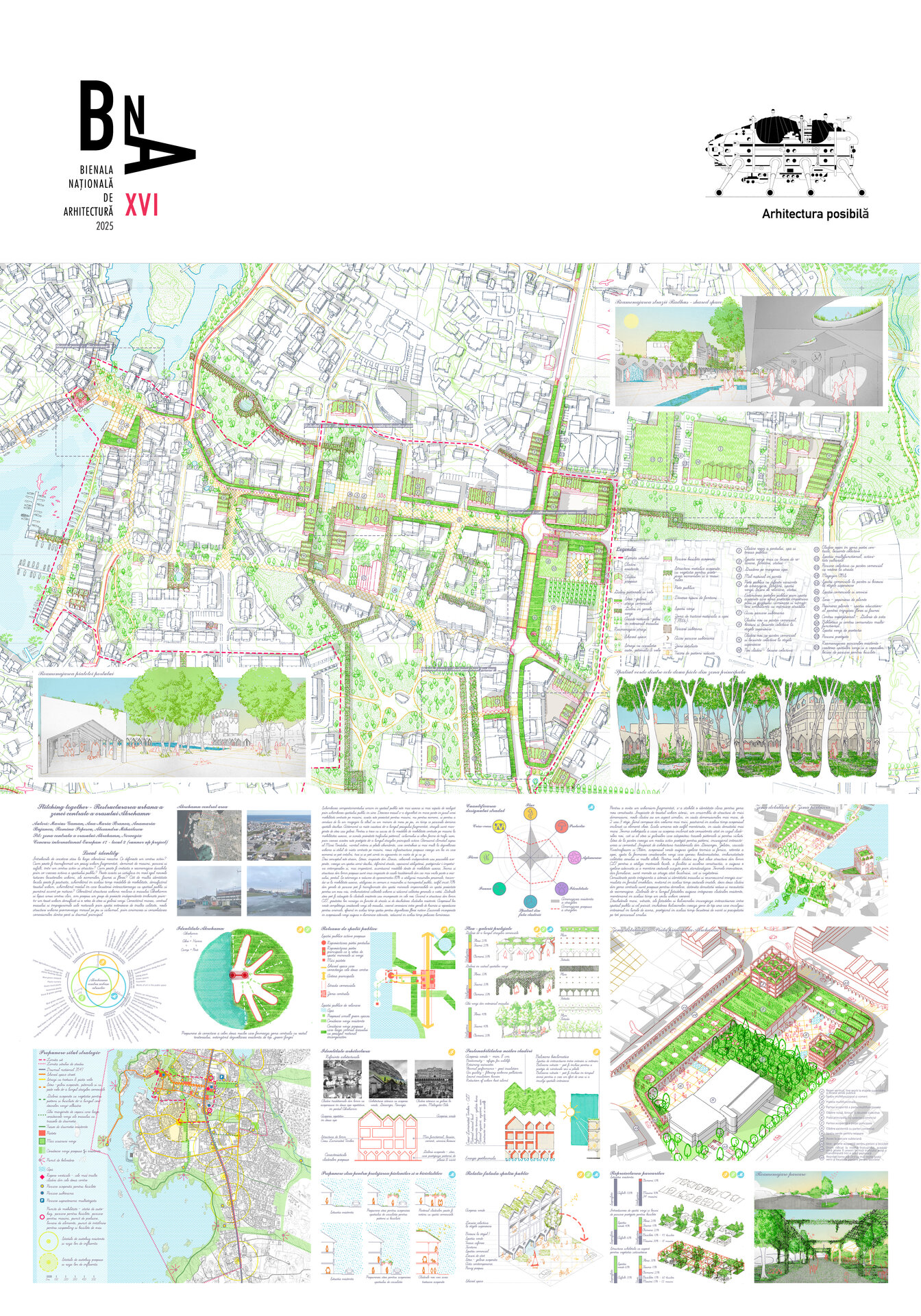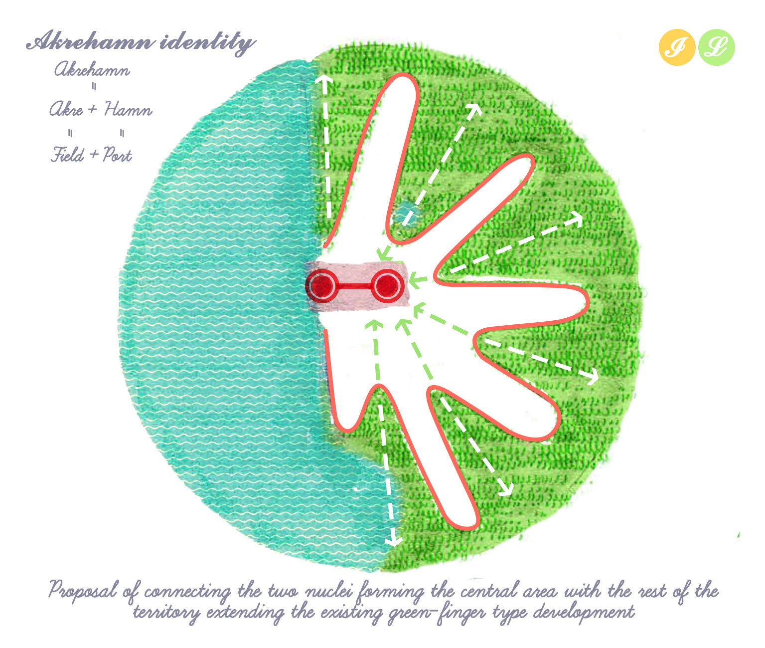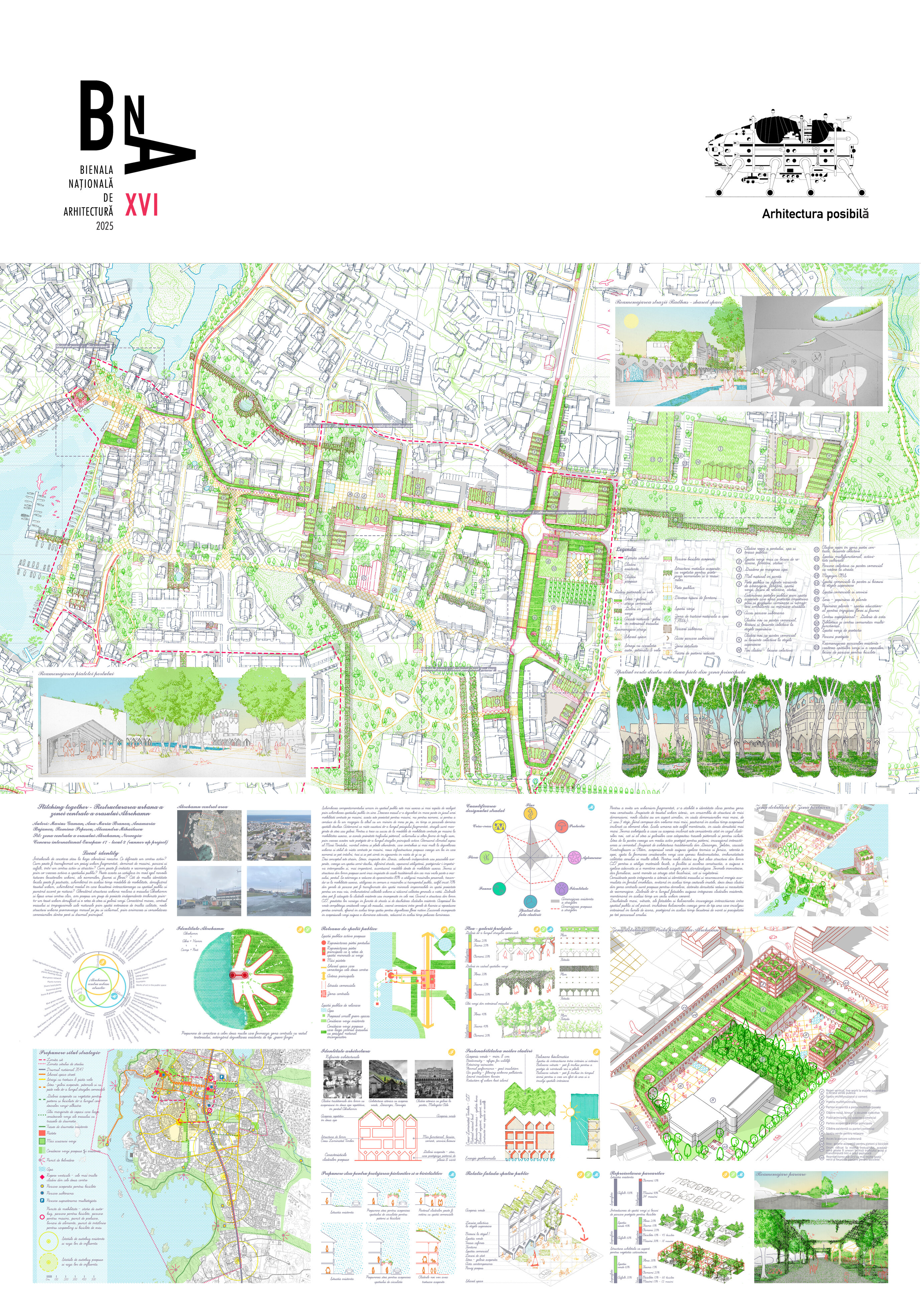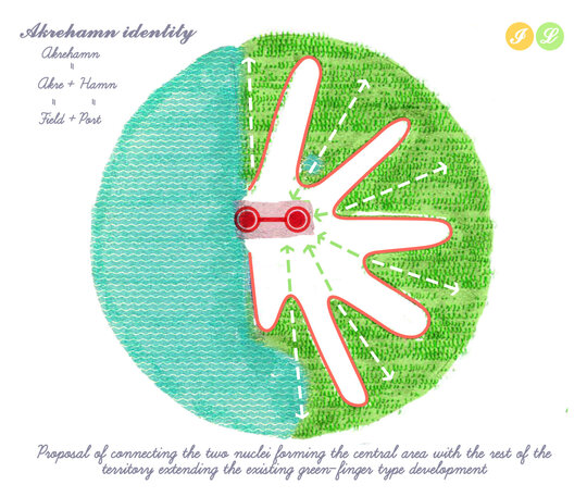 Abordarea restructurarii zonei centrale a orasului Akrehamn are la baza o serie de intrebari de cercetare. Ce defineste un centru activ? Cum poate fi transformat un peisaj urban fragmentat, dominat de masini, parcari si asfalt, într-un centru activ si atractiv? Cum poate fi initiata o reamenajare durabila prin co-crearea activa a spatiului public? Poate acesta sa satisfaca în mod egal nevoile tuturor locuitorilor urbani, ale oamenilor, faunei si florei? Cât de multa identitate locala poate fi pastrata, schimbând în acelasi timp modelele de mobilitate, densificând tesutul urban, schimbând modul în care locuitorii interactioneaza cu spatiul public si punând accent pe natura? Abordând structura urbana neclara a orasului Åkrehamn si lipsa unui centru clar, am propus un grup de proiecte independente îmbinate printr-un tesut urban densificat si o retea de stoa si galerii verzi. Conectând marea, centrul orasului si împrejurimile sale naturale prin spatii exterioare de înalta calitate, noile structuri urbane promoveaza mersul pe jos si ciclismul, prin animarea si consolidarea conexiunilor dintre port si drumul principal.