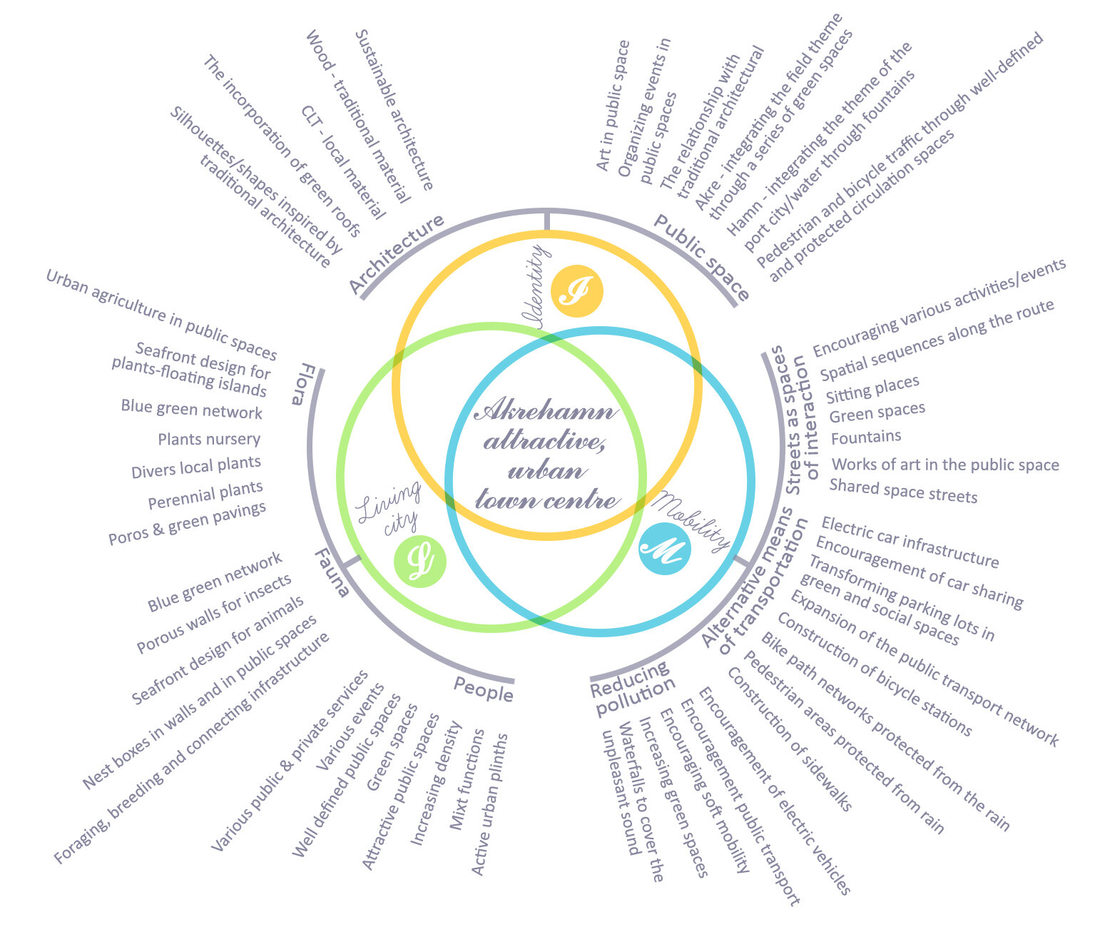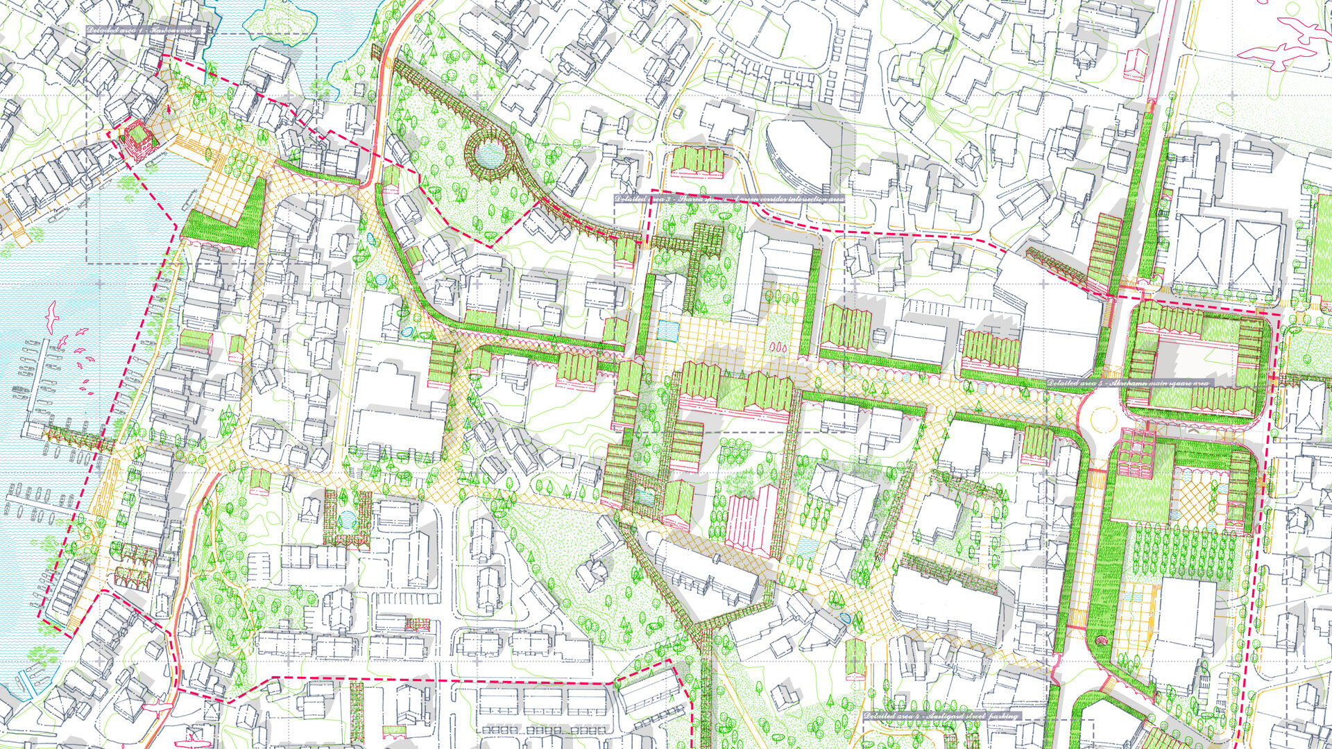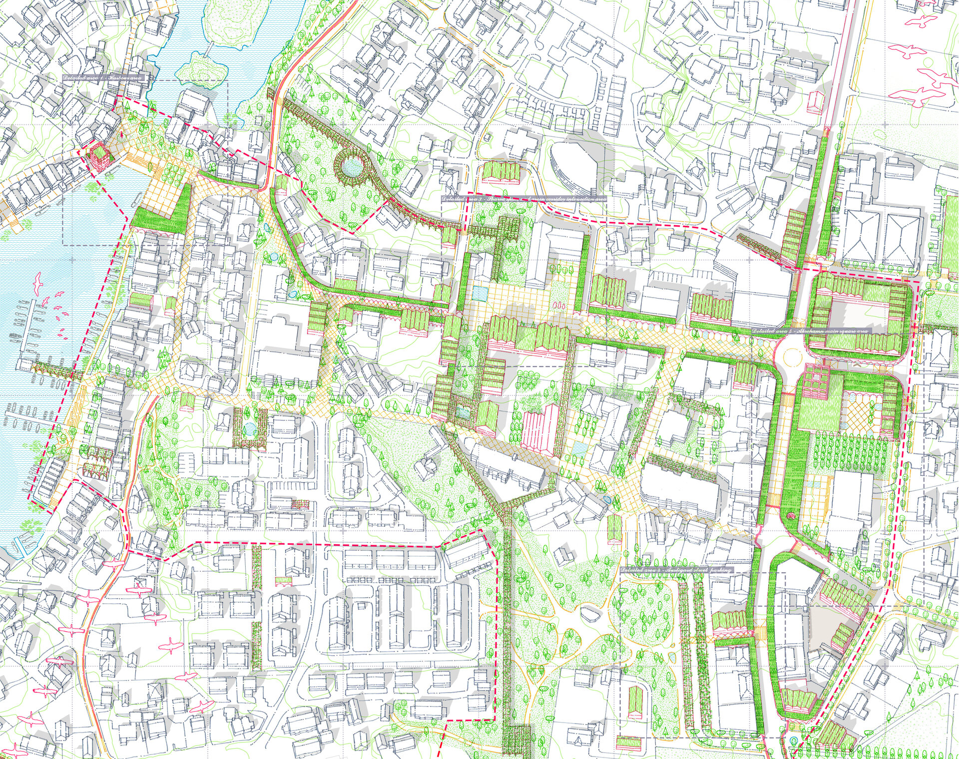 Abordarea restructurarii zonei centrale a orasului Akrehamn are la baza o serie de intrebari de cercetare. Ce defineste un centru activ? Cum poate fi transformat un peisaj urban fragmentat, dominat de masini, parcari si asfalt, într-un centru activ si atractiv? Cum poate fi initiata o reamenajare durabila prin co-crearea activa a spatiului public? Poate acesta sa satisfaca în mod egal nevoile tuturor locuitorilor urbani, ale oamenilor, faunei si florei? Cât de multa identitate locala poate fi pastrata, schimbând în acelasi timp modelele de mobilitate, densificând tesutul urban, schimbând modul în care locuitorii interactioneaza cu spatiul public si punând accent pe natura? Abordând structura urbana neclara a orasului Åkrehamn si lipsa unui centru clar, am propus un grup de proiecte independente îmbinate printr-un tesut urban densificat si o retea de stoa si galerii verzi. Conectând marea, centrul orasului si împrejurimile sale naturale prin spatii exterioare de înalta calitate, noile structuri urbane promoveaza mersul pe jos si ciclismul, prin animarea si consolidarea conexiunilor dintre port si drumul principal.
