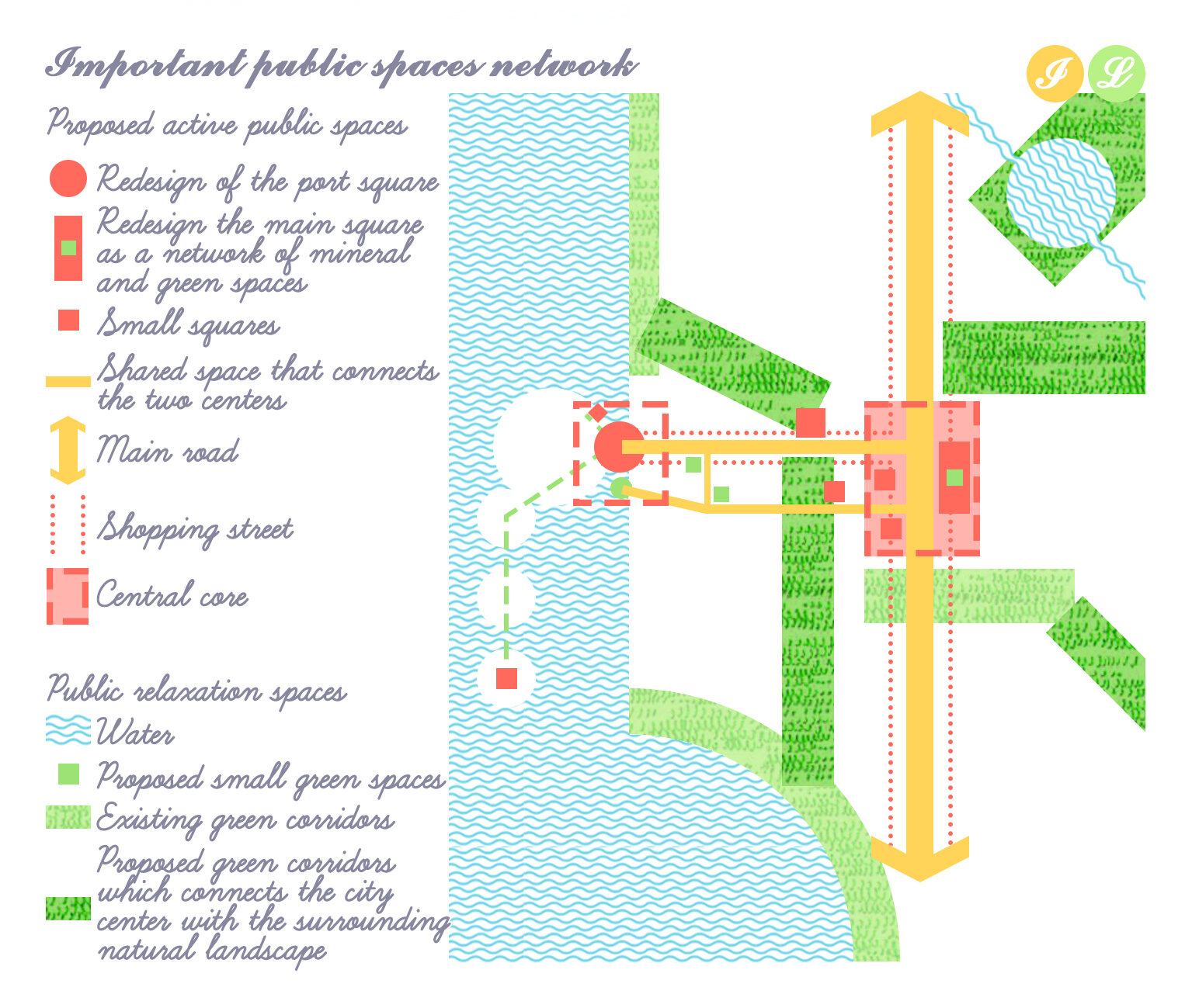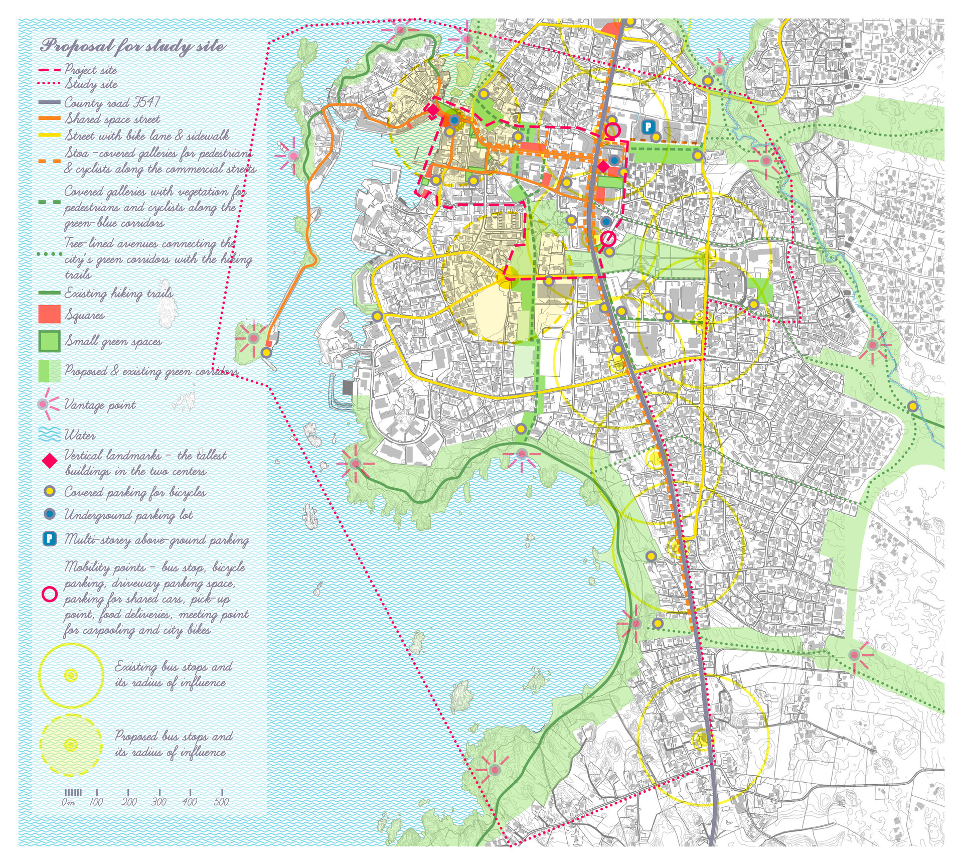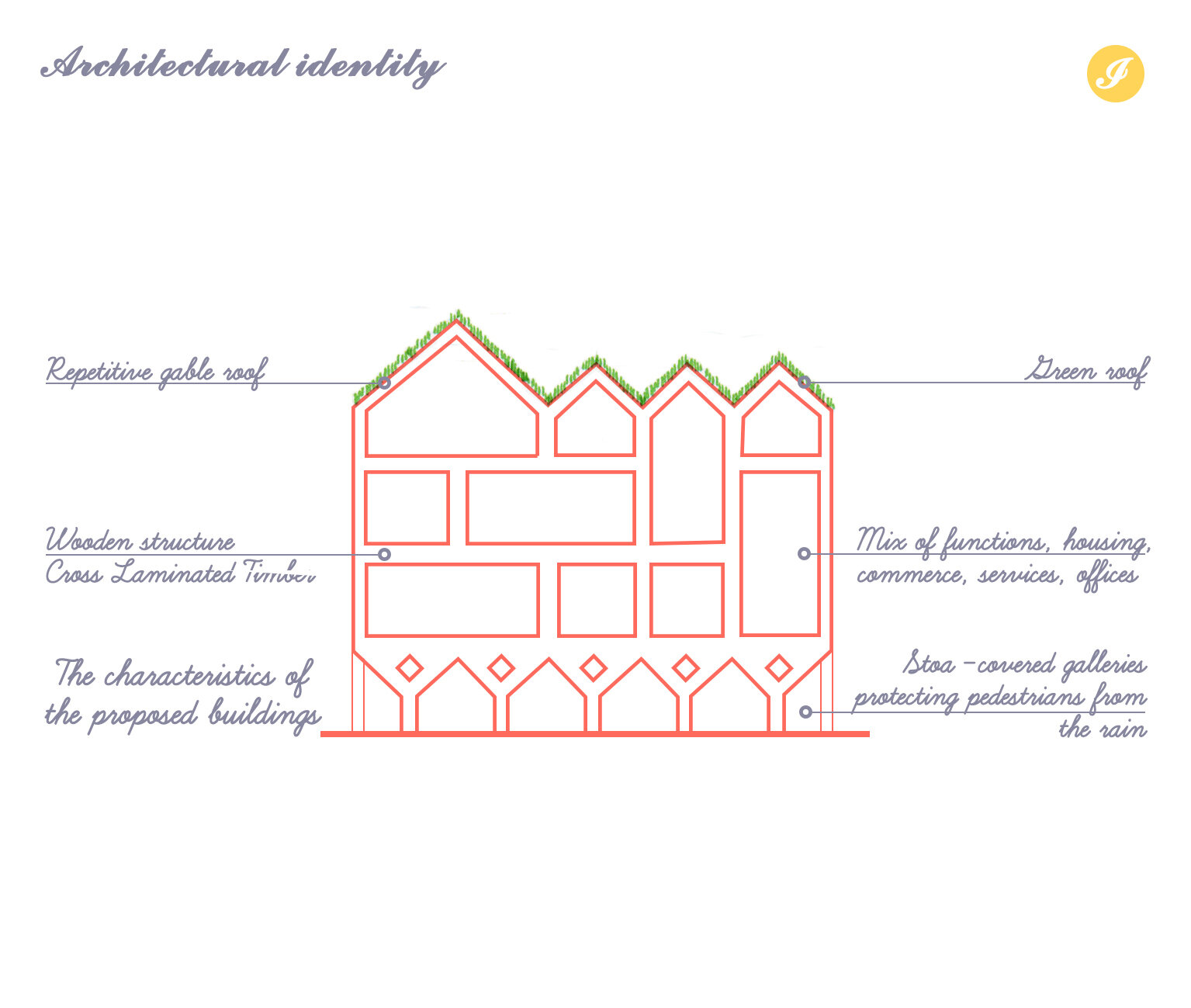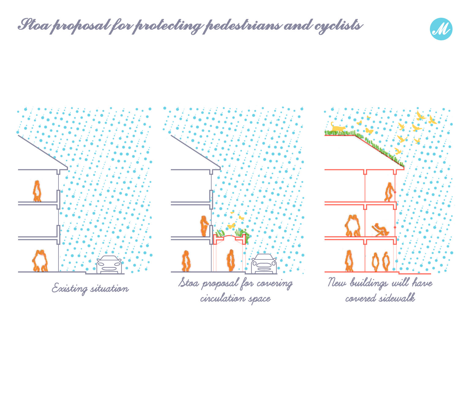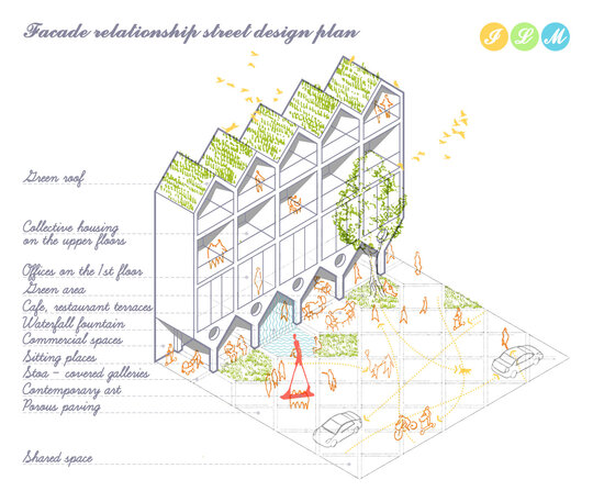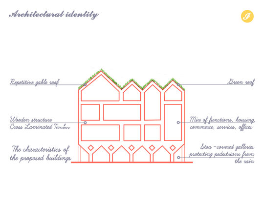 Desi conceptul este strain, Stoae, inspirate din Grecia, coloanele independente sau pasarelele acoperite, creeaza un spatiu semi-deschis, definind strada, separand utilizatorii, protejandu-i impotriva intemperiilor si, mai important, accentuand modelele dorite de mobilitate usoara. Forma si structura din lemn propuse sunt insa inspirate de casele traditionale din cea mai veche parte a orasului, portul.