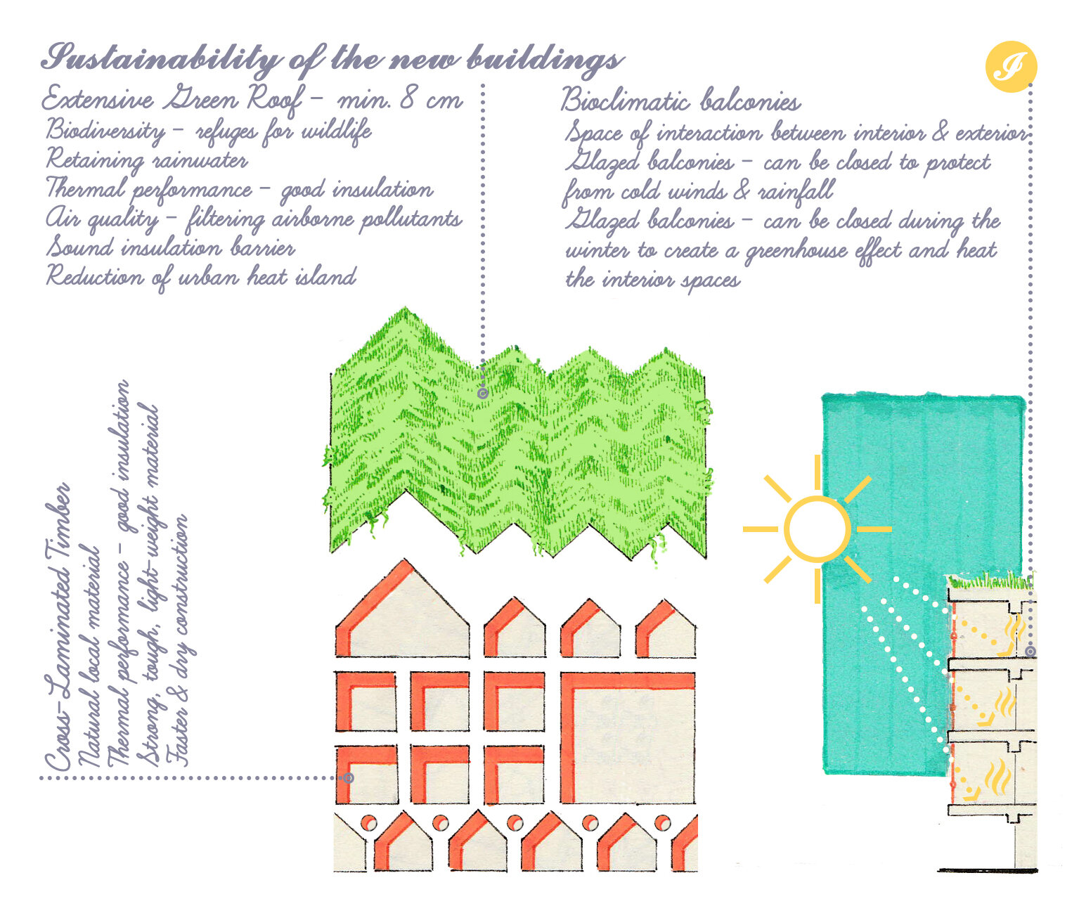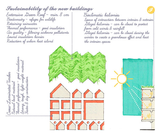 Deschiderile mari, vitrate, ale fatadelor si balcoanelor incurajeaza interactiunea intre spatiul public si cel privat. inchiderea balcoanelor creeaza zone de tip sera care incalzesc interiorul in lunile de iarna, protejand in acelasi timp locuitorii de vant si precipitatii pe tot parcursul anului.
