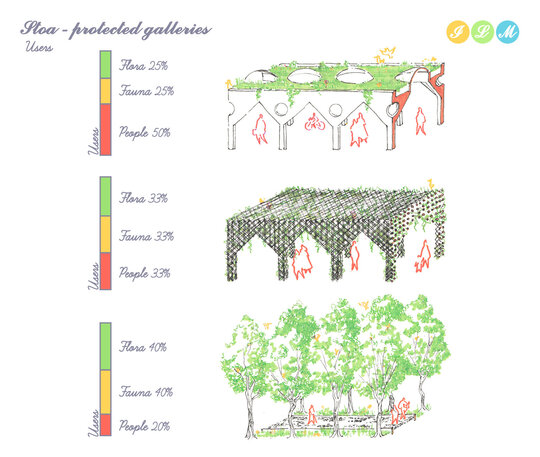 Galeriile stoa pot fi adaugate la cladirile existente sau incorporate in cele noi. Avand o structura din lemn CLT, greutatea lor variaza in functie de strada si de deschiderea cladirilor existente. Acoperisul lor verde completeaza coridoarele verzi ale orasului, creand conexiuni intre zonele de hranire si reproducere pentru animale, oferind in acelasi timp spatiu pentru dezvoltarea florei native si izolare pentru oameni. Lucarnele incorporate in acoperisurile verzi asigura o iluminare adecvata, reducand in acelasi timp poluarea luminoasa.