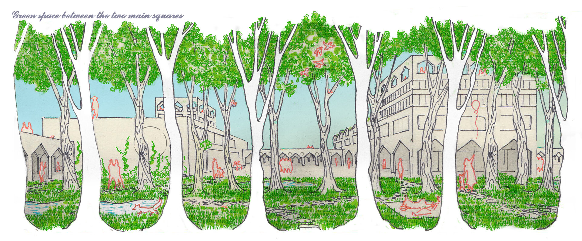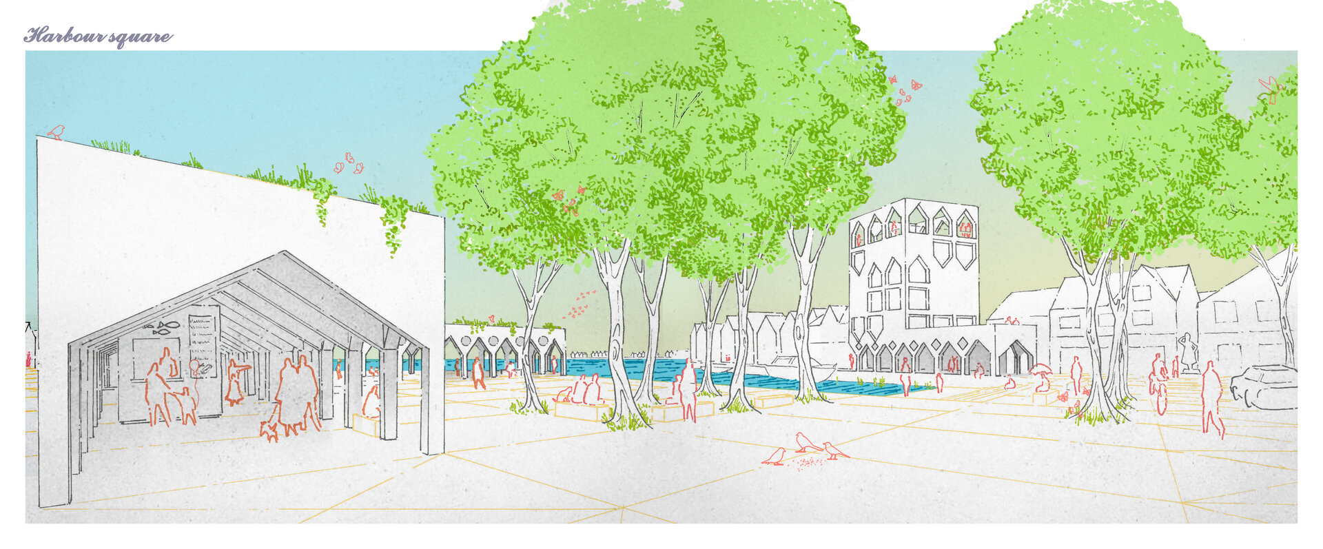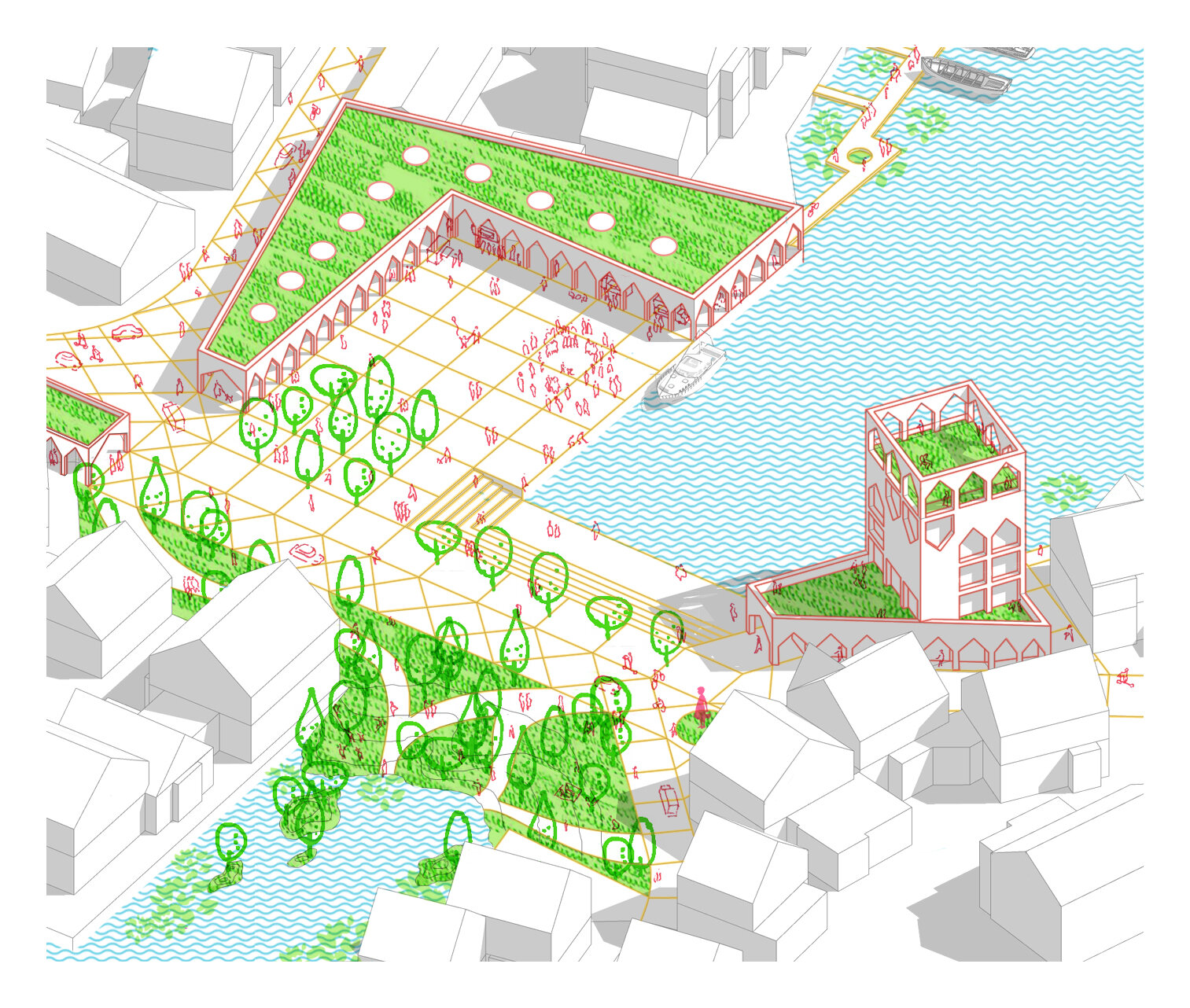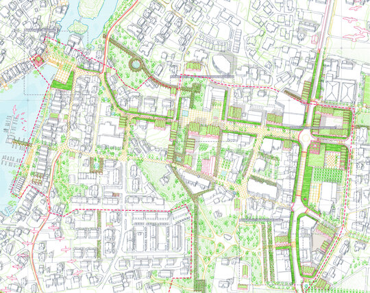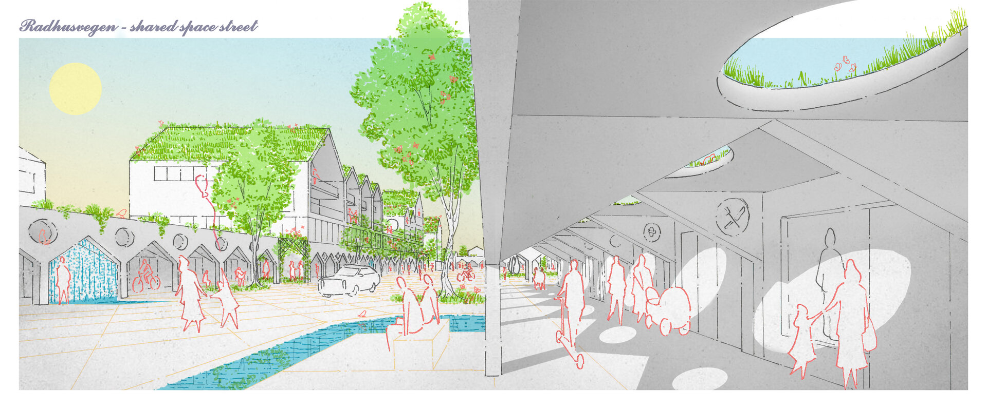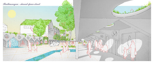 Actionand ca niste cusaturi de-a lungul peisajului fragmentat, strazile sunt marginite de stoa sau galerii. Pentru a trece cu succes de la modelele de mobilitate centrate pe masini la mobilitatea usoara, se acorda prioritate traficului pietonal, ciclismului si altor forme de trafic usor, prin crearea acestor rute protejate de-a lungul strazilor principale active. Atenuand climatul aspru al Marii Nordului, vantul intens si ploile abundente, care contribuie si mai mult la dezvoltarea urbana si stilul de viata centrate pe masini, noua infrastructura propusa creeaza un loc in care oamenii se pot intalni, trai si se pot simti in siguranta in viata de zi cu zi.