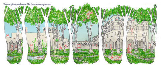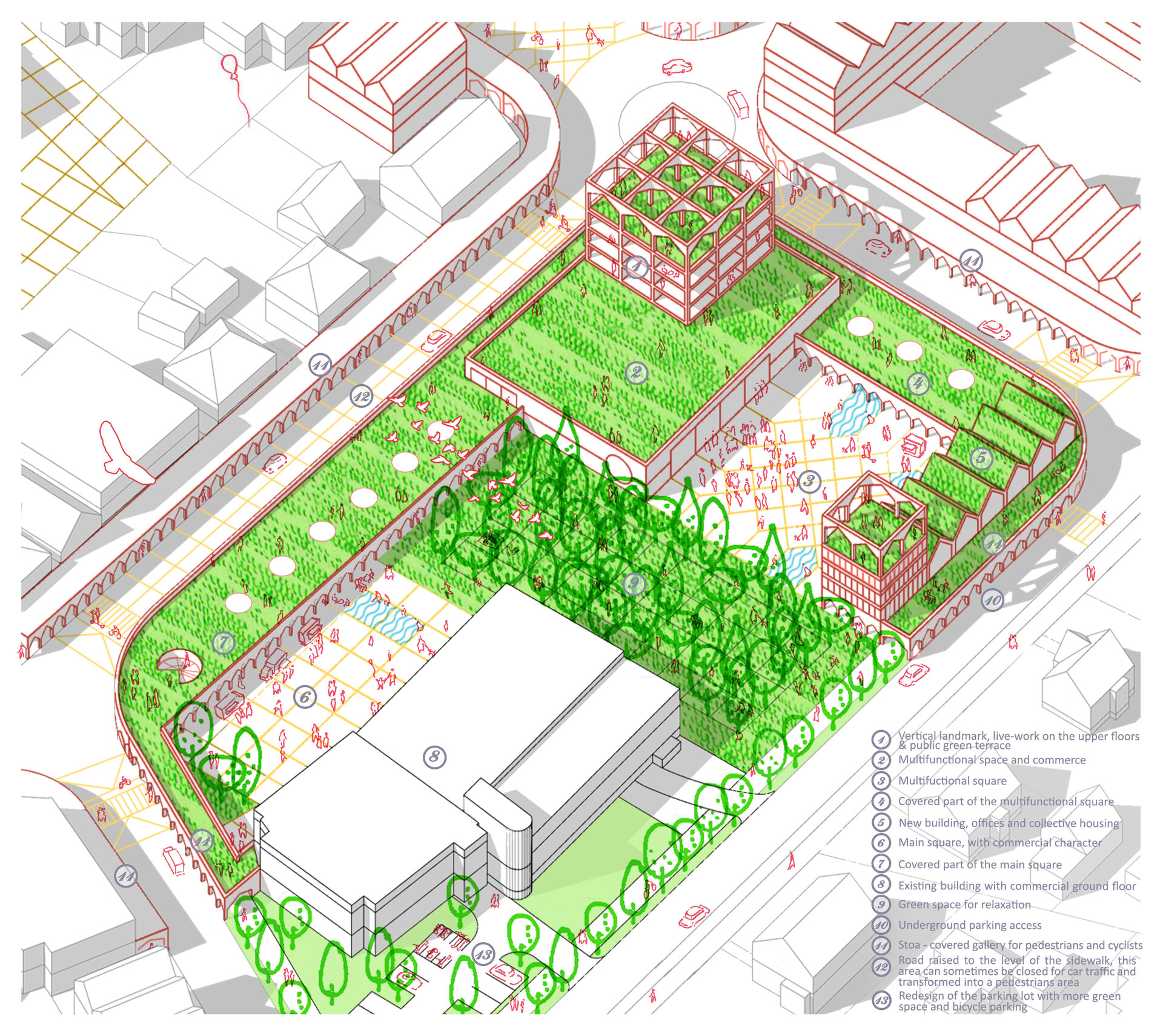 Considerate parte integranta a istoriei si identitatii orasului si recunoscand energia acumulata in fondul imobiliar, evitand in acelasi timp costurile inutile, doar doua cladiri din zona centrala sunt propuse pentru demolare, datorita densitatii reduse si necesitatii de reamenajare. Galeriile de-a lungul fatadelor asigura integrarea cladirilor existente, mentinand in acelasi timp un soclu urban coerent.