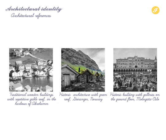 Pentru a evita un urbanism fragmentat, s-a stabilit o identitate clara pentru zona nou construita. Inspirate de tesutul urban istoric, un ansamblu de structuri de mici dimensiuni, noile cladiri au un aspect similar, in ciuda dimensiunilor mai mari, de 2 sau 3 etaje, fiind compuse din volume mai mici, pastrand in acelasi timp acoperisul inclinat ca element cheie. Scala umana este astfel mentinuta, in ciuda densitatii mai mari. Forma arhetipala a casei cu acoperis inclinat este consistenta atat in cazul cladirilor noi, cat si al stoa si galeriilor care adapostesc traseele pietonale si pentru ciclisti. Stoa de la parter creeaza un mediu activ protejat pentru pietoni, incurajand interactiunea si comertul. Inspirat de arhitectura traditionala din Geiranger, Jølster, cascada Kvednafossen si Olden, acoperisul verde asigura izolare termica si fonica, retentie a apei, ajuta la formarea coridoarelor verzi care sporesc biodiversitatea, imbunatateste calitatea aerului si multe altele. Pentru noile cladiri au fost alese structuri din lemn CLT pentru a utiliza materiale locale, a facilita si accelera constructia, a asigura o izolare adecvata si a mentine costurile scazute prin standardizare. Formele inovatoare, dar familiare, sunt menite sa atraga atat localnicii, cat si vizitatorii.