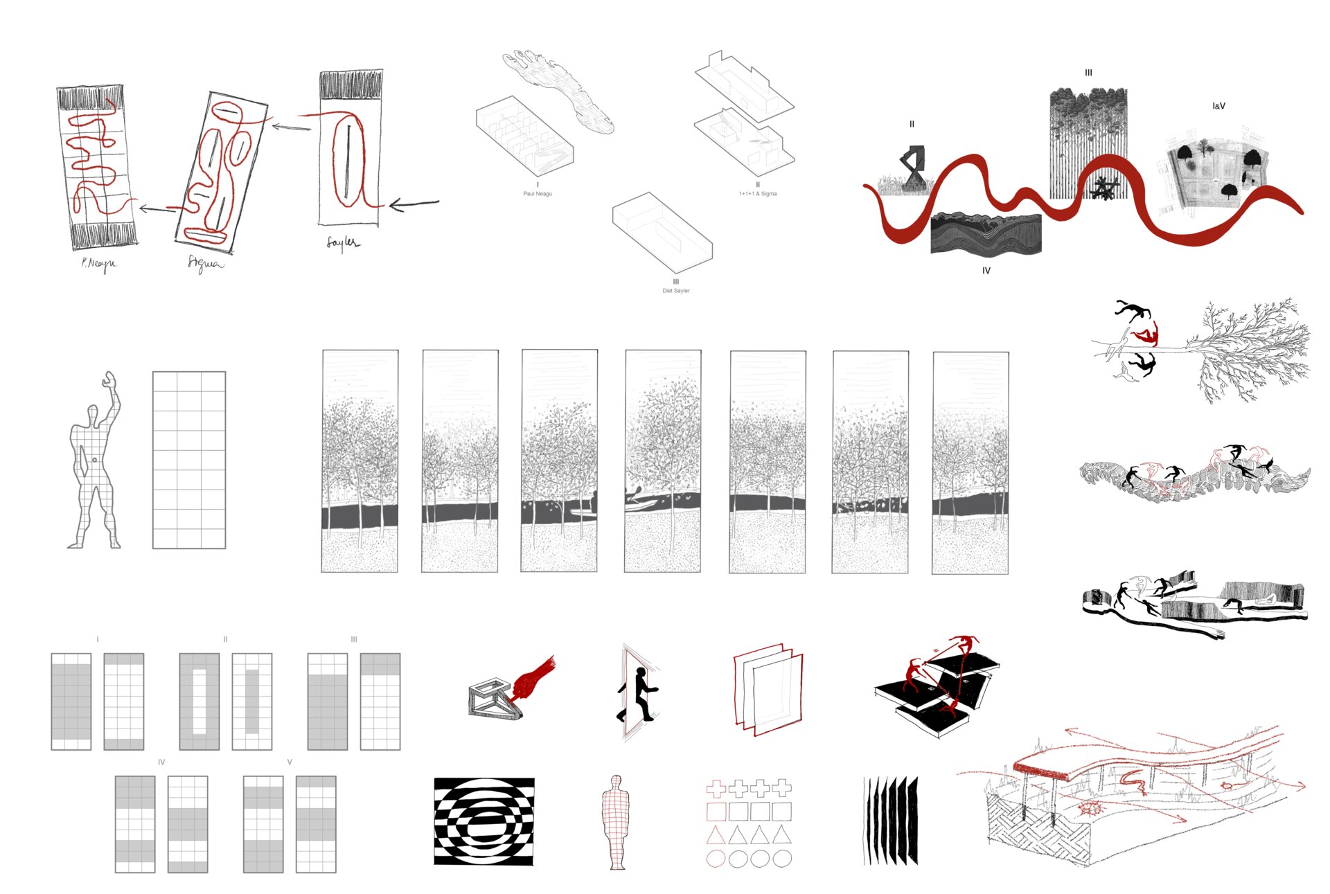 Traseul este un element cheie al proiectului, este generatorul întregului proiect, împreună cu modulul de organizare spațială. Traseul devine, astfel, un mijloc de interpretare a conți-nutului muzeal, dar și un dispozitiv arhitectural care creează ritm, tensiune și repaus, în acord cu spiritul experimental al avangardei. Acesta face o trecere în revistă a colecției de artă avangardistă postbelică, dar și o conexiune cu principiile acesteia într-un context contemporan. Proiectul este caracterizat de lumea apolinică, la nivelul parterului, guvernată de lumină, rațiune, transparență, legătura cu natura; și cea dionisiacă, a subsolului, din penumbră, de mister și explorare senzorială, fiind proiecția lumii apolinice, dar guvernată de un traseu tectonic.