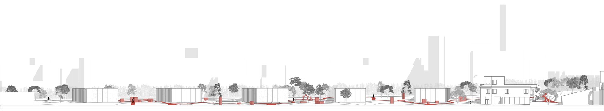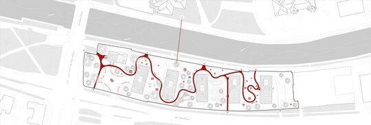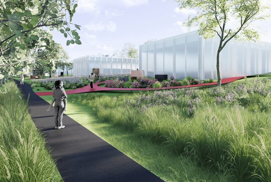 Proiectul amenajării de peisagistică urmărește ideea unui parc de sculpturi. Amenajarea devine una din temele principale ale proiectului. Astfel, este una din temele vizuale predominante din imaginea de ansamblu. Arhitectura se plasează pe plan secund în timpul zilei, lăsând cadrul natural și galeria exterioară pe prim plan. În schimb, după lăsarea întunericului, cei doi actori fac schimb de roluri, inversând centrul de interes al compoziției, o scenă în care arhitectura devine personajul principal prin iluminarea artificială. Acest concept ciclic permite galeriei exterioare o varietate de atmosfere într-un cadru de douăzeci și patru de ore. De aici apare galeria exterioară, integrată în parcul de pe sit și în dialog cu clădirile. Spațiul dedicat artei avangardei se materializează printr-o serie de 5 volume, urmărind serialitatea specifică malului Bega.