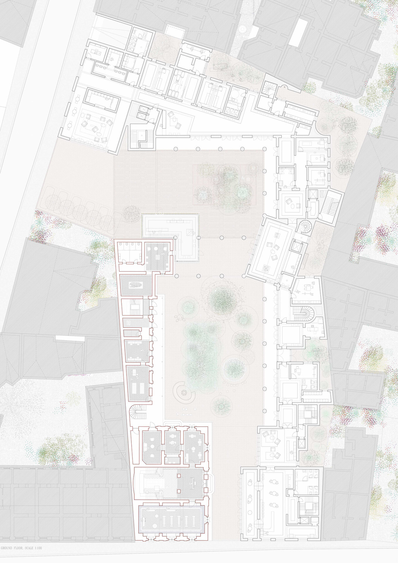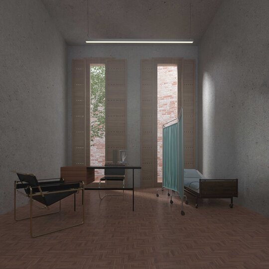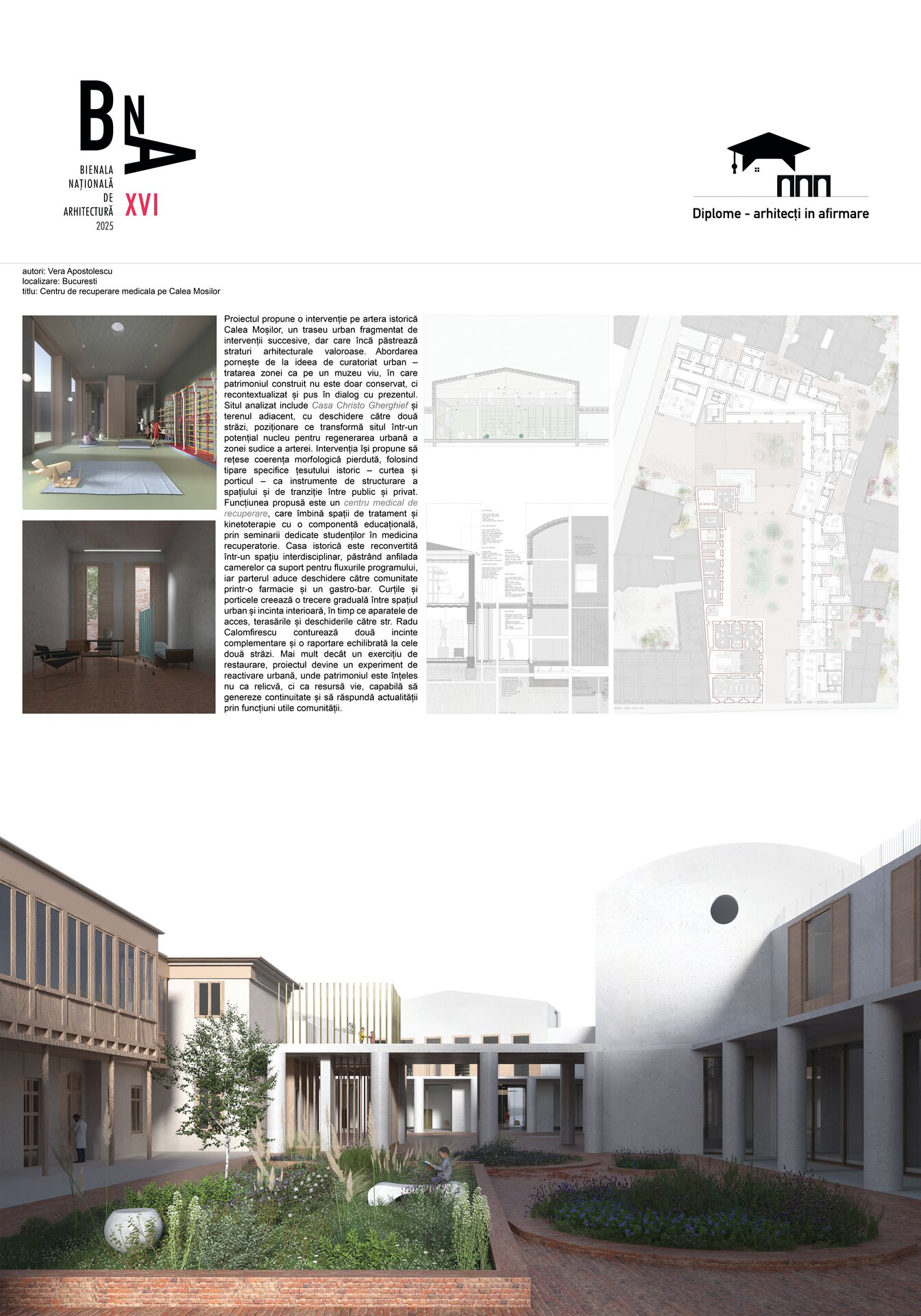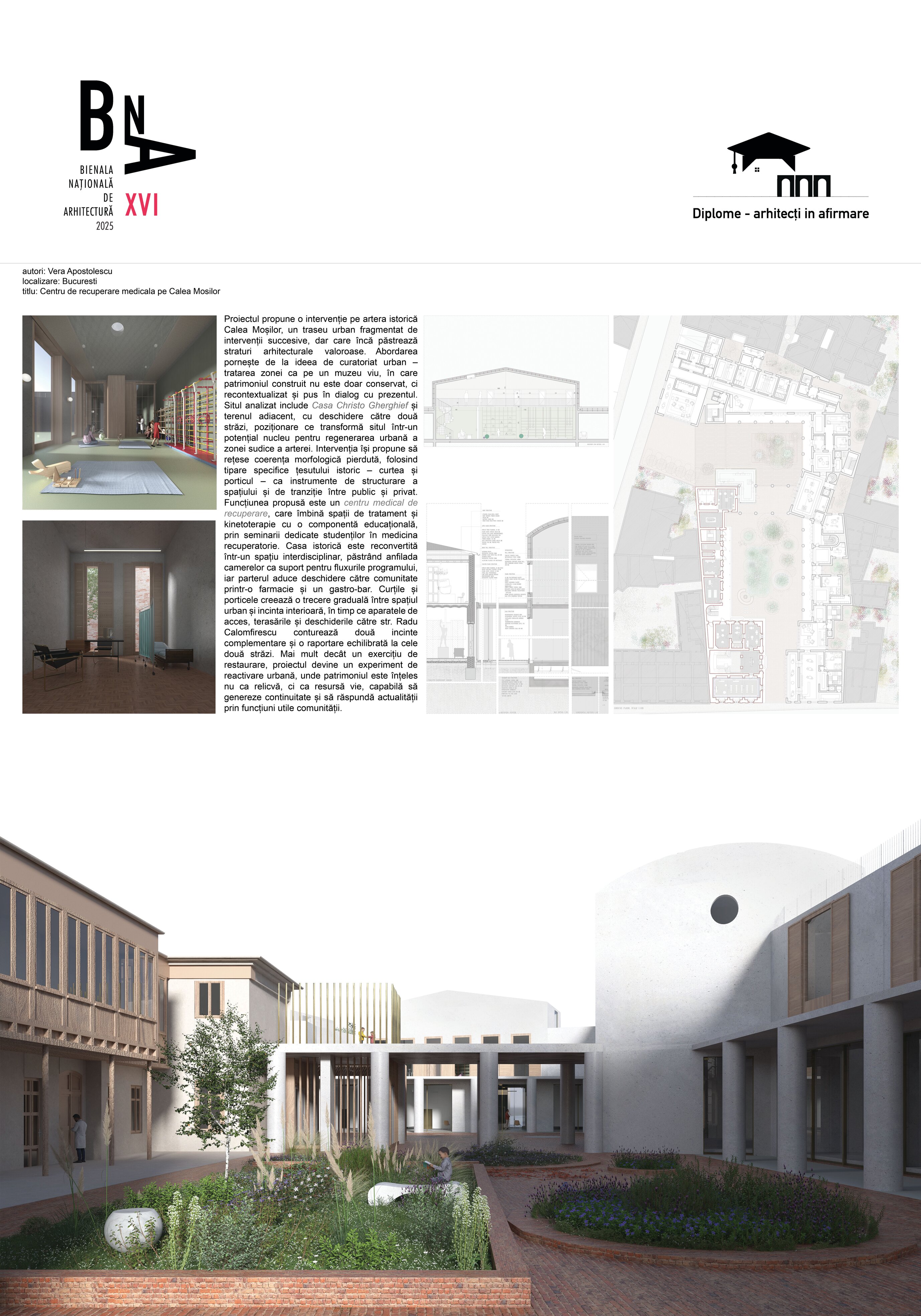 În acest cadru se inserează un Centru de recuperare medicală, un program care unește vindecarea trupului cu memoria locului. Casa istorică este reconvertită într-un spațiu interdisciplinar, păstrând anfilada ca suport pentru seminarii și dialog academic, în timp ce noua intervenție adaugă săli de tratament, kinetoterapie și funcțiuni deschise comunității – farmacie, gastro-bar, spații de întâlnire. Volumele propuse nu caută să domine, ci să însoțească existentul, să creeze curți, pasaje și perspective, să țese continuitate acolo unde fragmentele nu mai comunicau. Astfel, patrimoniul nu este tratat ca relicvă, ci ca resursă vie, capabilă să regenereze țesutul urban și să hrănească orașul cu noi sensuri, într-un dialog permanent între memorie și actualitate.