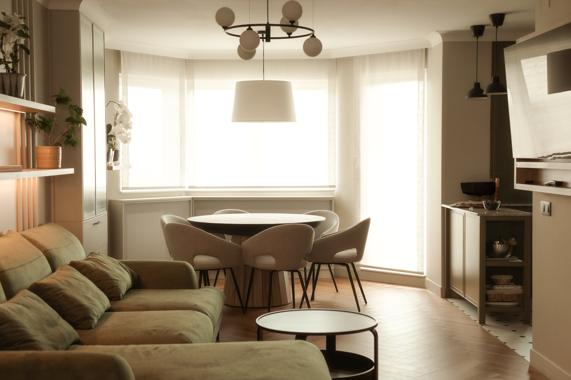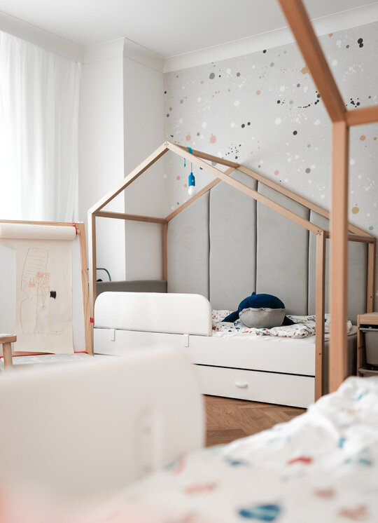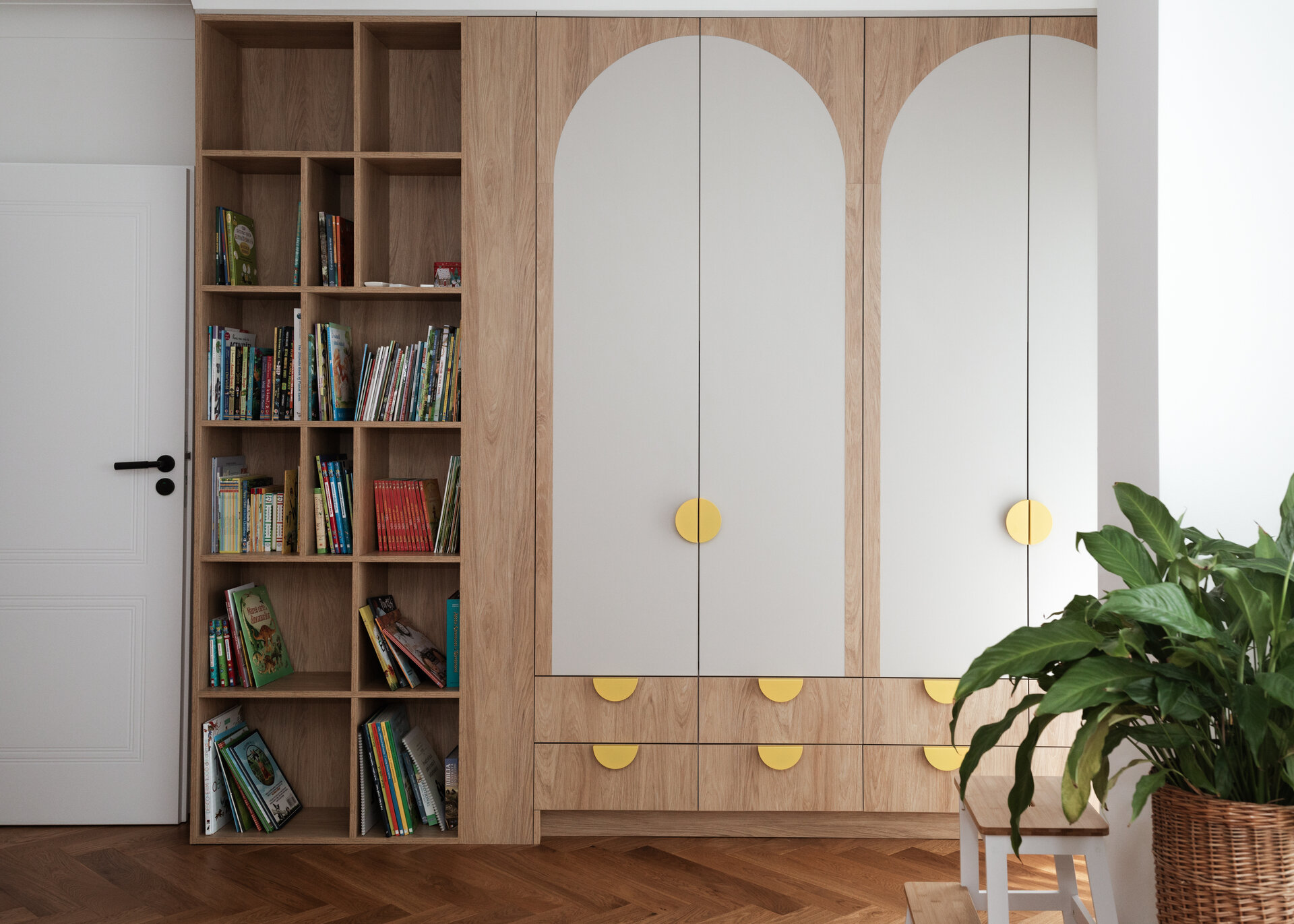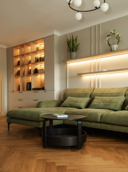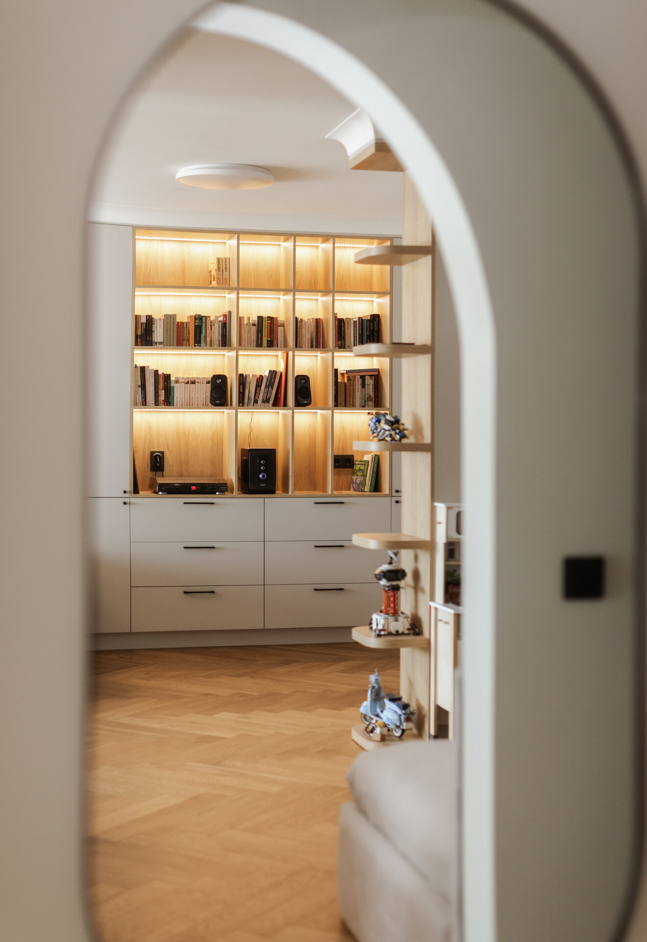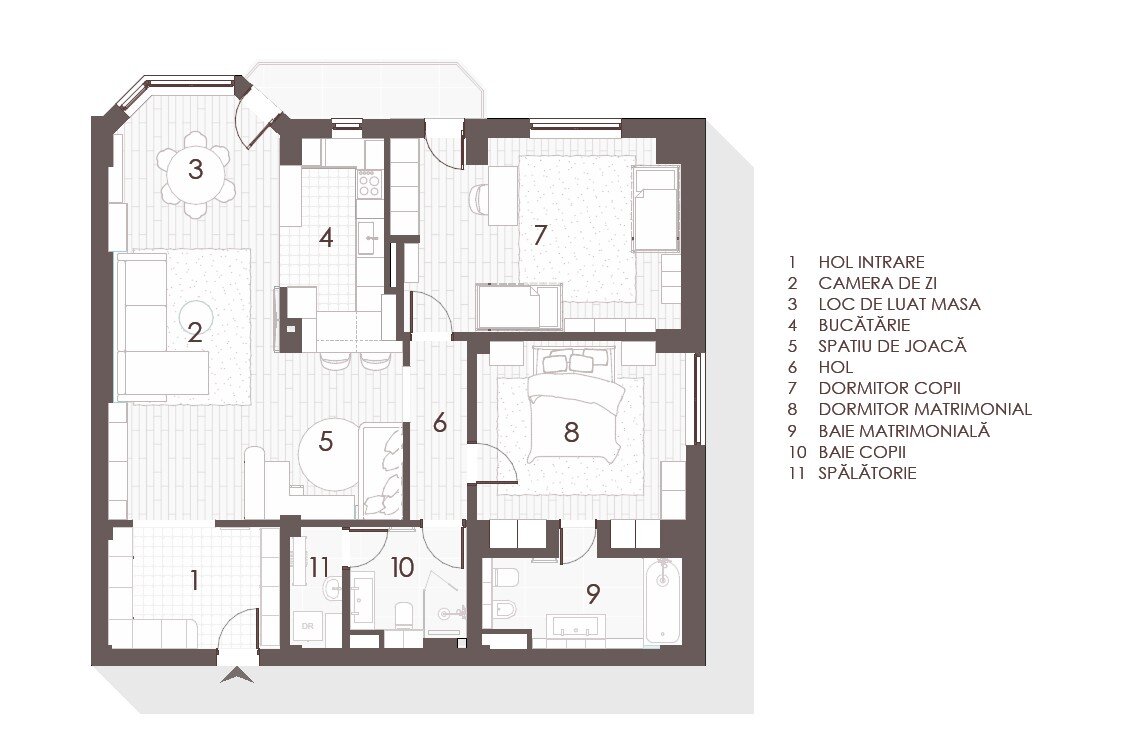 Reorganizarea apartamentului a pornit de la o zonificare clară între spațiul de zi și zona de noapte. În noua configurare, bucătăria mărită se află în imediata apropiere a zonei de luat masa și a livingului, favorizând o legătură firească între activitățile zilnice și socializarea în familie. Zona de zi a fost completată prin introducerea unei biblioteci și a unui spațiu de joacă dedicat copiilor, ambele integrate armonios în ansamblu și gândite să răspundă atât nevoilor de recreere, cât și celor de învățare și dezvoltare.