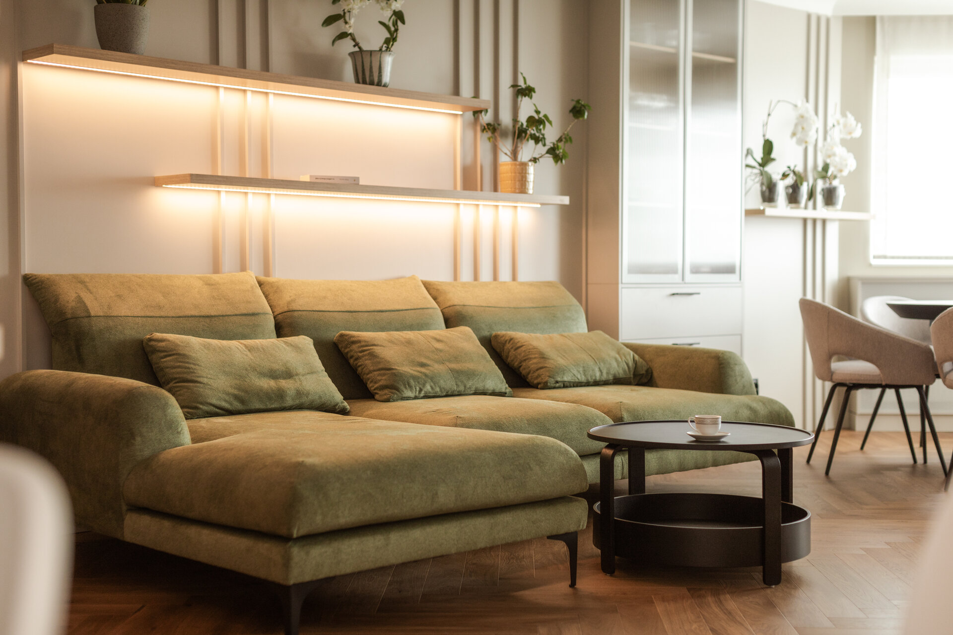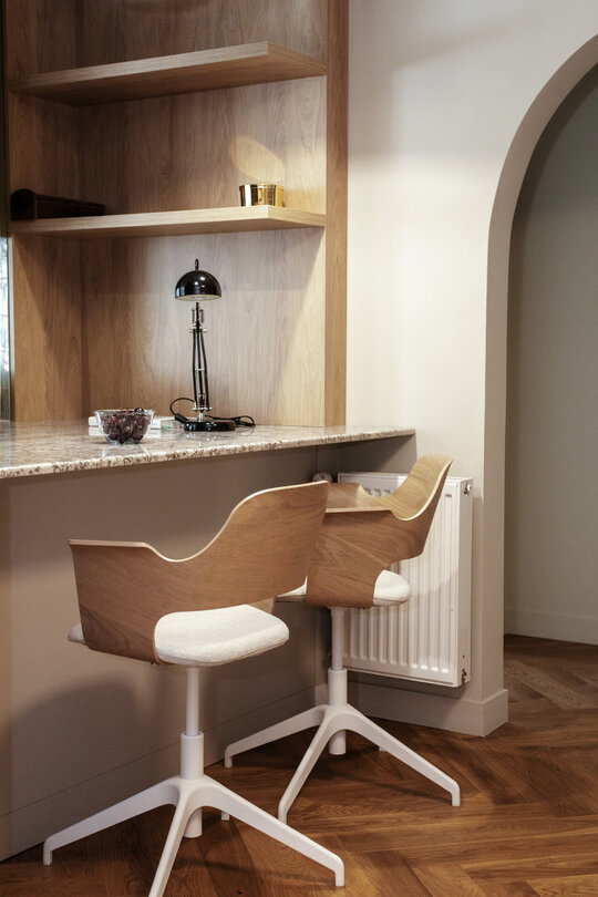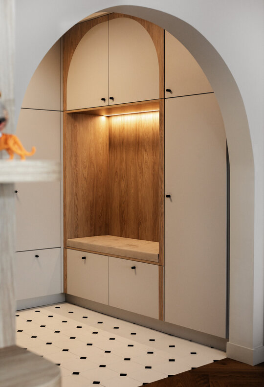 Un alt principiu definitoriu al proiectului a fost discreția integrării depozitării. Printr-un mobilier personalizat și soluții arhitecturale ingenioase, spațiile de stocare au fost ascunse în volumetrii simple și unitare, evitându-se fragmentarea vizuală a apartamentului. Această abordare contribuie nu doar la funcționalitate, ci și la claritatea estetică a ansamblului.