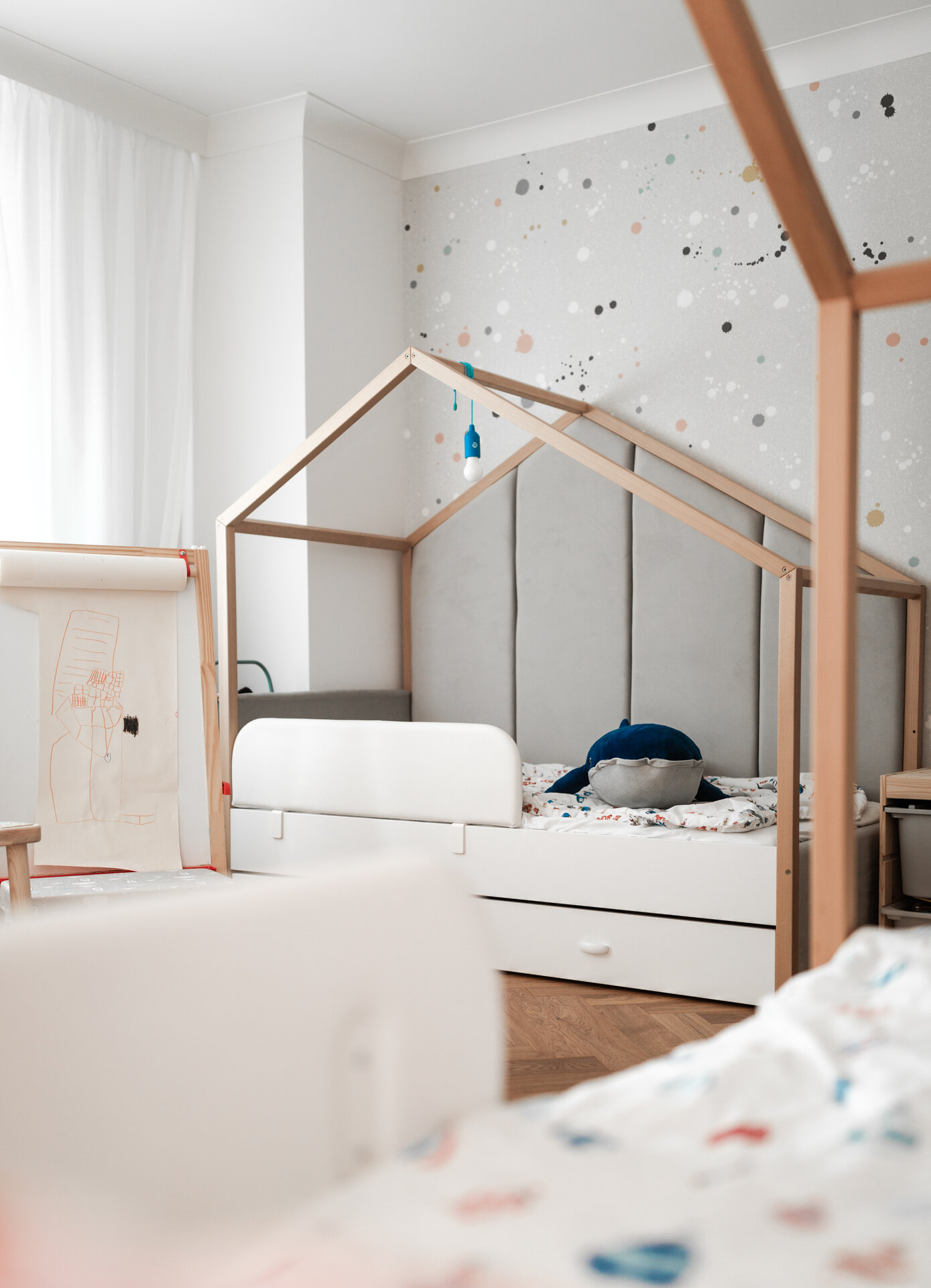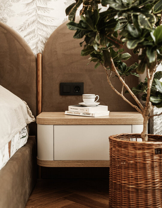 Zona de noapte, rezervată dormitoarelor, a fost tratată cu atenție sporită asupra funcționalității și a integrării depozitării. Soluțiile propuse au inclus mobilier realizat la comandă, cu spații ascunse de depozitare, astfel încât să se maximizeze eficiența și să se păstreze claritatea vizuală a spațiilor. Dormitorul matrimonial și camera copiilor sunt configurate pentru a oferi intimitate și confort, dar și pentru a susține o viață de familie dinamică.