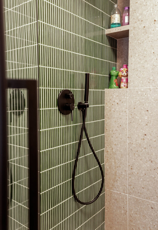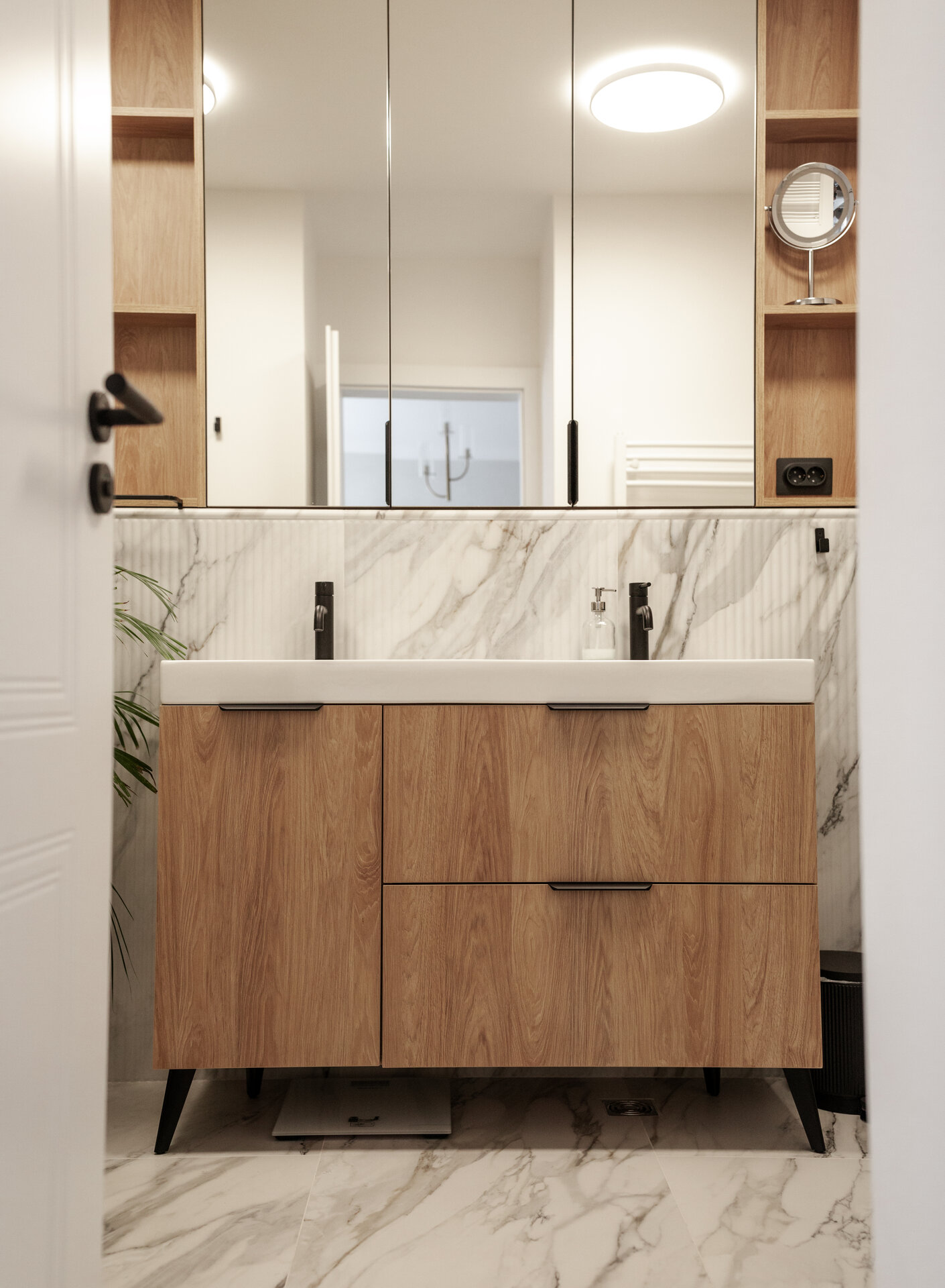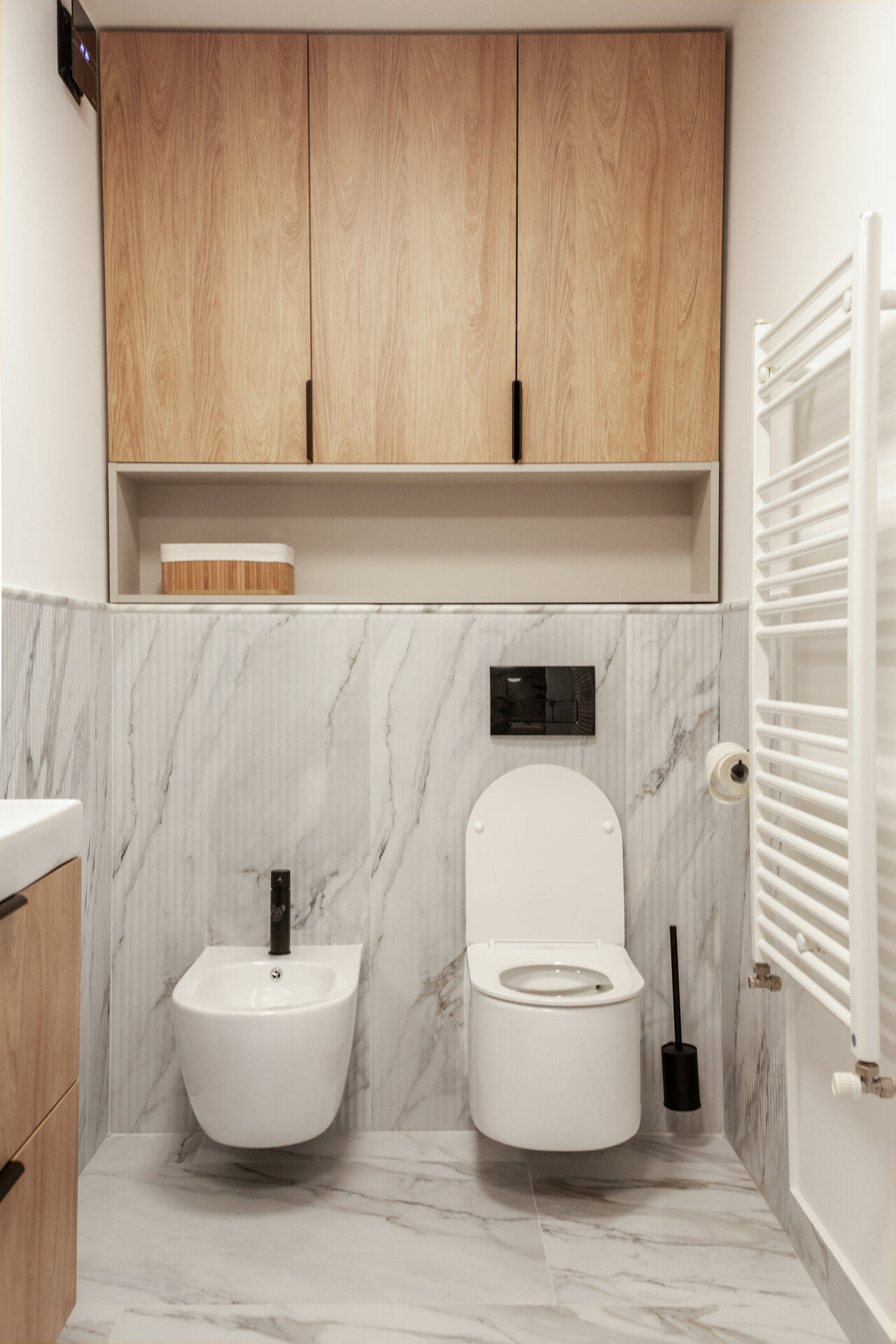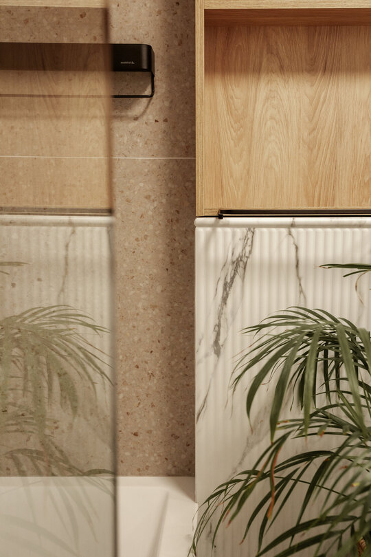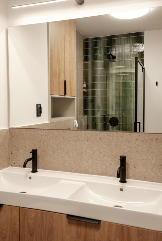 Băile au fost complet regândite, inclusiv prin relocarea unor trasee de instalații, pentru a obține o utilizare cât mai optimă a suprafețelor. În acest fel, fiecare încăpere a câștigat în ergonomie, păstrând totodată un limbaj vizual coerent cu restul amenajării.