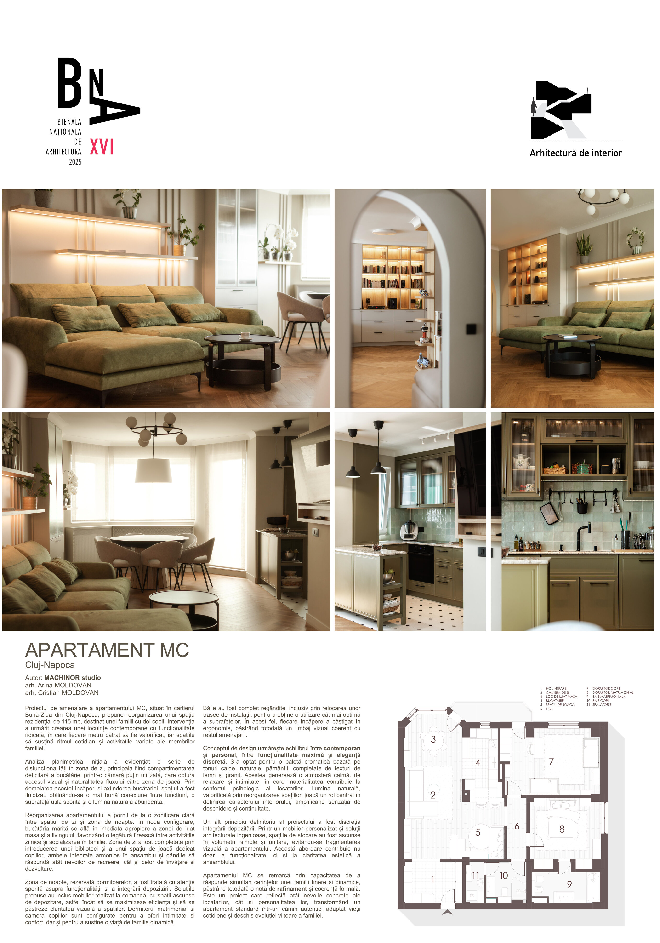 Proiectul de amenajare a apartamentului MC, situat în cartierul Bună-Ziua din Cluj-Napoca, propune reorganizarea unui spațiu rezidențial de 115 mp, destinat unei familii cu doi copii. Intervenția a urmărit crearea unei locuințe contemporane cu funcționalitate ridicată, în care fiecare metru pătrat să fie valorificat, iar spațiile să susțină ritmul cotidian și activitățile variate ale membrilor familiei.