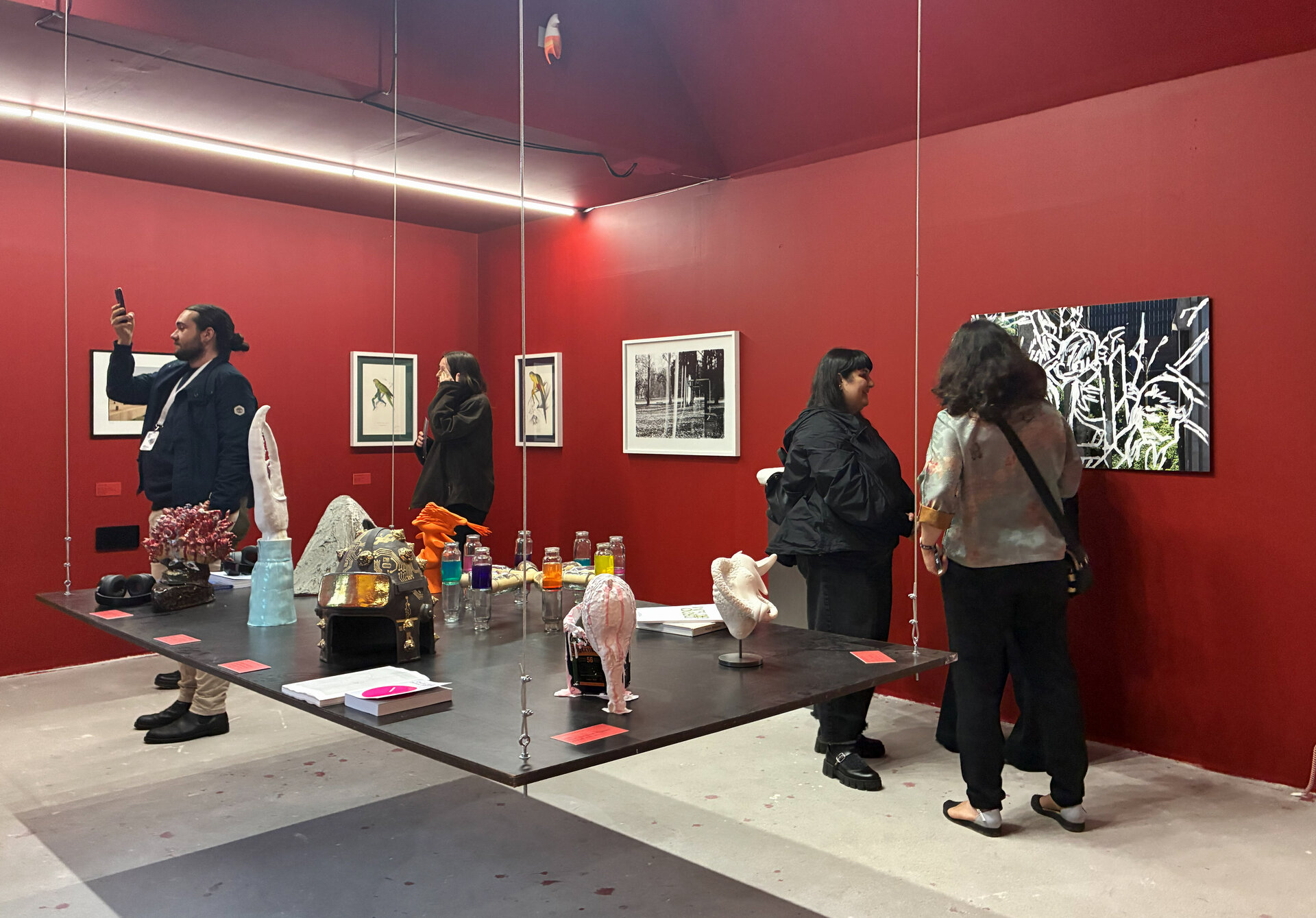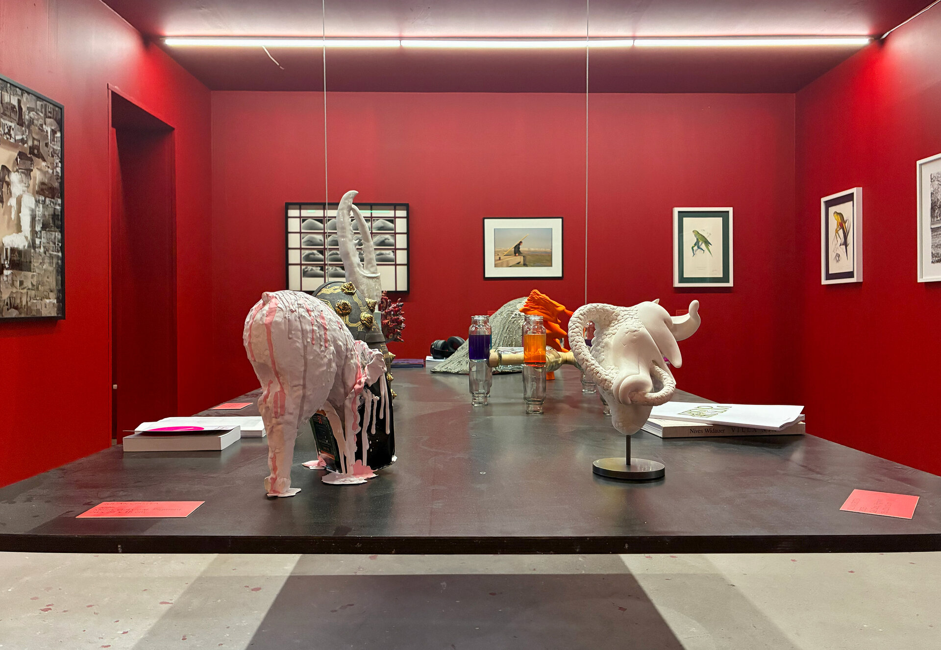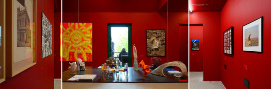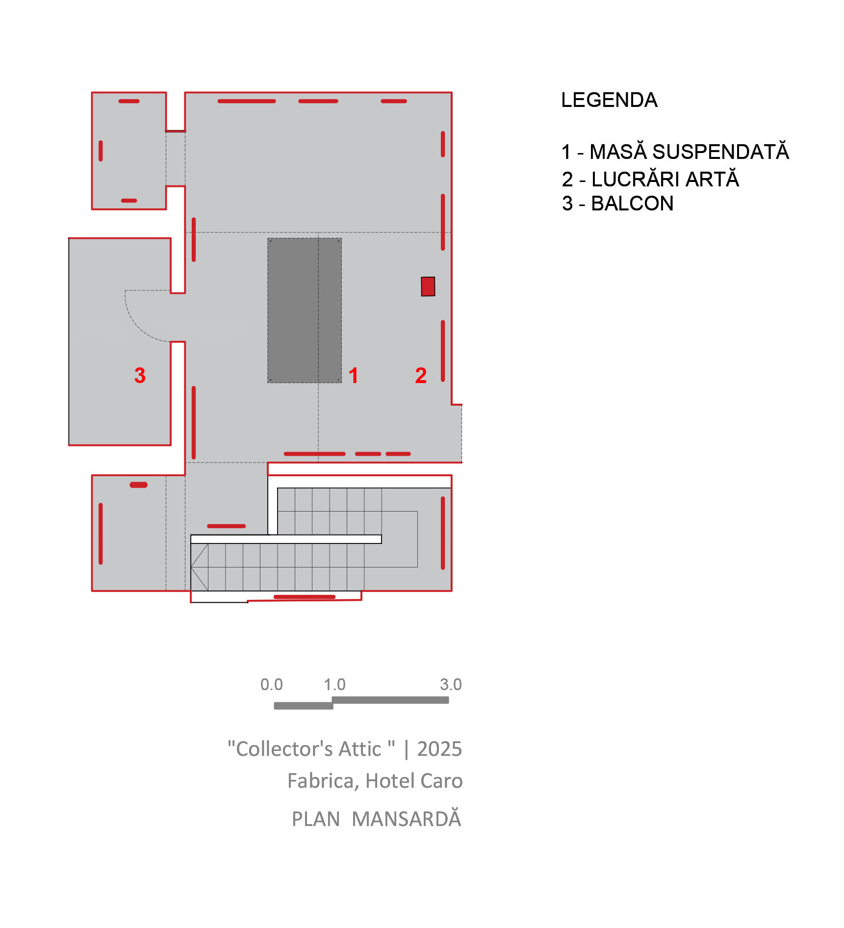 Roșu peste tot în afara pardoselii de ciment. Suprafața gri care continuî în spațiile adiacente de la etaj și ajunge pe scara până în galeriile de la parter.