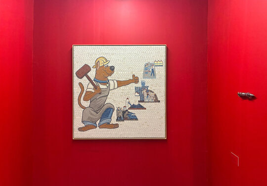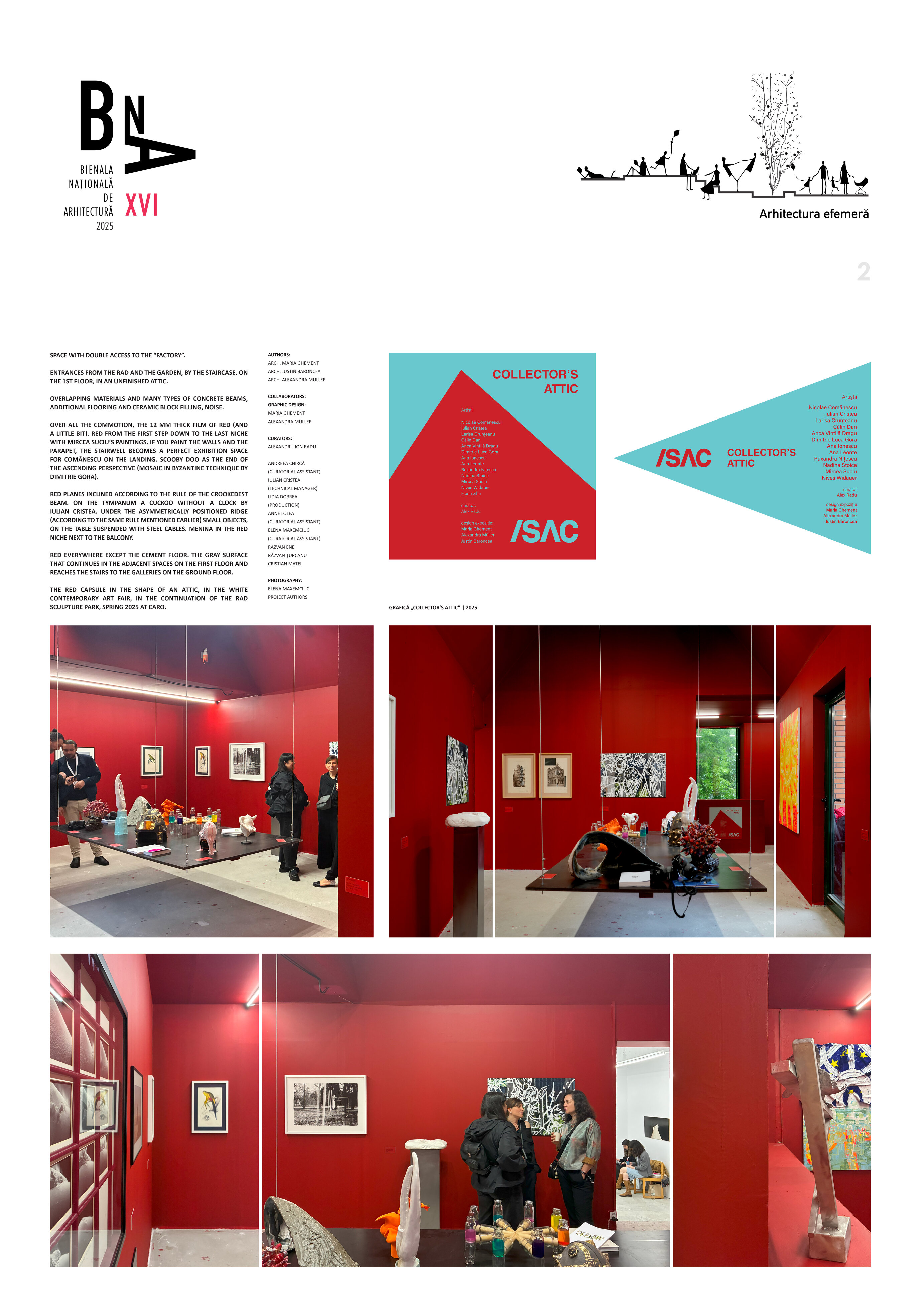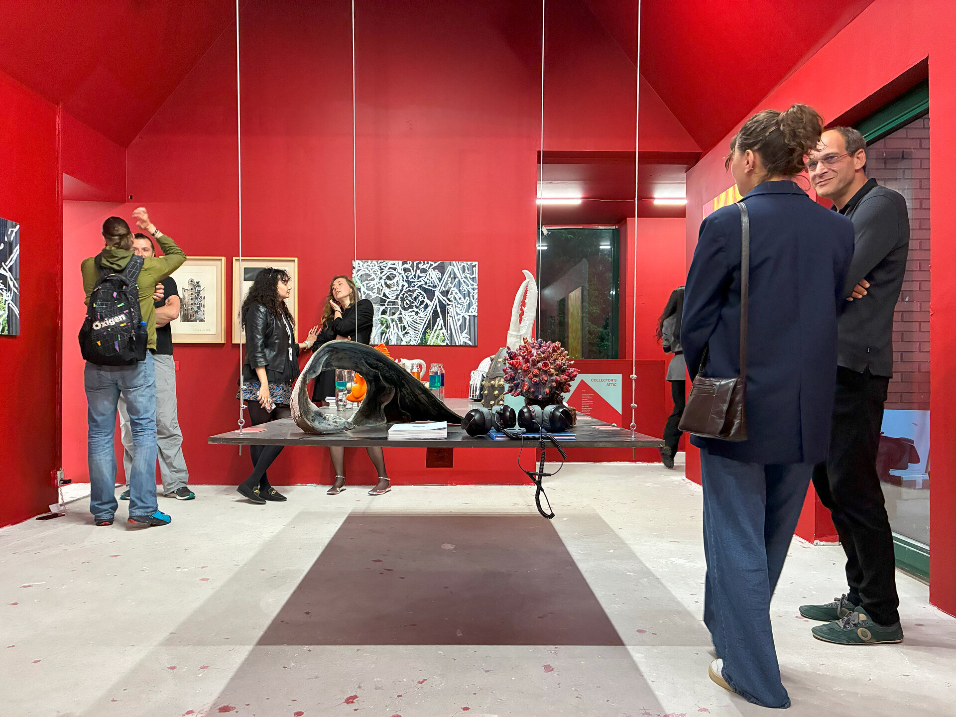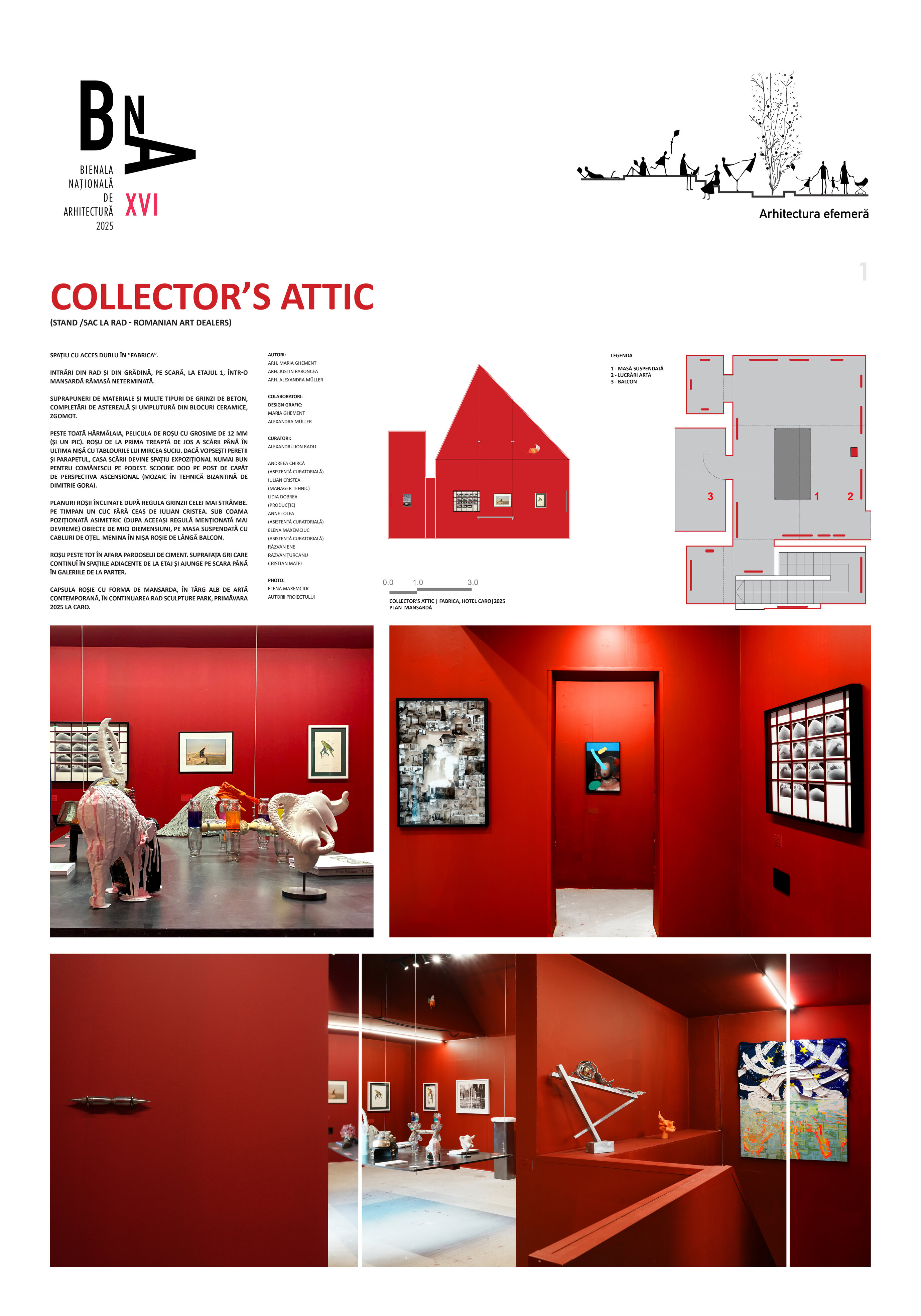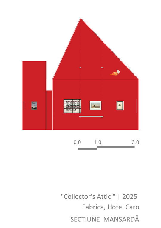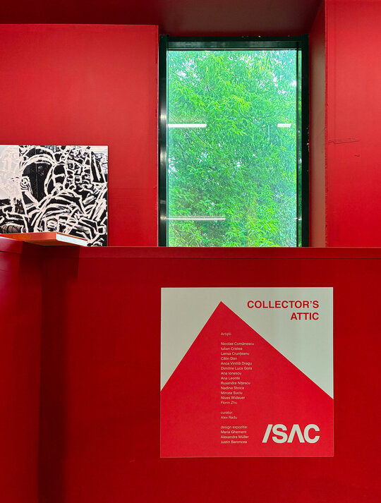 Peste toată hărmălaia, pelicula de roșu cu grosime de 12 mm (și un pic). Roșu de la prima treaptă de jos a scării până în ultima nișă cu tablourile lui Mircea Suciu. Dacă vopsești peretii și parapetul, casa scării devine spațiu expozițional numai bun pentru Comănescu pe podest. Scoobie Doo pe post de capăt de perspectiva ascensional (mozaic în tehnică bizantină de Dimitrie Gora