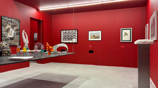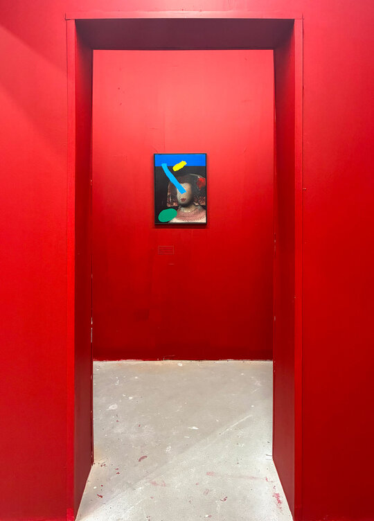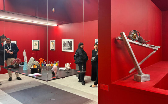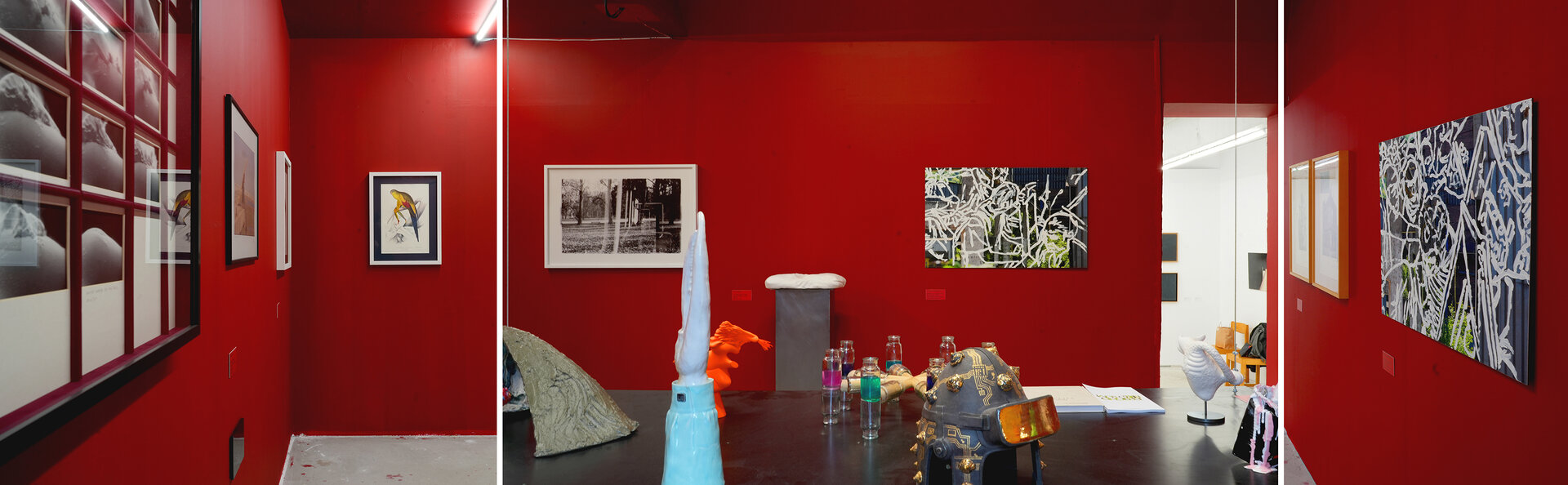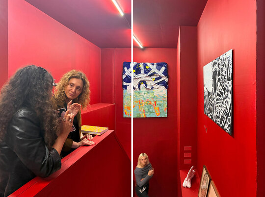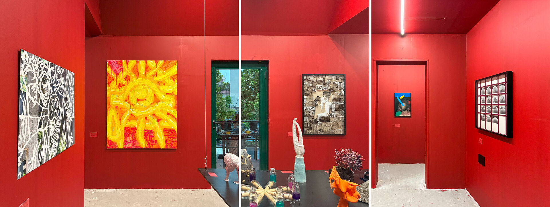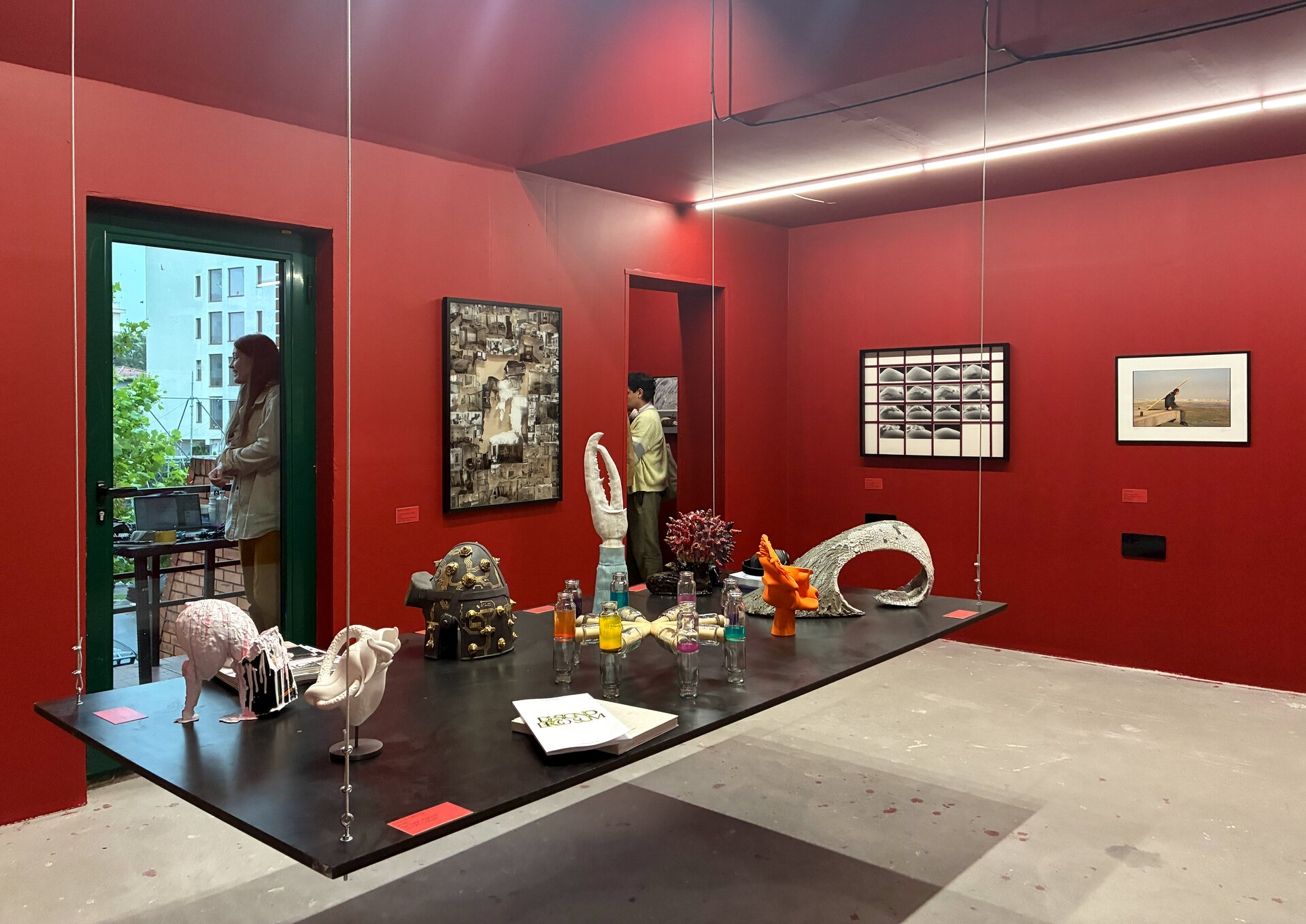 Peste toată hărmălaia, pelicula de roșu cu grosime de 12 mm (și un pic). Roșu de la prima treaptă de jos a scării până în ultima nișă cu tablourile lui Mircea Suciu. Dacă vopsești peretii și parapetul, casa scării devine spațiu expozițional numai bun pentru Comănescu pe podest. Scoobie Doo pe post de capăt de perspectiva ascensional (mozaic în tehnică bizantină de Dimitrie Gora