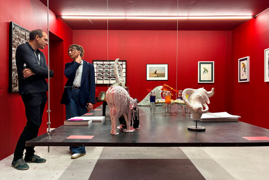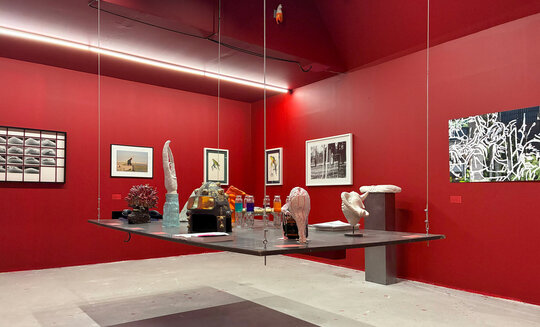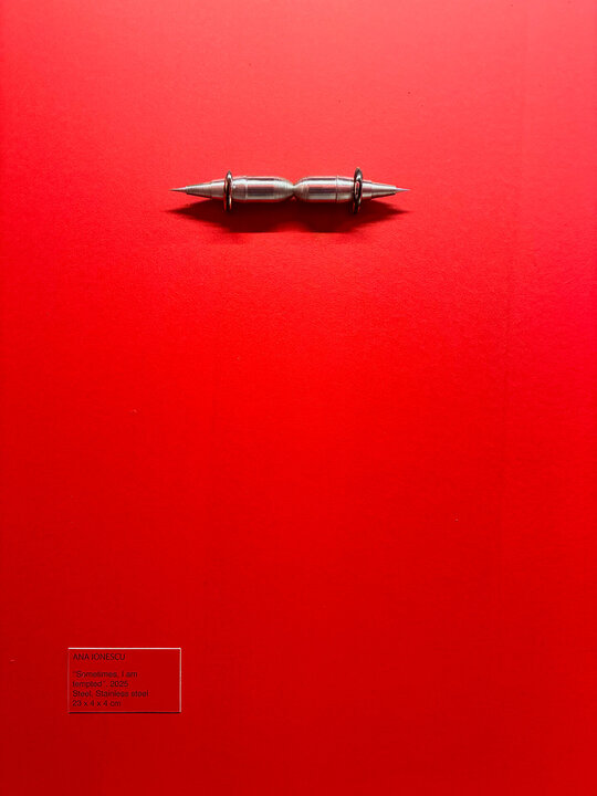 Capsula roșie cu forma de mansarda, în târg alb de artă contemporană, în continuarea RAD Sculpture Park, primăvara 2025 la Caro.