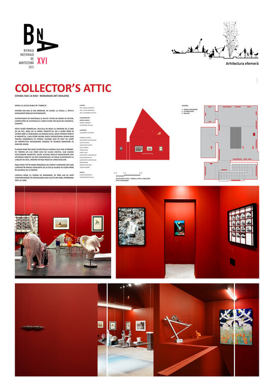 Planuri roșii înclinate după regula grinzii celei mai strâmbe. Pe timpan un cuc fără ceas de Iulian Cristea. Sub coama poziționată asimetric (dupa aceeași regulă menționată mai devreme) obiecte de mici diemensiuni, pe masa suspendată cu cabluri de oțel. Menina în nișa roșie de lângă balcon.