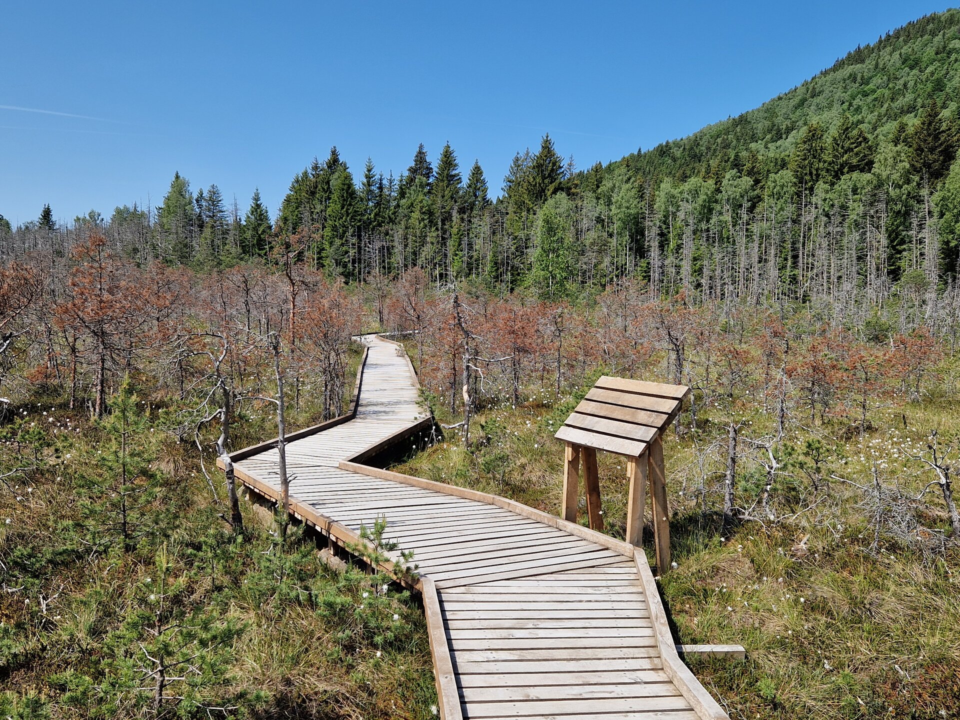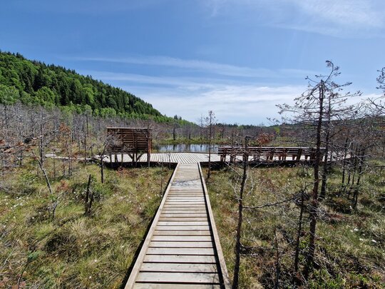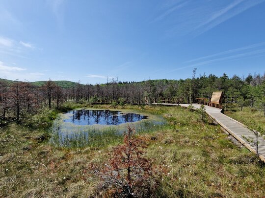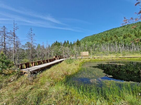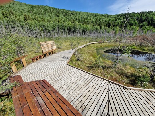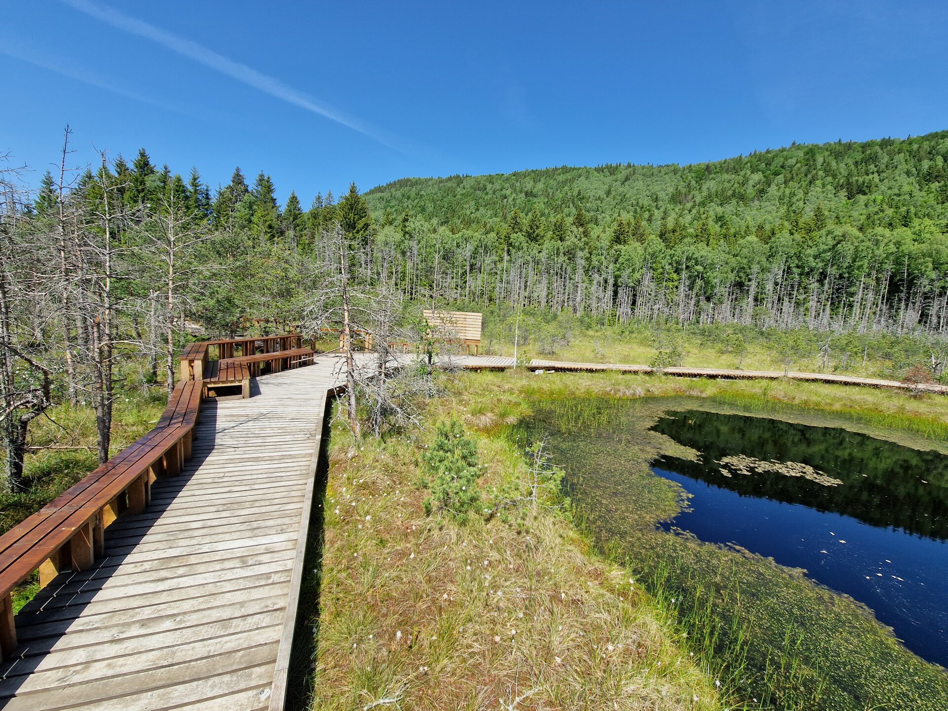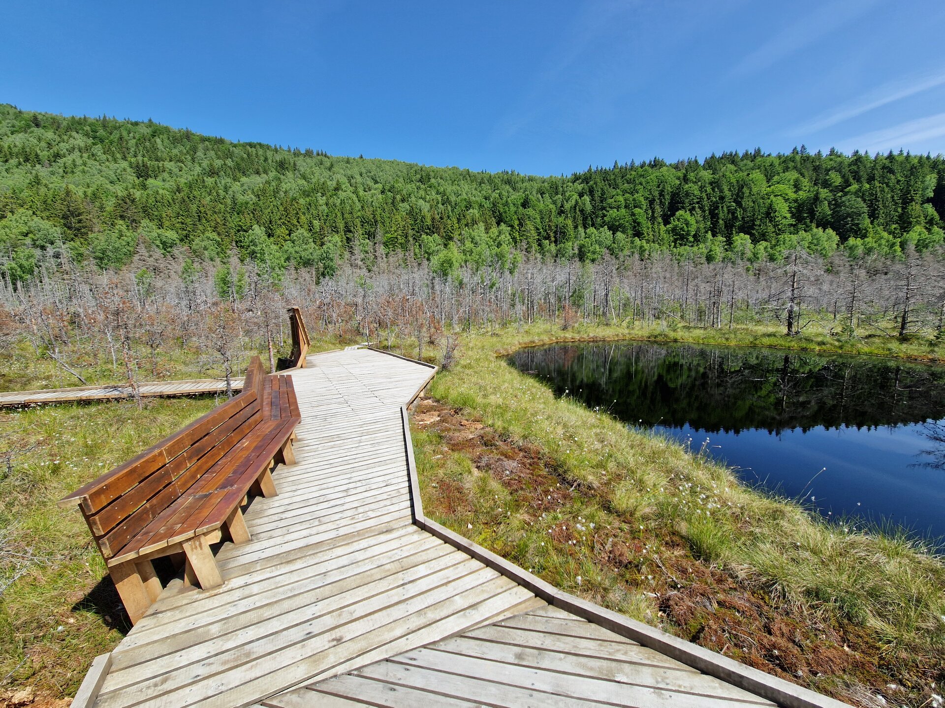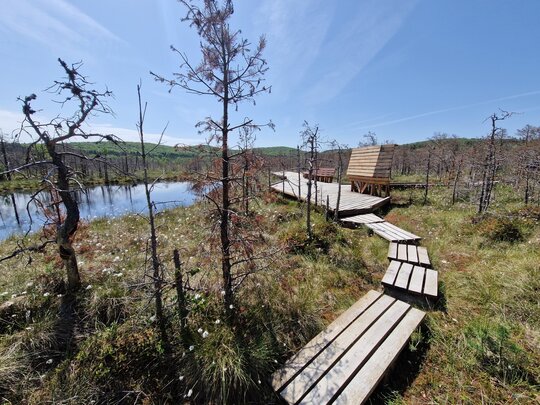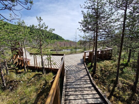 În locul unei poteci simpliste existente din lemn de brad, proiectul și-a propus impunerea unui concept nou, integrat activității specific ecoturistice. Traseul leagă patru puncte de referință, fiecare amenajat special, unic: zona de intrare unde se adună turiștii și se face o prezentare generală a sitului, cele două lacuri vizitabile din tinov, și zona de ieșire unde se trag concluziile în urma celor văzute. Între ele există trei segmente de poteci, diferite ca configurație, aspect, secțiune: prima o potecă mai amplă cu balustradă pe o parte, a doua mai puțin lată și fără balustradă, a treia din pontoane mici. Toate sunt fragmentate geometric, și se adaptează vegetației. De-a lungul traseului întâmpinăm perspective incitante, la fel și efecte de surpriză, generate de schimbările de direcție a traseului. Prin concepția ei, poteca se dizolvă treptat în tinov, în vegetație. Pe malul celor două lacuri, “ochiuri de apă” prezentate vizitatorilor dintre zecile din tinov, la prima s-a creat un ponton mai amplu, unde vizitatorii în grupuri mai ample se pot deplasa mai liber. La al doilea ponton s-a axat pe idea de liniște, contemplare, odihnă. Traseele și zonele amenajate ample sunt echipate pe-a locuri cu panouri de informare și locuri de șezut. Materialul folosit la amenajări a fost exclusiv lemnul de stejar, care rezistă în timp în acest mediu. Prin soluțiile aplicate persoanele cu handicap de locomoție au acces până la lacul al doilea.