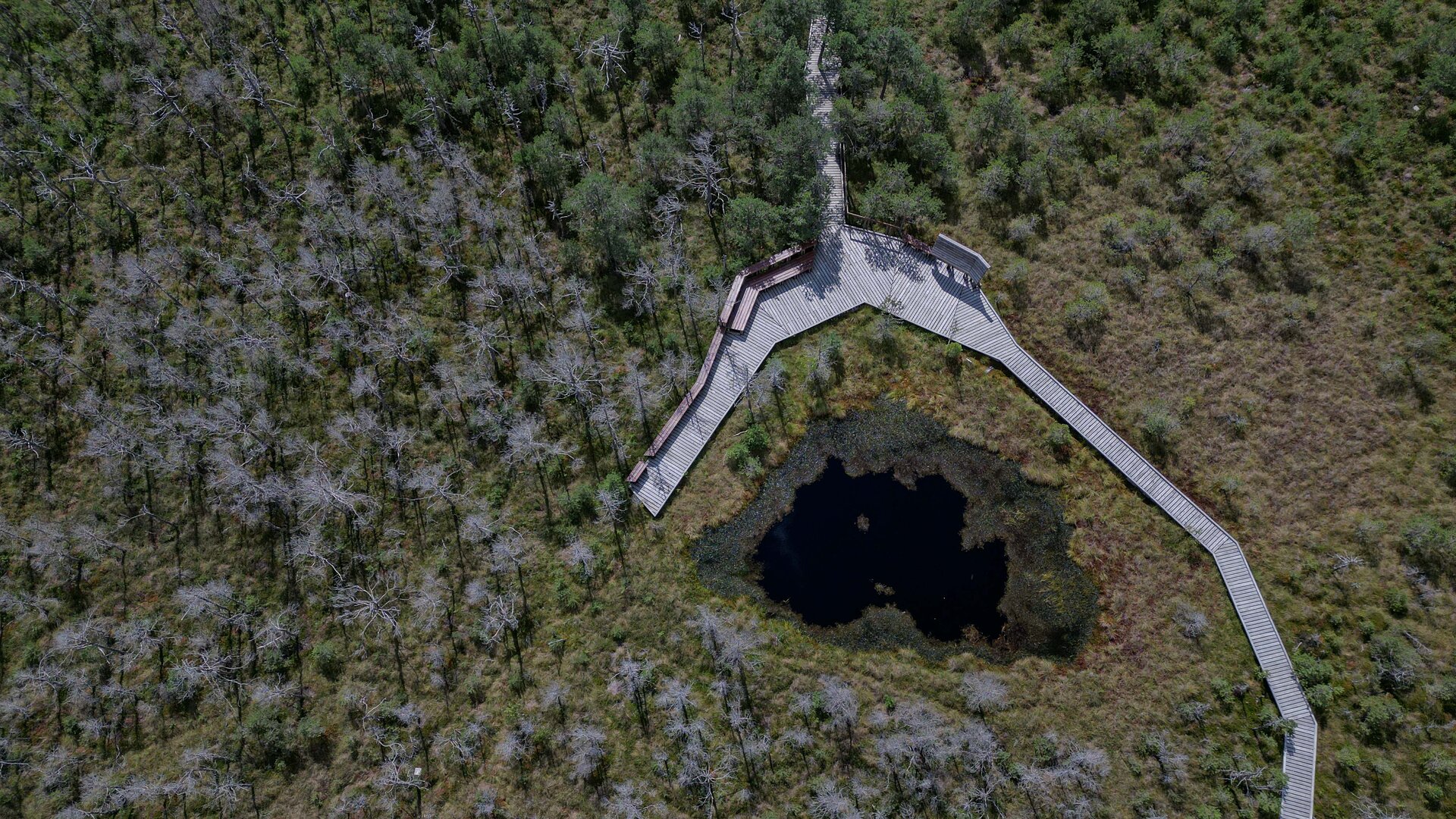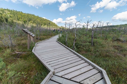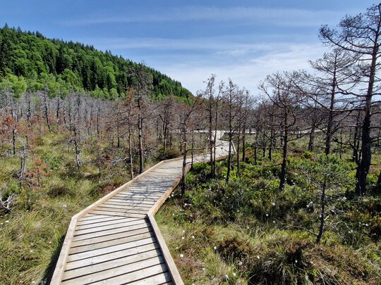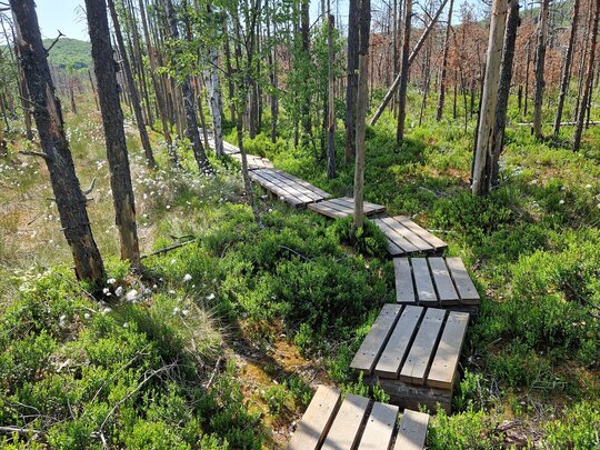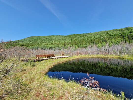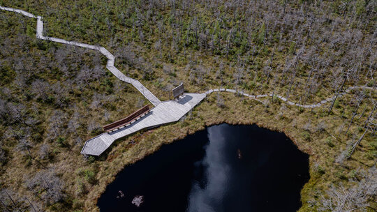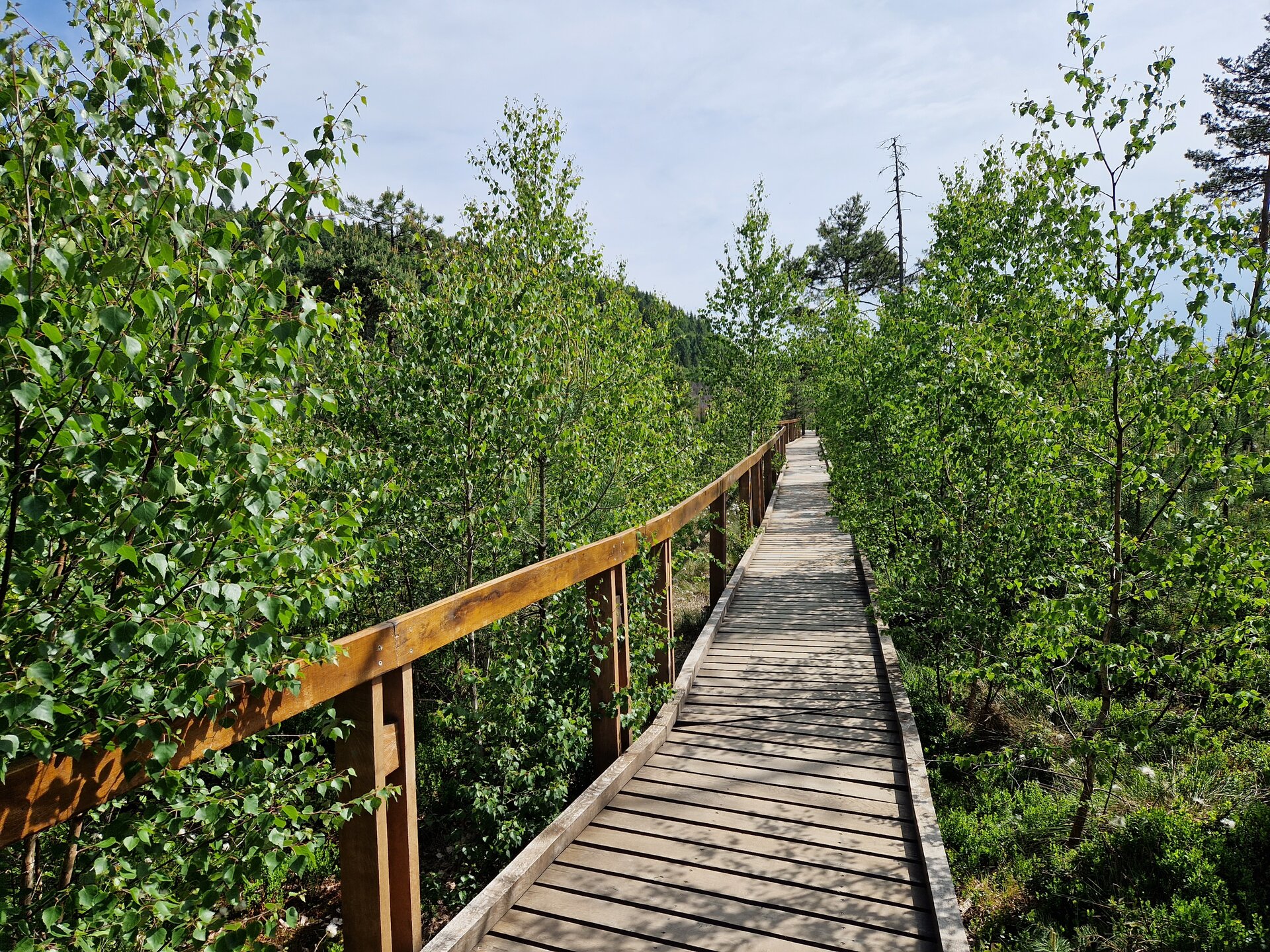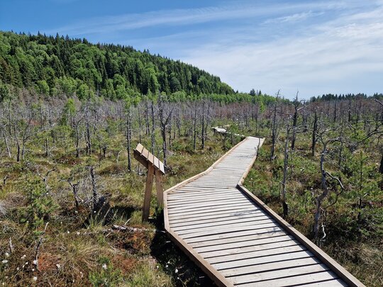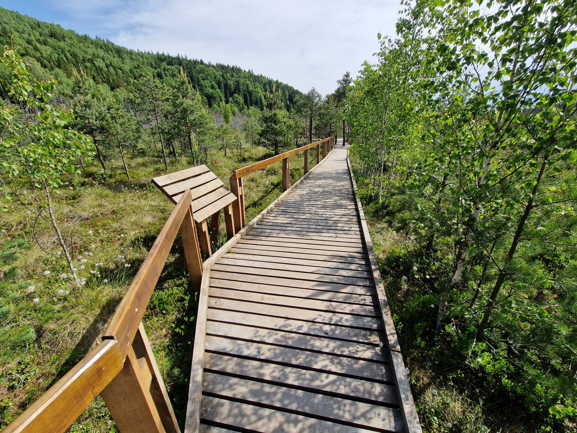 În locul unei poteci simpliste existente din lemn de brad, proiectul și-a propus impunerea unui concept nou, integrat activității specific ecoturistice. Traseul leagă patru puncte de referință, fiecare amenajat special, unic: zona de intrare unde se adună turiștii și se face o prezentare generală a sitului, cele două lacuri vizitabile din tinov, și zona de ieșire unde se trag concluziile în urma celor văzute. Între ele există trei segmente de poteci, diferite ca configurație, aspect, secțiune: prima o potecă mai amplă cu balustradă pe o parte, a doua mai puțin lată și fără balustradă, a treia din pontoane mici. Toate sunt fragmentate geometric, și se adaptează vegetației. De-a lungul traseului întâmpinăm perspective incitante, la fel și efecte de surpriză, generate de schimbările de direcție a traseului. Prin concepția ei, poteca se dizolvă treptat în tinov, în vegetație. Pe malul celor două lacuri, “ochiuri de apă” prezentate vizitatorilor dintre zecile din tinov, la prima s-a creat un ponton mai amplu, unde vizitatorii în grupuri mai ample se pot deplasa mai liber. La al doilea ponton s-a axat pe idea de liniște, contemplare, odihnă. Traseele și zonele amenajate ample sunt echipate pe-a locuri cu panouri de informare și locuri de șezut. Materialul folosit la amenajări a fost exclusiv lemnul de stejar, care rezistă în timp în acest mediu. Prin soluțiile aplicate persoanele cu handicap de locomoție au acces până la lacul al doilea.