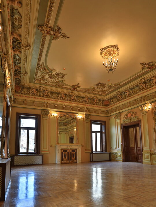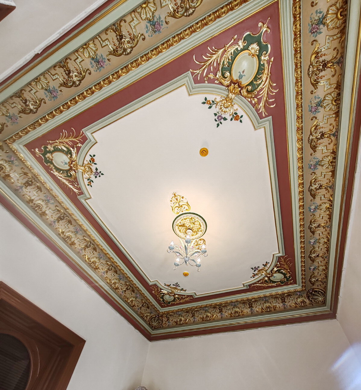 Încăperile au fost decorate cu elemente din repertoriul decorativ specific epocii, ornamente ce s-au păstrat în mare parte până în prezent, cu mici excepții. Se presupune că toate decorațiunile au fost realizate de artiști austrieci și italieni, având în vedere stilul acestora. Tavanele, decorate cu stucaturi policrome, au fost pictate în stil neoclasic, cu elemente aurite. Ușile au fost realizate din lemn masiv, cu sculpturi, iar vitraliile — în spiritul școlii românești — conțin motive geometrice și florale, toate părțile vitrate fiind din cristal gravat. Feroneria este realizată în stil baroc, iar decorația întregului edificiu cuprinde elemente artistice din marmură, stucaturi policrome, pictură maruflată, lemn sculptat și pictat, într-o cromatică aleasă, care conferă monumentalitate și rafinament, specifice interioarelor palatelor de la sfârșitul secolului al XIX-lea.