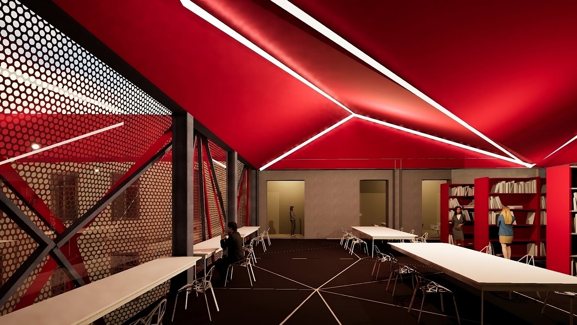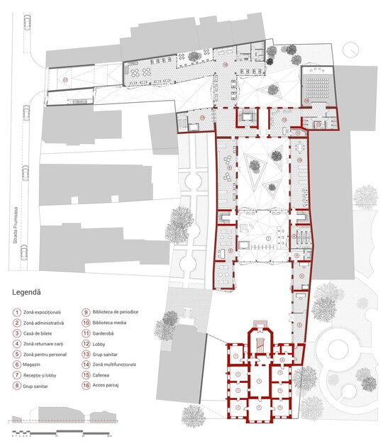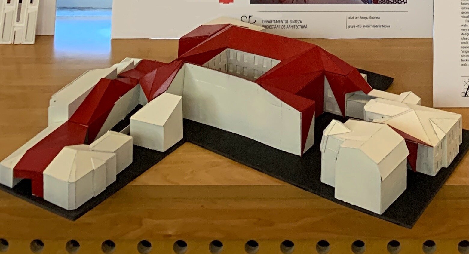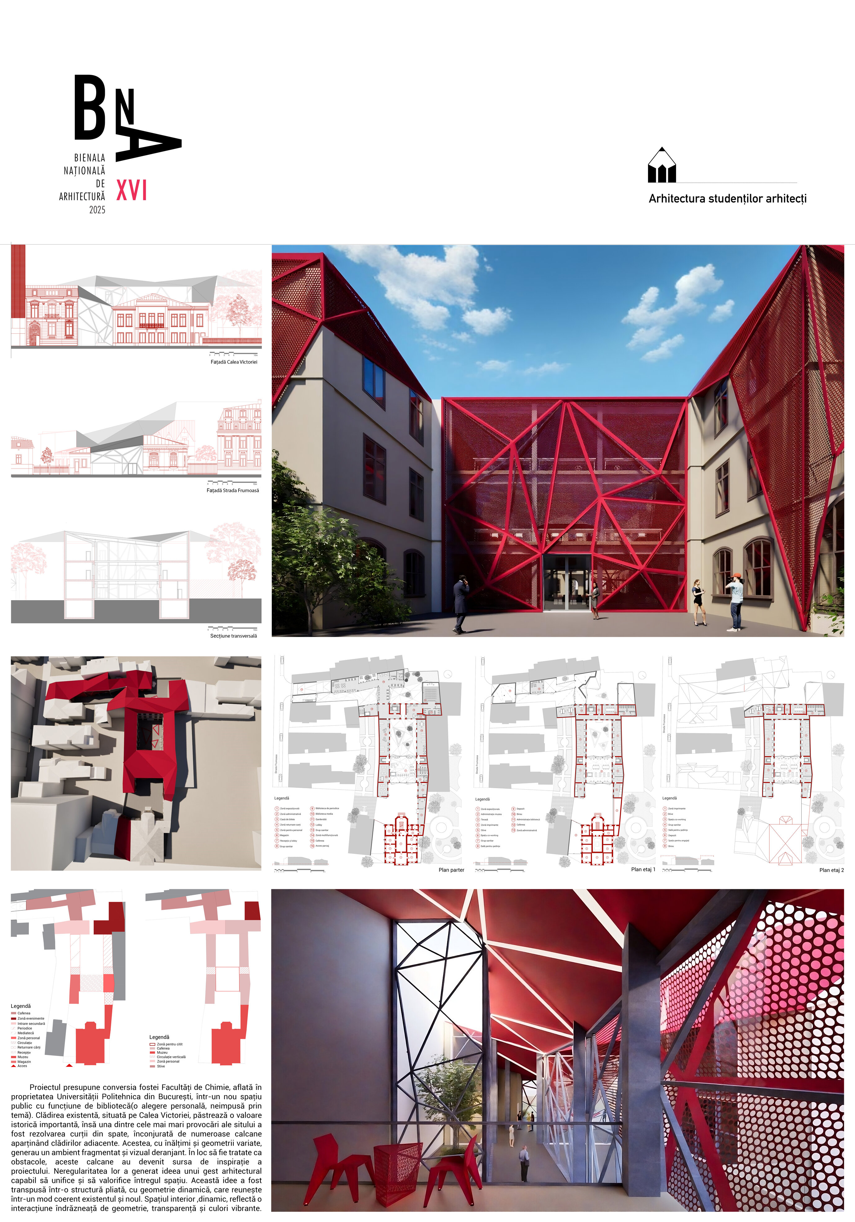 Proiectul propune conversia fostei Facultăți de Chimie, aflată în proprietatea Universității Politehnica din București, într-un spațiu public, cu funcțiune de bibliotecă(o alegere personală, neimpusă prin temă). Clădirea existentă, situată pe Calea Victoriei, păstrează o valoare istorică importantă, însă una dintre cele mai mari provocări ale sitului a fost rezolvarea curții din spate, înconjurată de numeroase calcane aparținând cladirilor adiacente. Acestea, cu înălțimi și geometrii variate, generau un ambient fragmentat și vizual deranjant. În loc să fie tratate ca obstacole, aceste calcane au devenit sursa de inspirație a proiectului. Neregularitatea lor a generat ideea unui gest arhitectural capabil să unifice și să valorifice întregul spațiu. Această idee a fost transpusă într-o structură pliata, cu geometrie dinamica, care reunește într-un mod coerent existentul si noul.