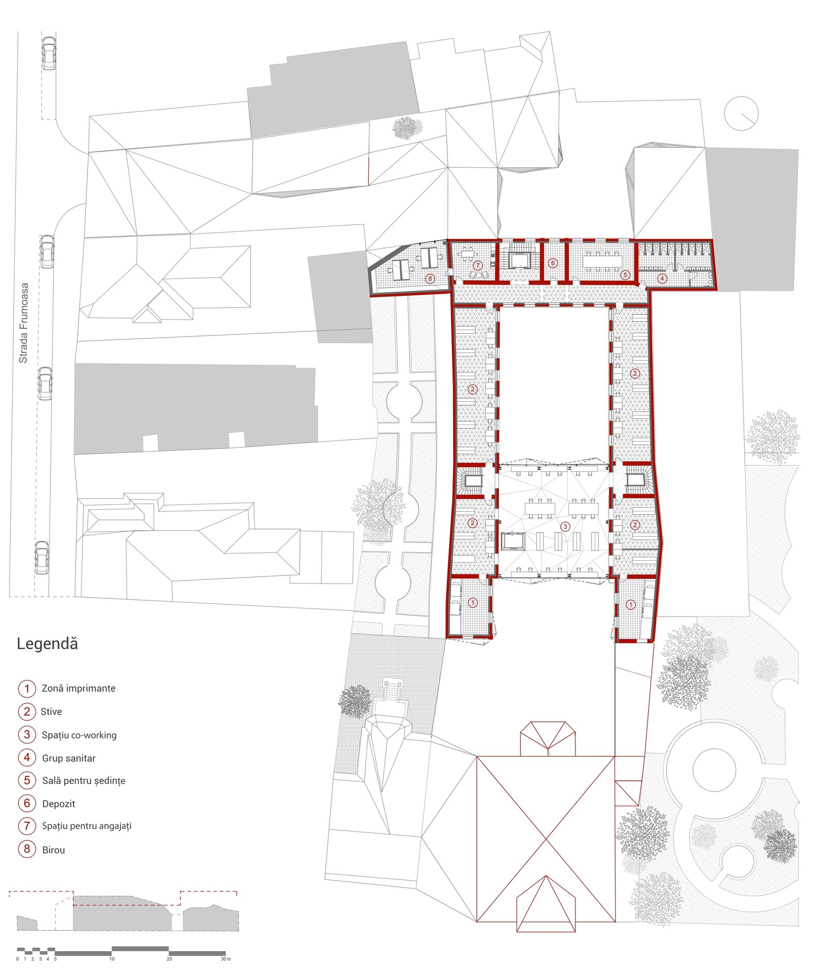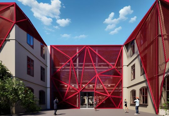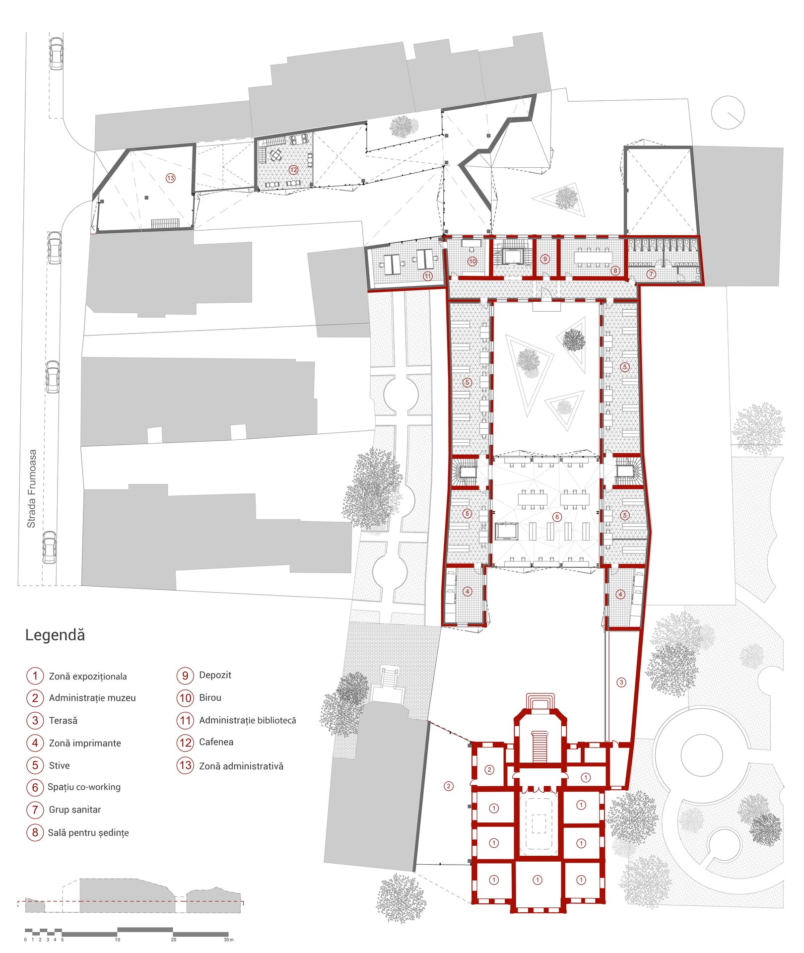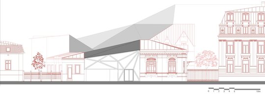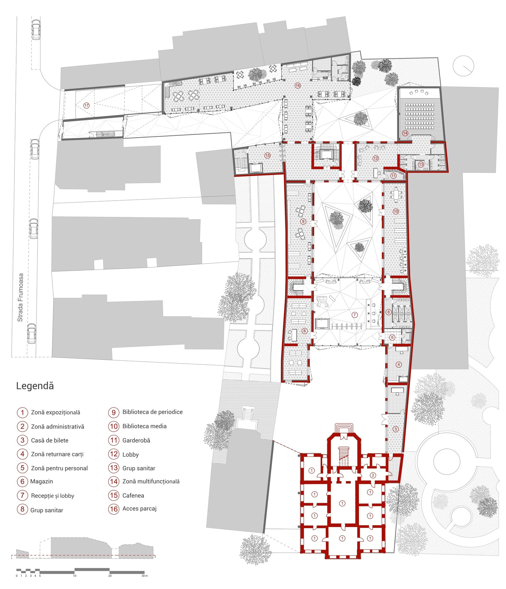 Proiectul propune conversia fostei Facultăți de Chimie, aflată în proprietatea Universității Politehnica din București, într-un spațiu public, cu funcțiune de bibliotecă(o alegere personală, neimpusă prin temă). Clădirea existentă, situată pe Calea Victoriei, păstrează o valoare istorică importantă, însă una dintre cele mai mari provocări ale sitului a fost rezolvarea curții din spate, înconjurată de numeroase calcane aparținând cladirilor adiacente. Acestea, cu înălțimi și geometrii variate, generau un ambient fragmentat și vizual deranjant. În loc să fie tratate ca obstacole, aceste calcane au devenit sursa de inspirație a proiectului. Neregularitatea lor a generat ideea unui gest arhitectural capabil să unifice și să valorifice întregul spațiu. Această idee a fost transpusă într-o structură pliata, cu geometrie dinamica, care reunește într-un mod coerent existentul si noul.