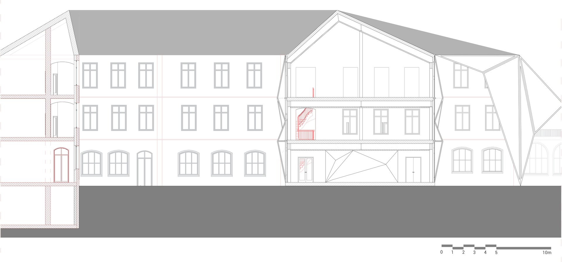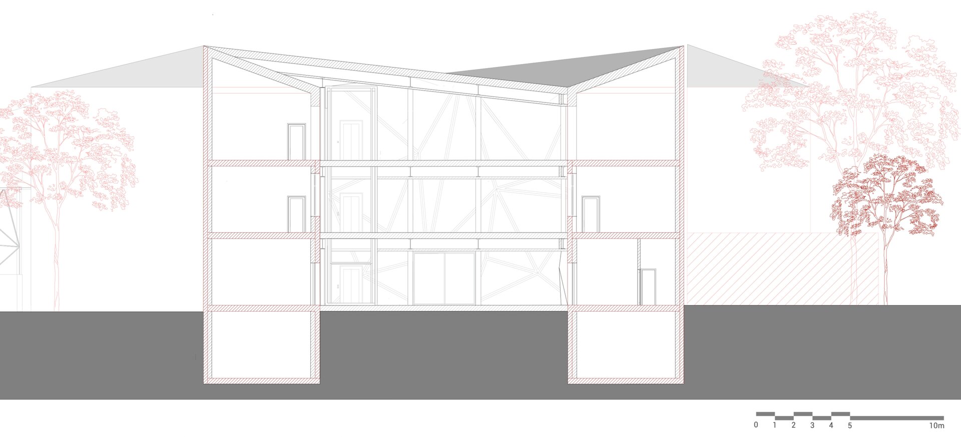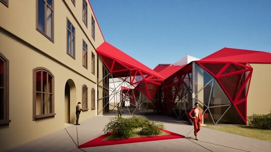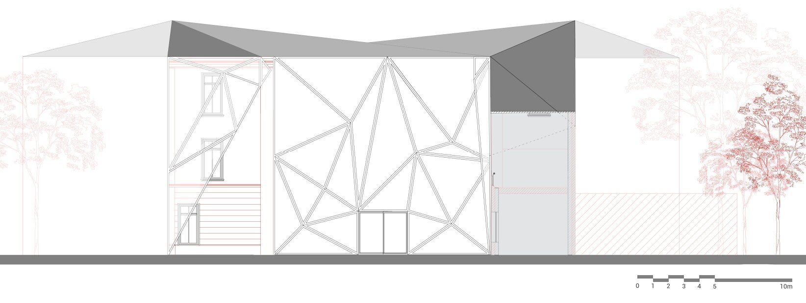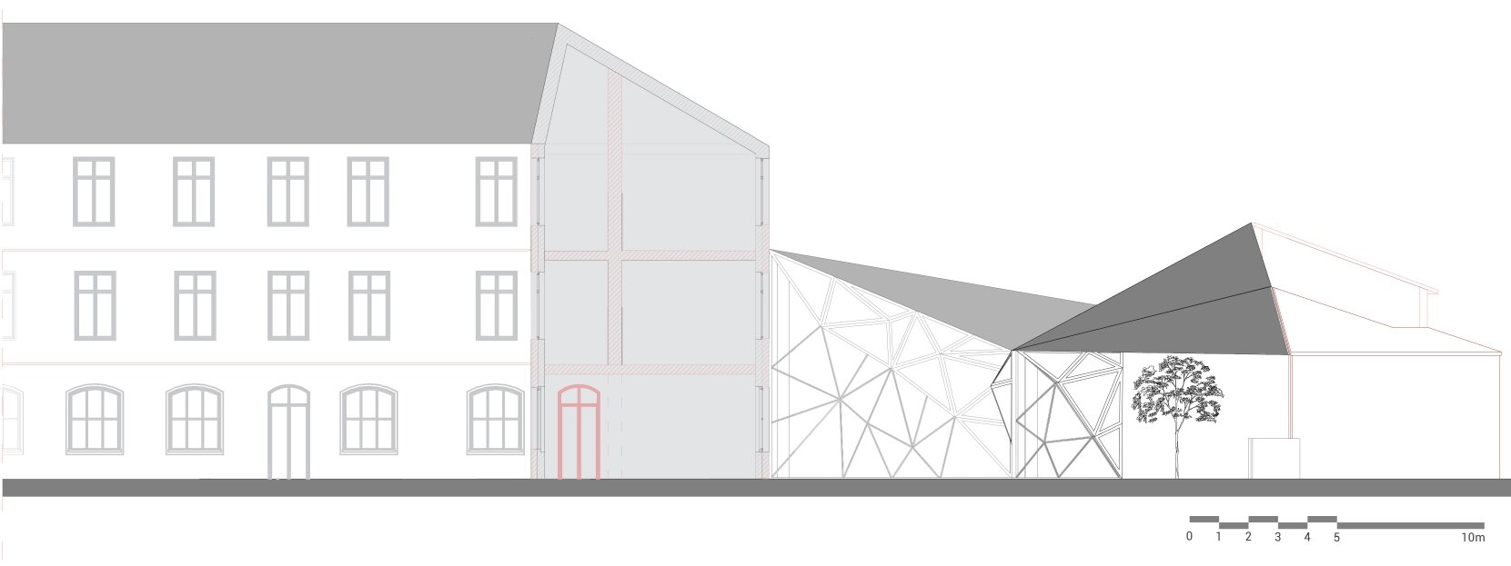 Proiectul propune conversia fostei Facultăți de Chimie, aflată în proprietatea Universității Politehnica din București, într-un spațiu public, cu funcțiune de bibliotecă(o alegere personală, neimpusă prin temă). Clădirea existentă, situată pe Calea Victoriei, păstrează o valoare istorică importantă, însă una dintre cele mai mari provocări ale sitului a fost rezolvarea curții din spate, înconjurată de numeroase calcane aparținând cladirilor adiacente. Acestea, cu înălțimi și geometrii variate, generau un ambient fragmentat și vizual deranjant. În loc să fie tratate ca obstacole, aceste calcane au devenit sursa de inspirație a proiectului. Neregularitatea lor a generat ideea unui gest arhitectural capabil să unifice și să valorifice întregul spațiu. Această idee a fost transpusă într-o structură pliata, cu geometrie dinamica, care reunește într-un mod coerent existentul si noul.