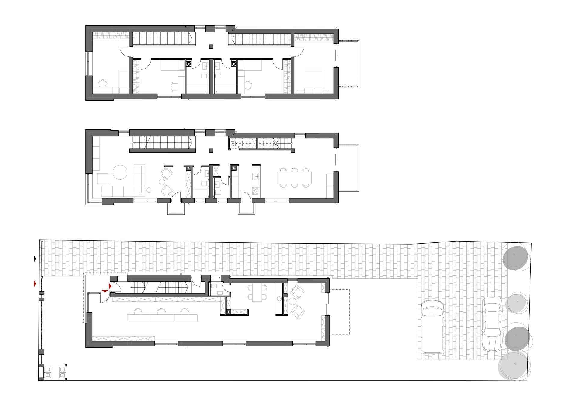 Parterul clădirii are un acces dedicat ceea ce permite utilizarea independentă a spațiului, ca home office (inițial) sau ca un apartament (mai târziu). Etajul accesat printr-o scară închisă are posibilitatea de a fi utilizat ca un singur apartament împreună cu mansarda, sau poate fi divizat după mai multe scenarii. Fie se delimitează un mic apartament pe jumătate din suprafață, iar cealaltă jumătate împreună cu mansarda formează o unitate locativă, fie se formează două apartamente în oglindă desfășurate pe două niveluri.