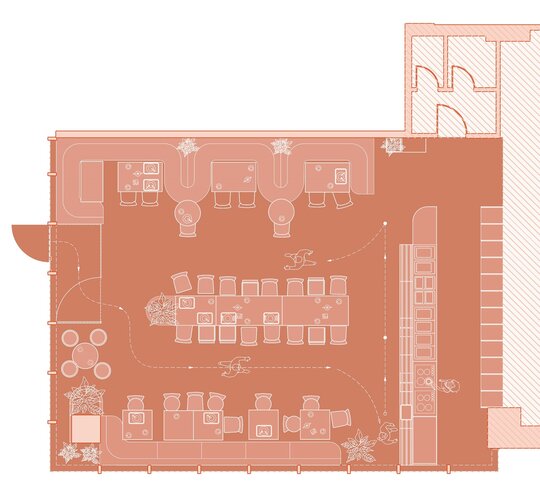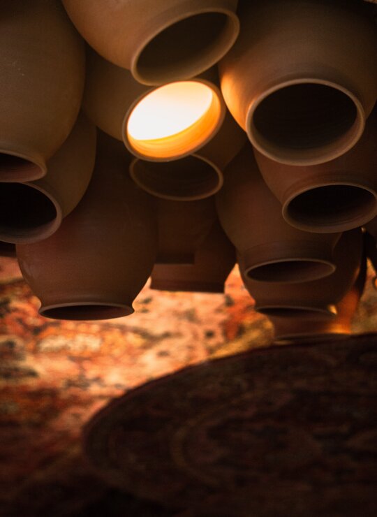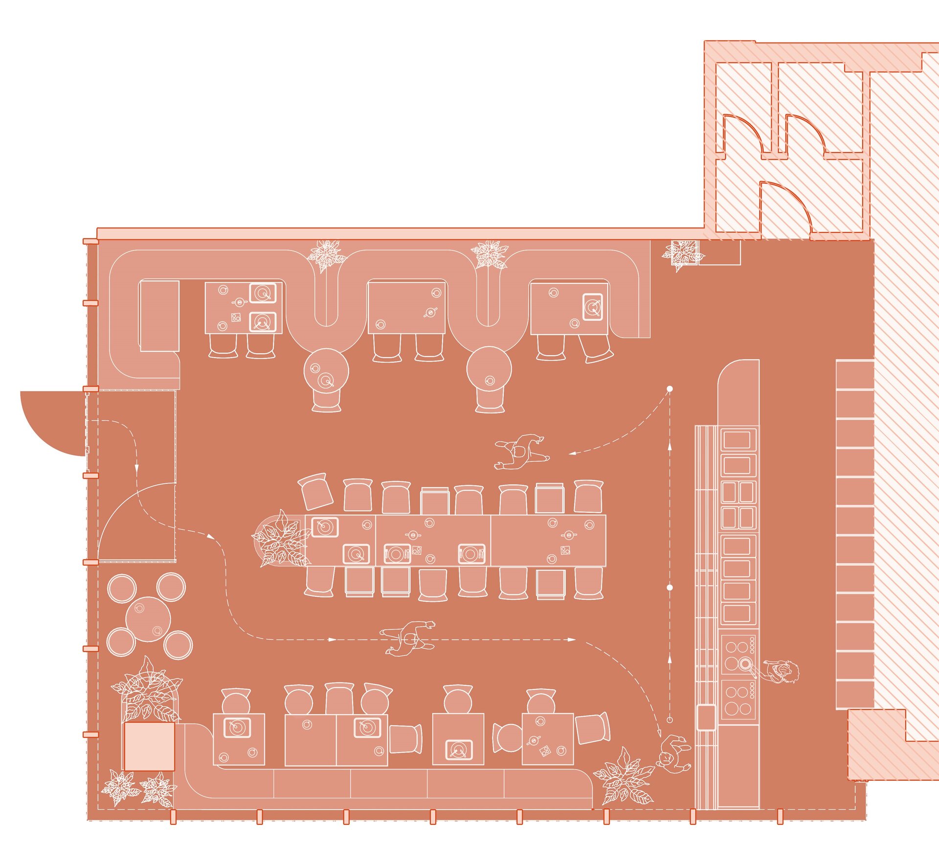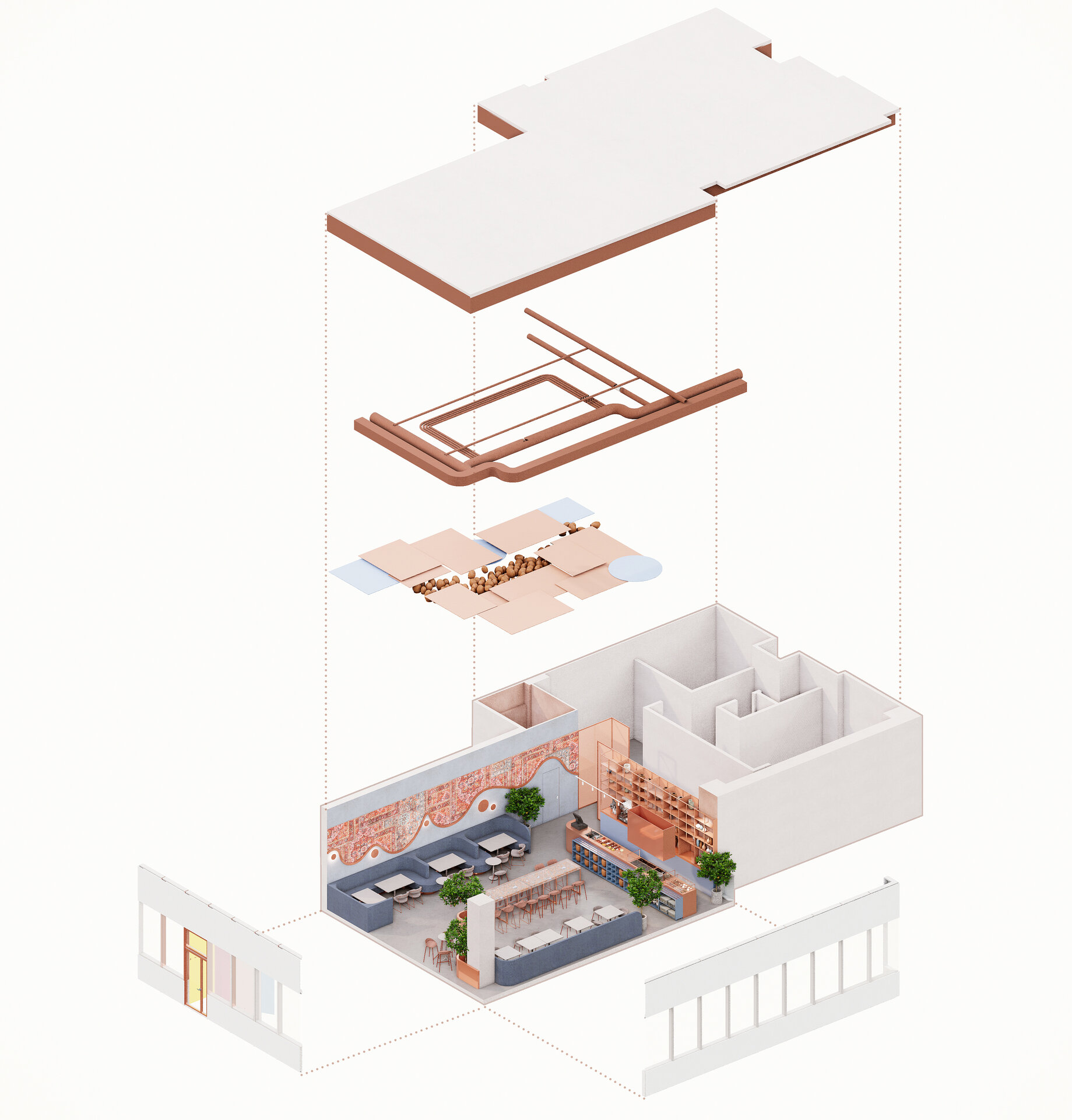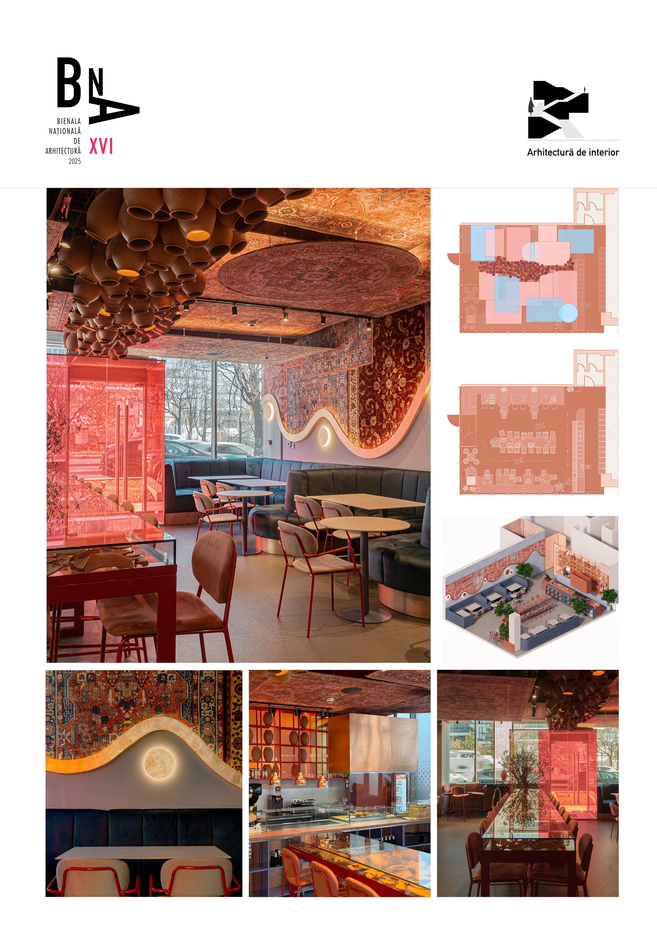 Corpurile de iluminat realizate din vase ceramice suspendate creează un joc subtil de umbre și lumini, evocând tema gastronomică a spațiului. Planimetria este simplă și liniară, împărțind spațiul în două zone: zona de luat masa și cantina retro-bar.
