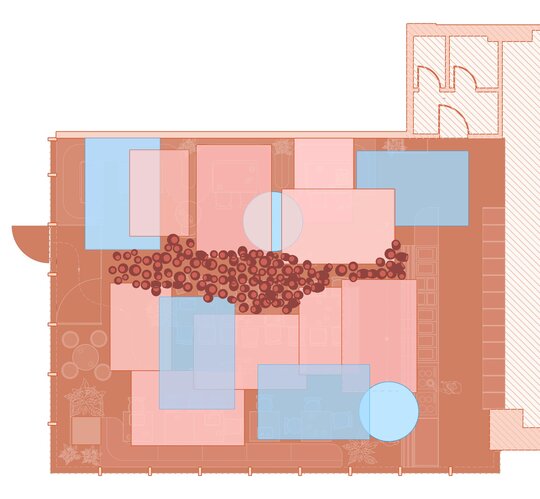 Liniile curbe, regăsite în conturul peretelui și în forma canapelelor, aduc echilibru și mișcare organică, contrabalansând geometria riguroasă a meselor și a planului.