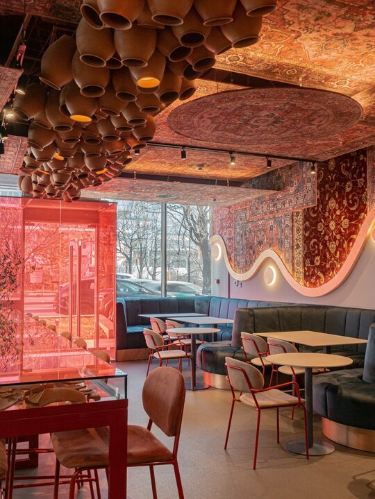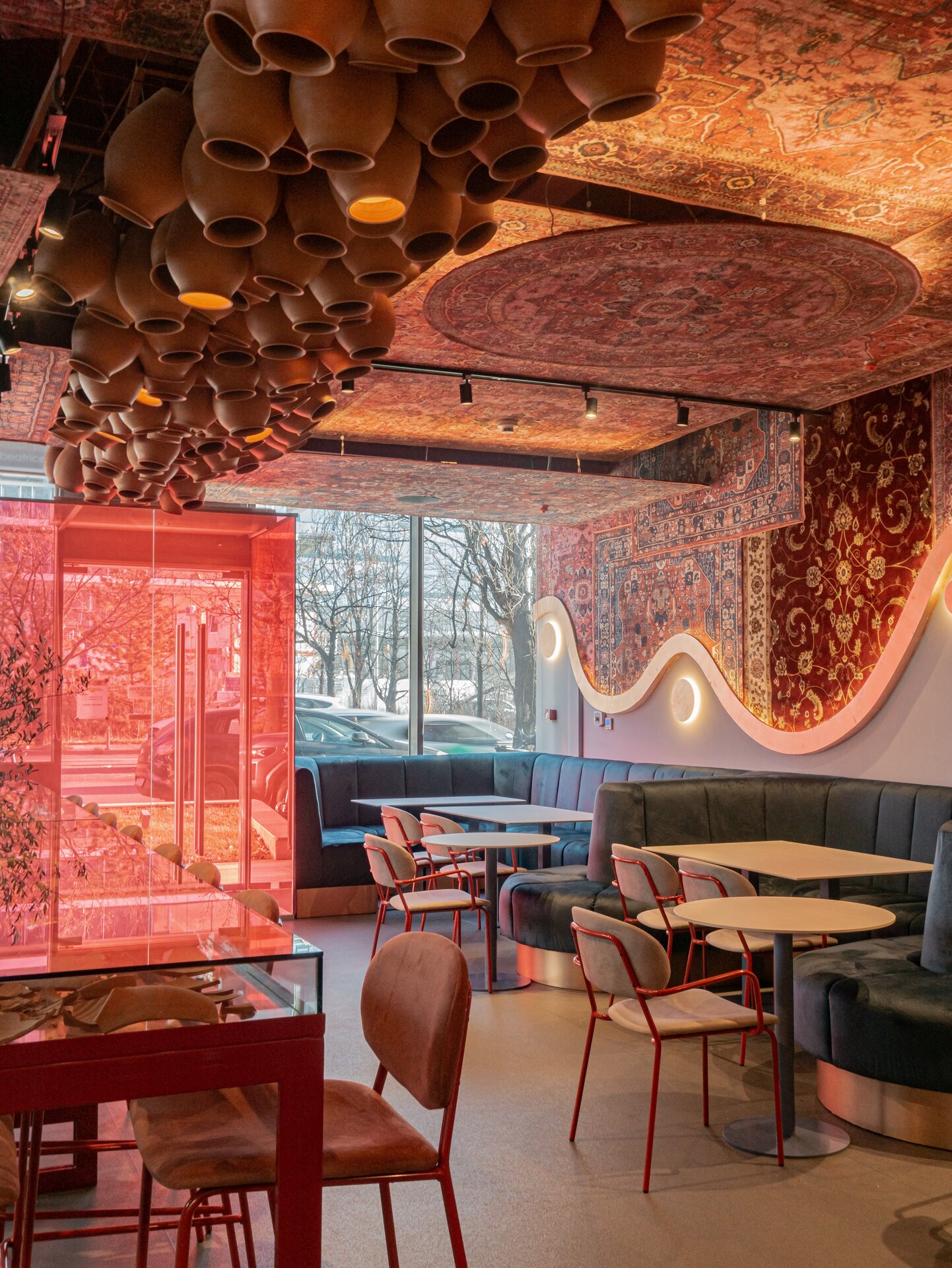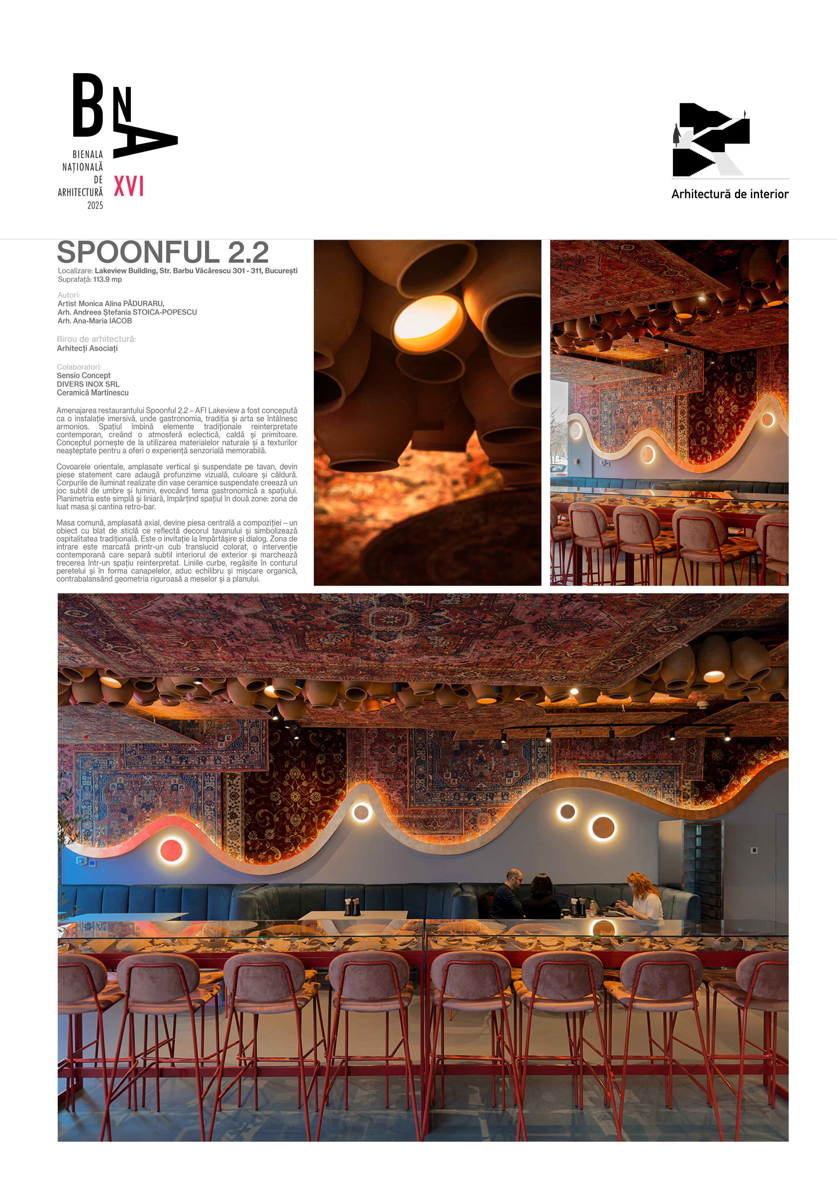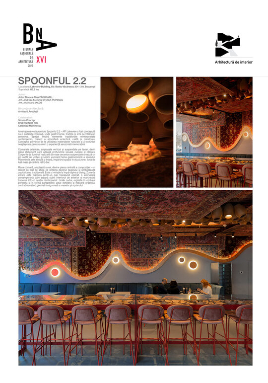 Amenajarea restaurantului Spoonful 2.2 – AFI Lakeview a fost concepută ca o instalație imersivă, unde gastronomia, tradiția și arta se întâlnesc armonios. Spațiul îmbină elemente tradiționale reinterpretate contemporan, creând o atmosferă eclectică, caldă și primitoare.