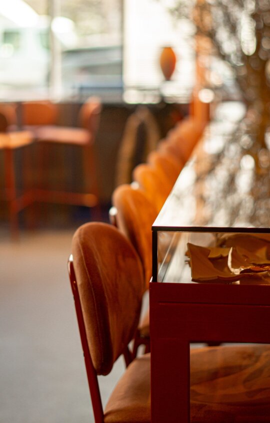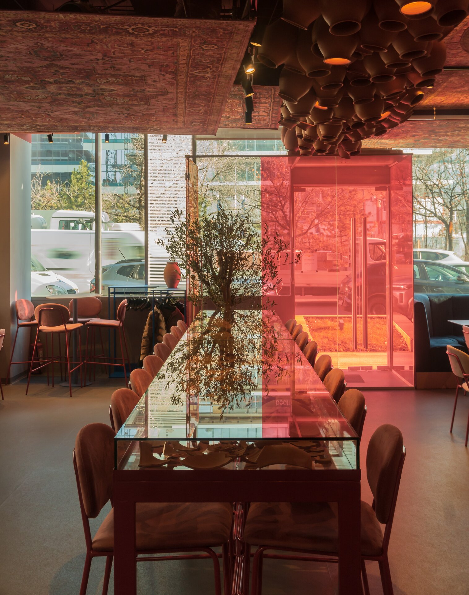Masa comună, amplasată axial, devine piesa centrală a compoziției – un obiect cu blat de sticlă ce reflectă decorul tavanului și simbolizează ospitalitatea tradițională. Este o invitație la împărtășire și dialog.