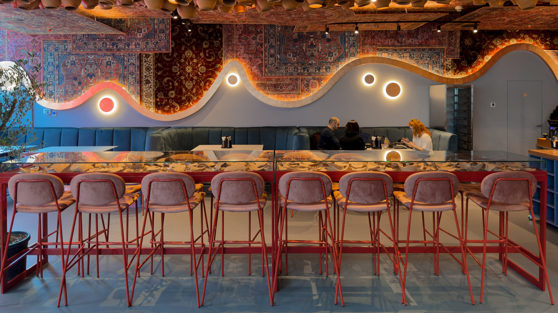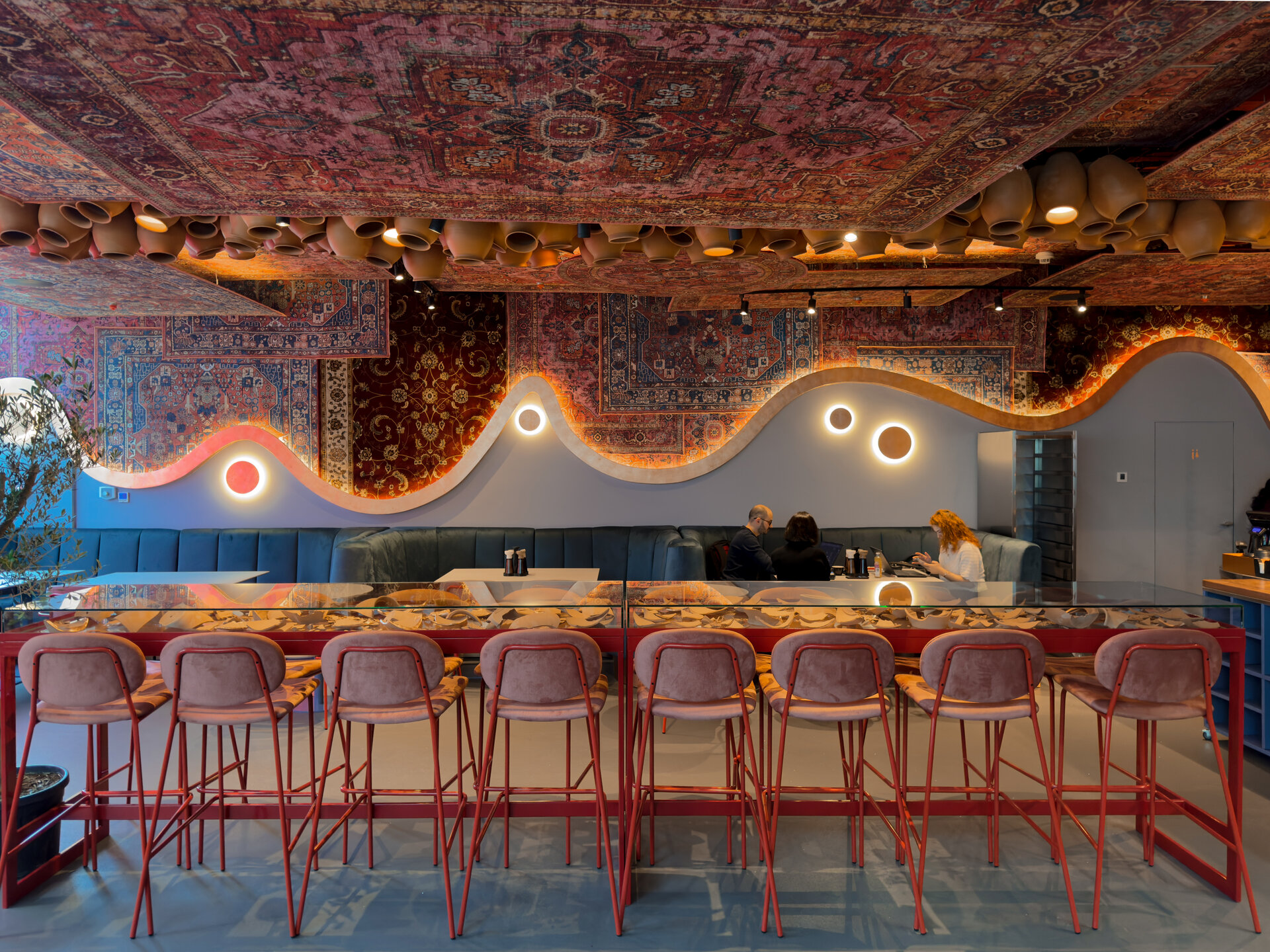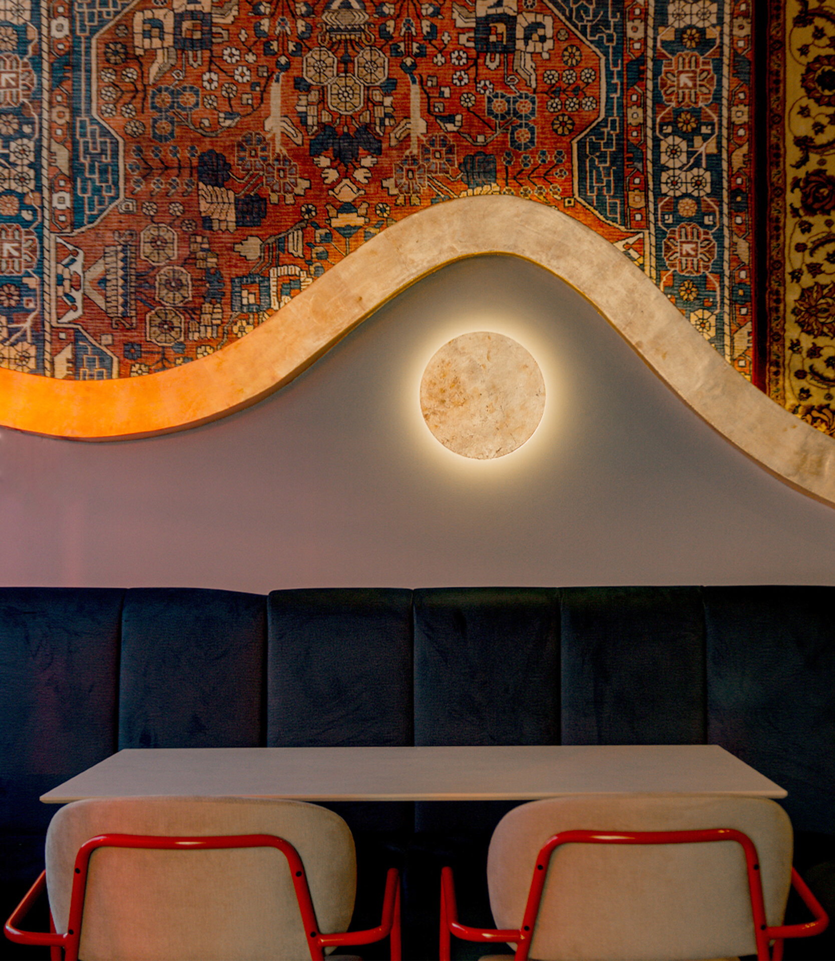 Covoarele orientale, amplasate vertical și suspendate pe tavan, devin piese statement care adaugă profunzime vizuală, culoare și căldură.