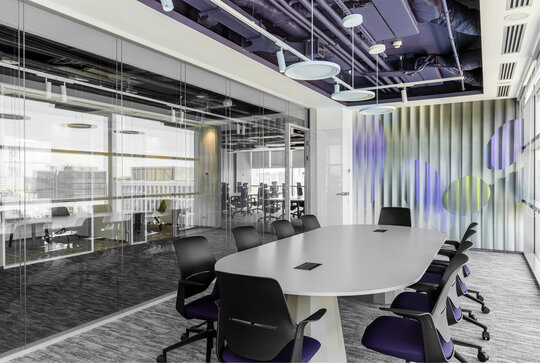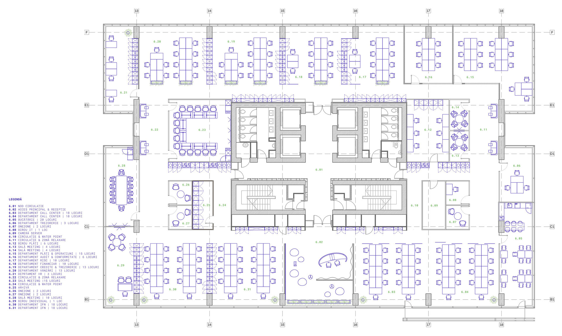 Proiectul propune o configurație deschisă, cu zone distribuite atent în funcție de specificul fiecărui departament și de modul de cooperare între acestea, alături de săli de întâlnire de dimensiuni variate. Suprafața totală amenajată este de 1136 mp, acomodând 158 de posturi de lucru, cu posibilitate de expansiune a echipelor în viitor.