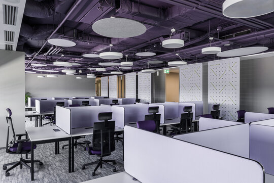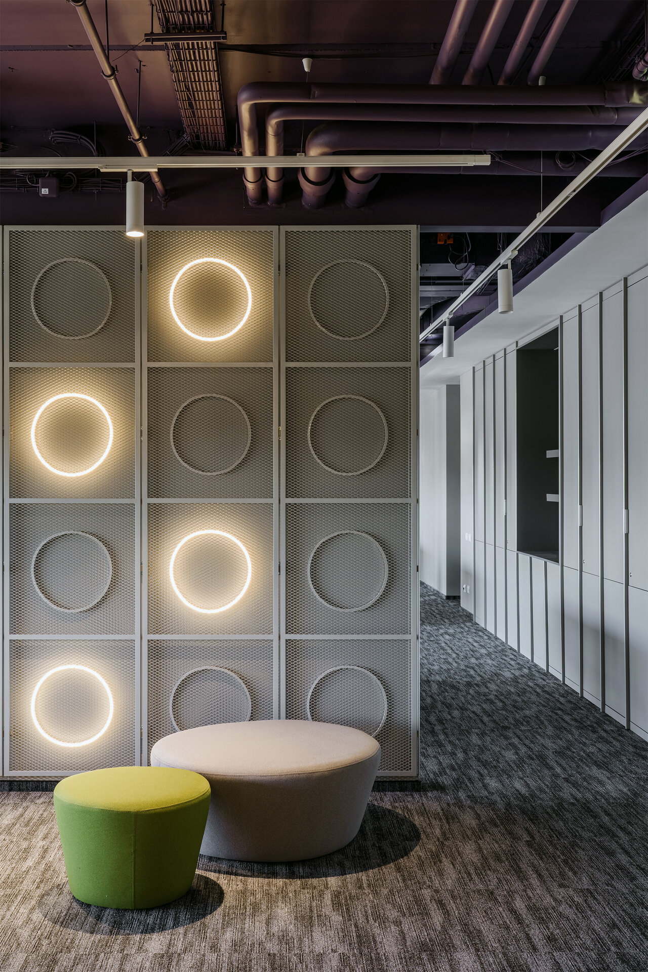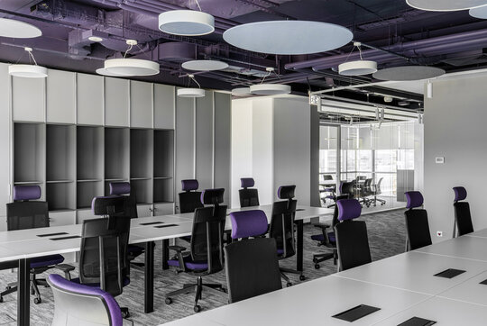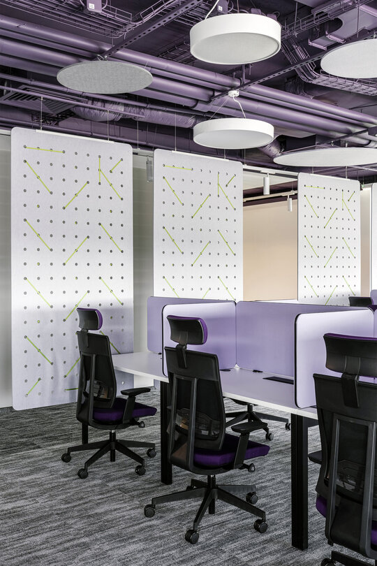 Integrarea elementelor de branding a jucat un rol esențial, iar prin paleta cromatică a plafonului tehnic și a mobilierului, completate de accentele de verde, identitatea vizuală este asimilată în mod coerent. Forma corpurilor de iluminat și detaliile acustice circulare trimit, din nou, prin repetiție și proporție, la simbolistica monedei.