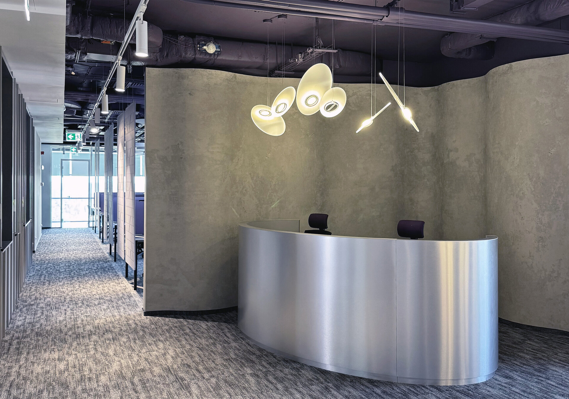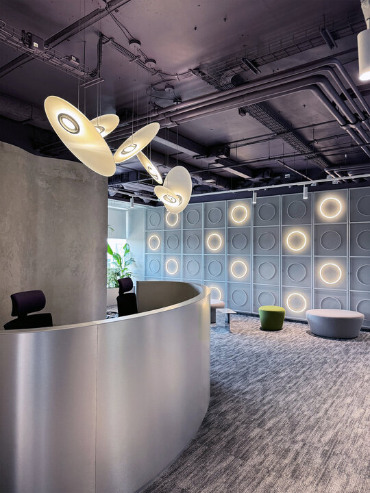 Zona de intrare devine reperul vizual al întregului etaj. Peretele curbat și recepția sunt o prezență fluidă, în timp ce suprafețele metalizate, reflexiile și repetiția cercului devin o metaforă pentru funcțiunea spațiului. Cercurile apar și în spatele panourior metalice, ca elemente luminoase ce dau ritm și profunzime zonei de așteptare.