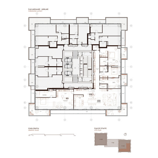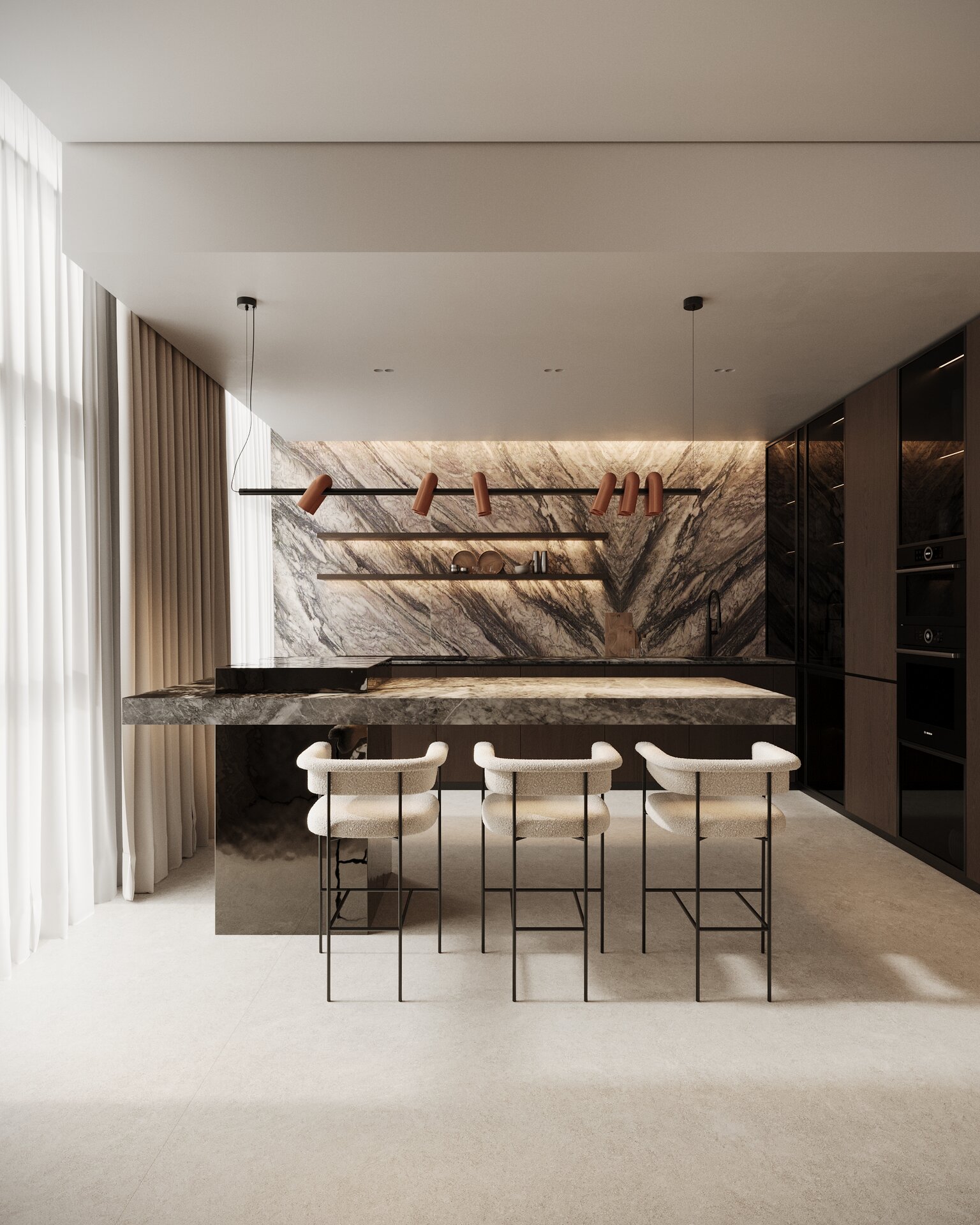 Materialitatea rezultă dintr-o selecție de texturi naturale, furnir de lemn, piatră și o paletă cromatică neutră, care susține coerența spațiului și pune în valoare relația dintre lumină, textură și proporție.