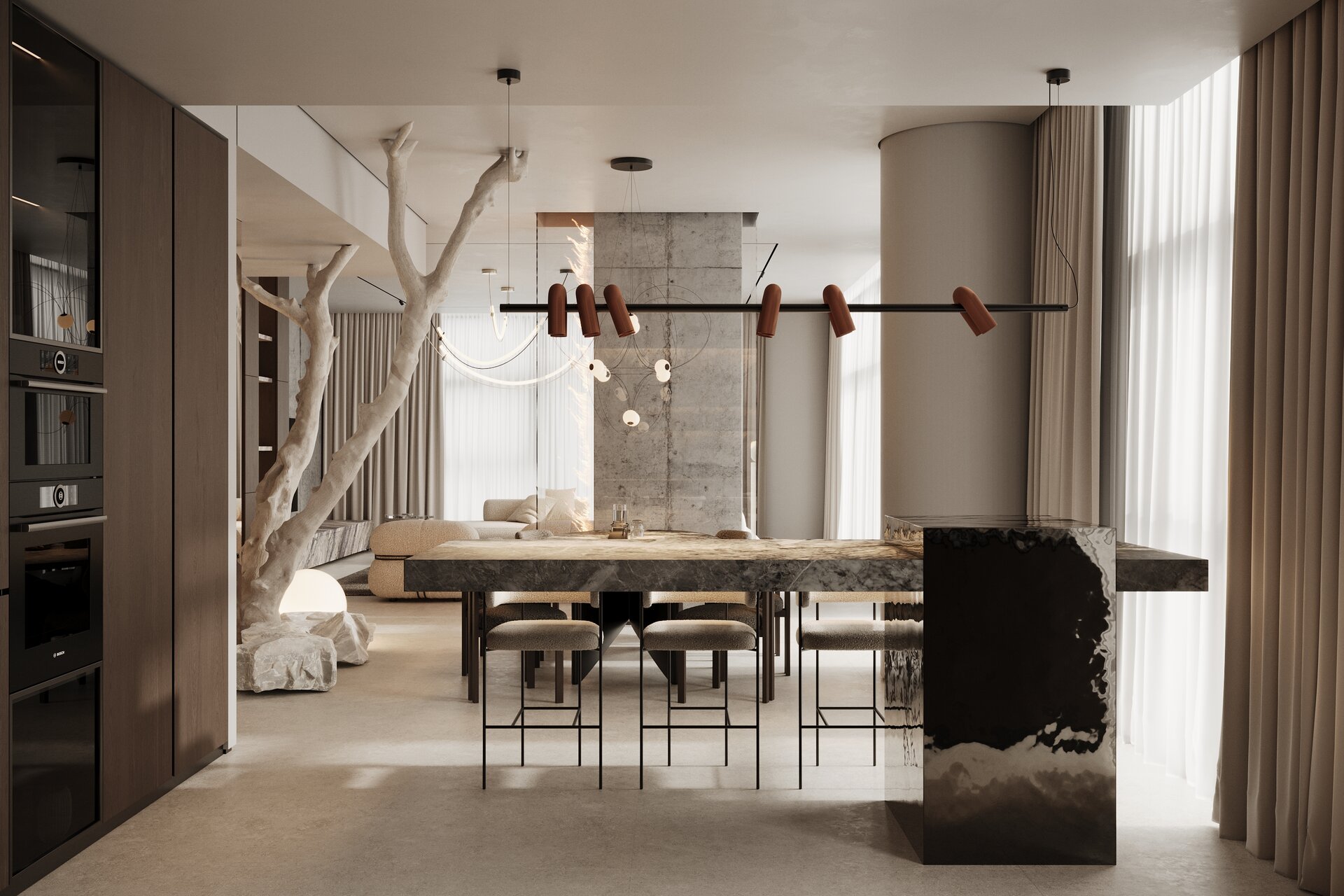Acest nucleu reunește living-ul, dining-ul și bucătăria într-o configurație deschisă, orientată spre sud, unde geometria liniară a mobilierului, accentele verticale și reinterpretările abstracte ale elementelor naturale generează o continuitate vizuală și materială.
