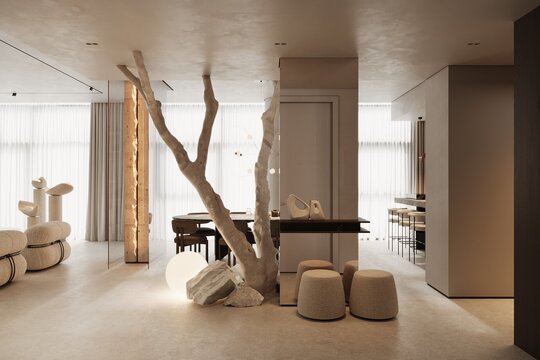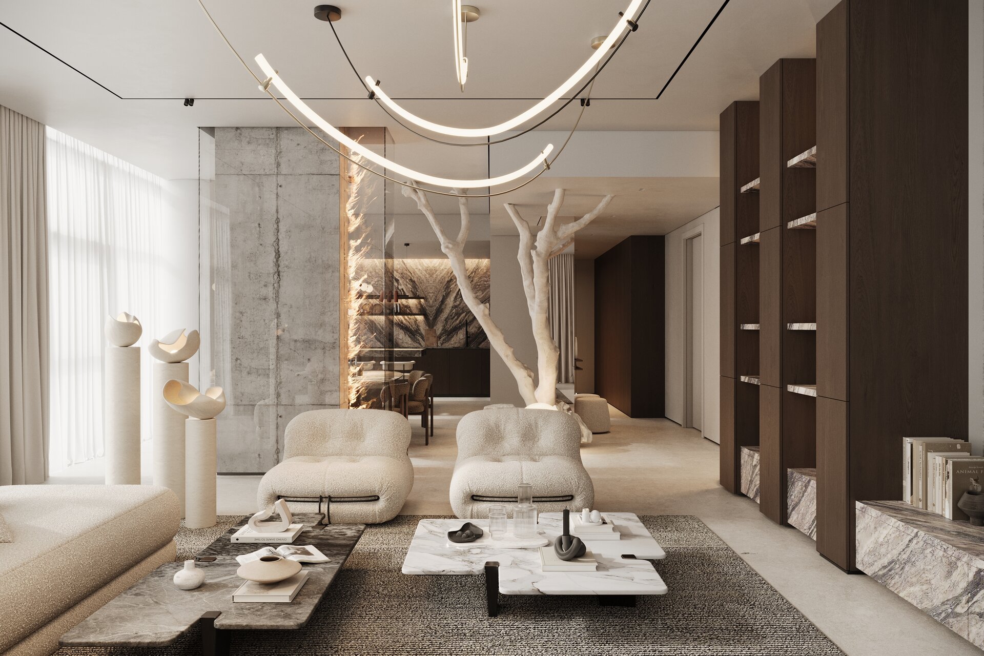 Elementul central din zona de zi funcționează ca un reper compozițional, evocând forme primare regăsite în natură. În jurul acestuia gravitează șemineul vertical, inserțiile minerale și corpurile de iluminat cu geometrii esențializate, toate contribuind la definirea unei atmosfere simbiotice, în care fiecare intervenție are un rol activ în configurarea spațiului.