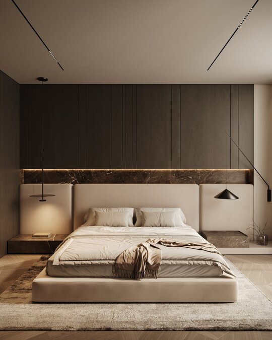 Cele două zone de noapte sunt articulate în jurul spațiului central. Dormitorul matrimonial, orientat spre sud-vest și deschis către lacul Floreasca, este configurat ca o zonă privată extinsă, cu o atmosferă caldă generată de placările din lemn și lumina difuză. Fluiditatea spațiului permite o tranziție subtilă de la dressing către o zonă de relaxare, delimitată de dormitor printr-un element vertical de separare, șemineul. A doua zonă de noapte, desfășurată longitudinal spre est, reunește trei dormitoare conectate printr-un hol-garderobă, care funcționează ca spațiu intermediar între funcțiuni.