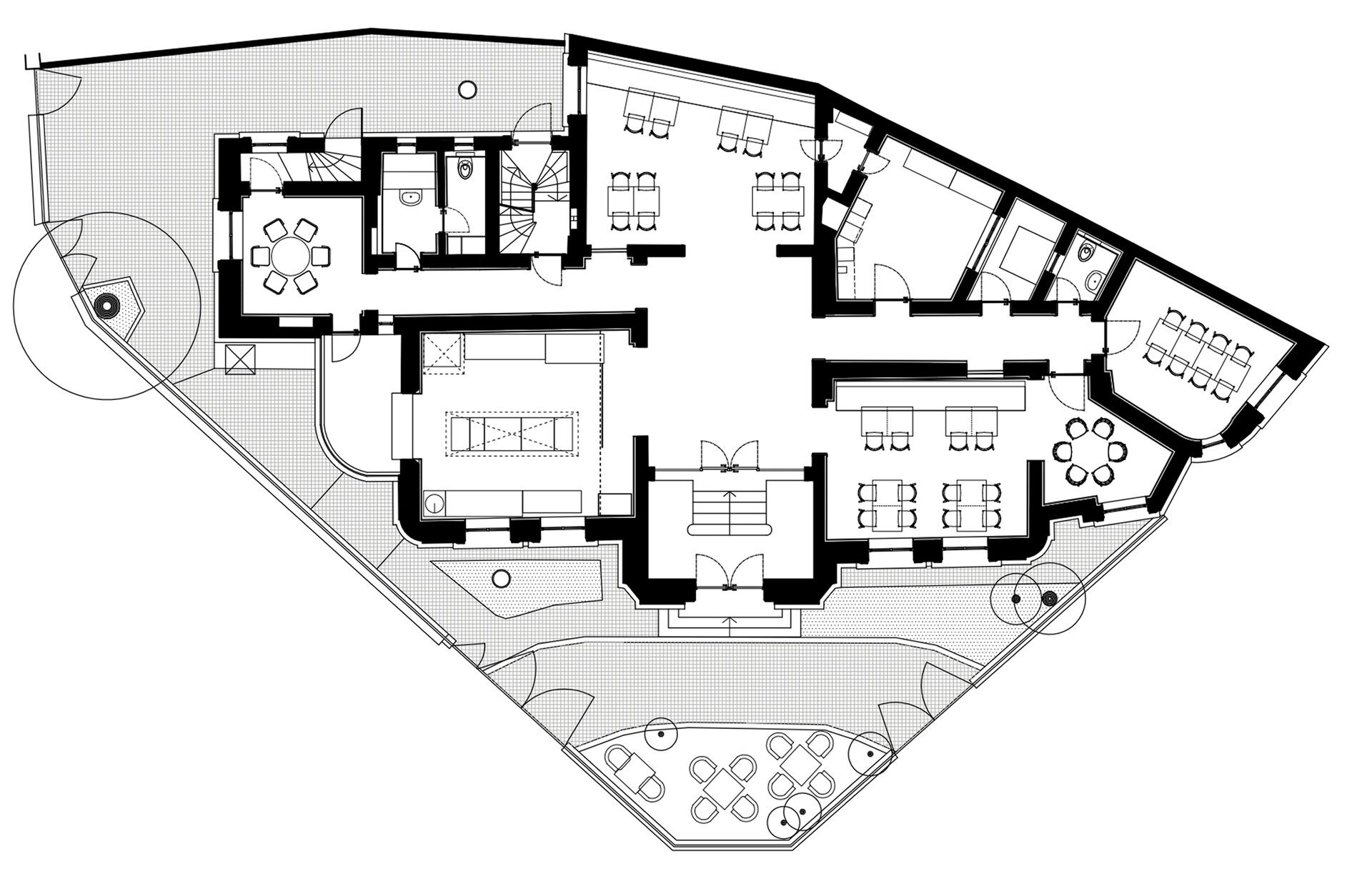 Un accent important al intervenției a fost pus pe recuperarea spațiilor reprezentative. Holul central, vestibulul și sufrageria, încăperi care păstrau fragmente de decorații, au fost restaurate și repuse în valoare ca noduri de memorie ale casei. Cromatica și detaliile au fost reconstituite pentru a păstra atmosfera epocii, integrând totodată soluții contemporane care să permită utilizarea clădirii într-un mod actual.