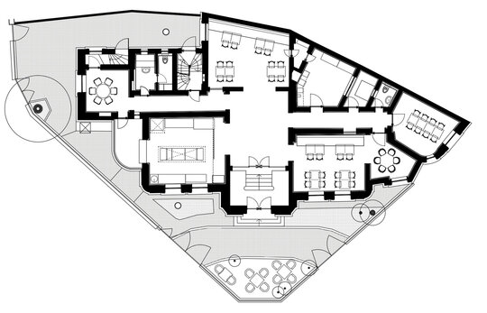 Parcela are o formă aproape triunghiulară, cu deschideri către strada Dianei, fapt care a determinat o configurație arhitecturală particulară. Clădirea ocupa mare parte din lot, fiind amplasată pe aliniament pe latura de sud-est, având o retragere minimă pe sud-vest, în timp ce pe latura nordică are calcane și o curte de lumină de mici dimensiuni spre vecinătăți.